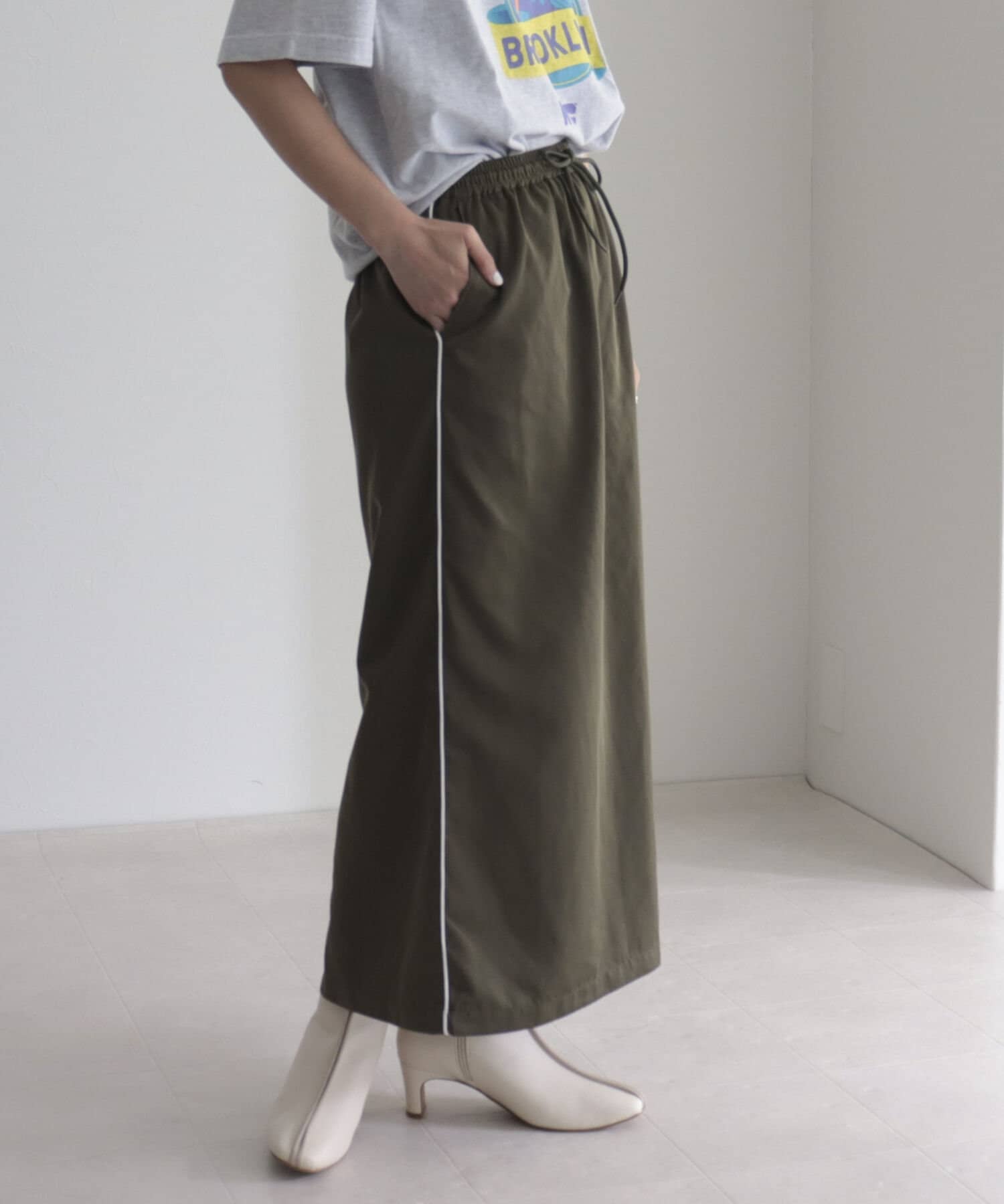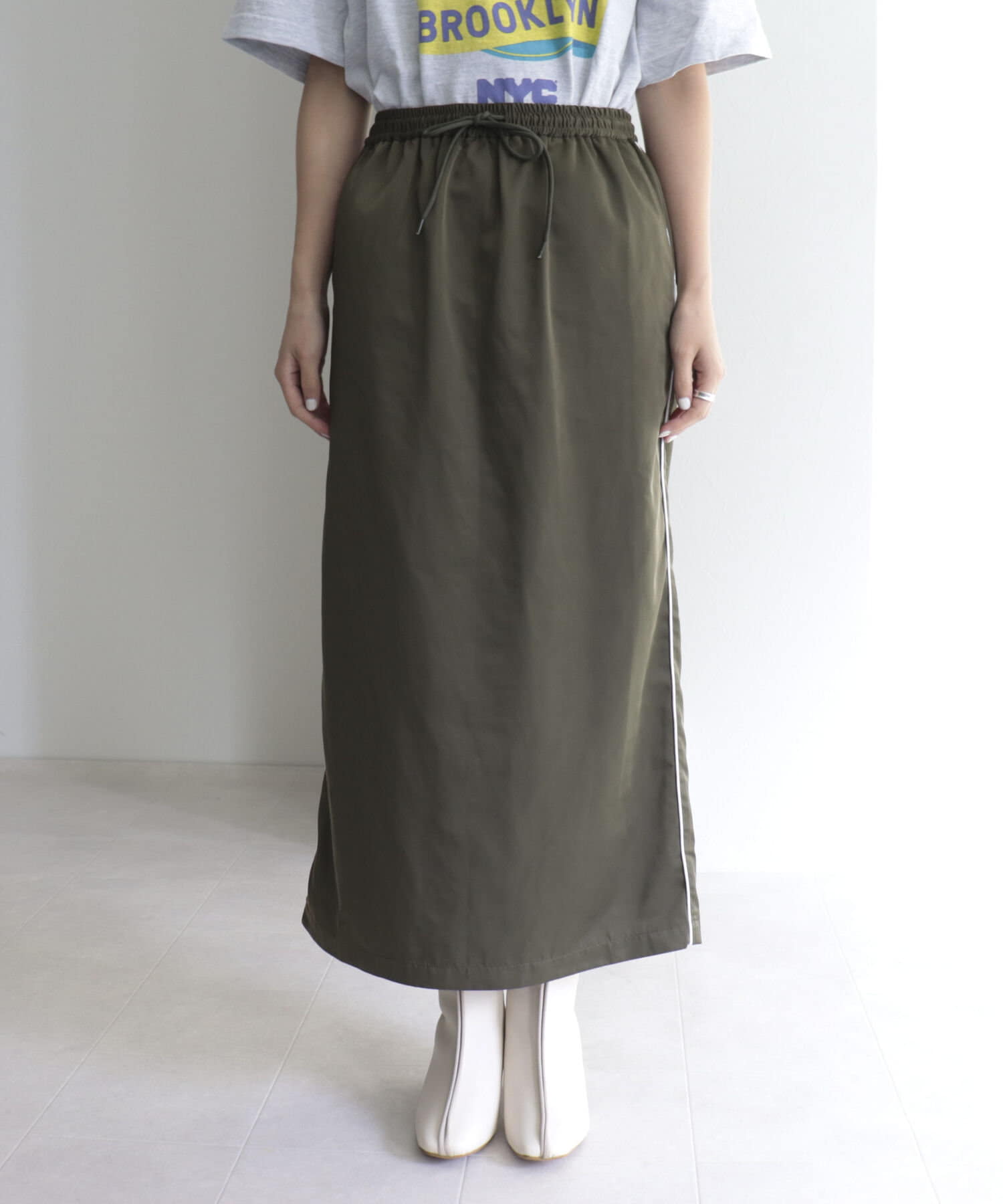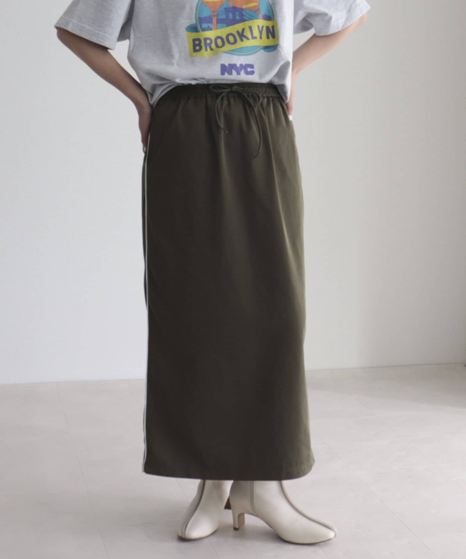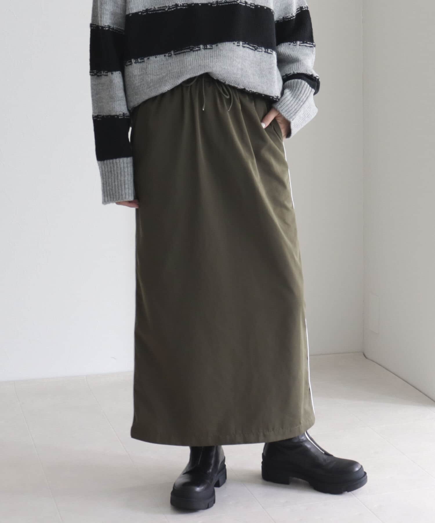 細めのサイドラインがカジュアルすぎないスカート