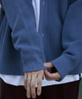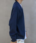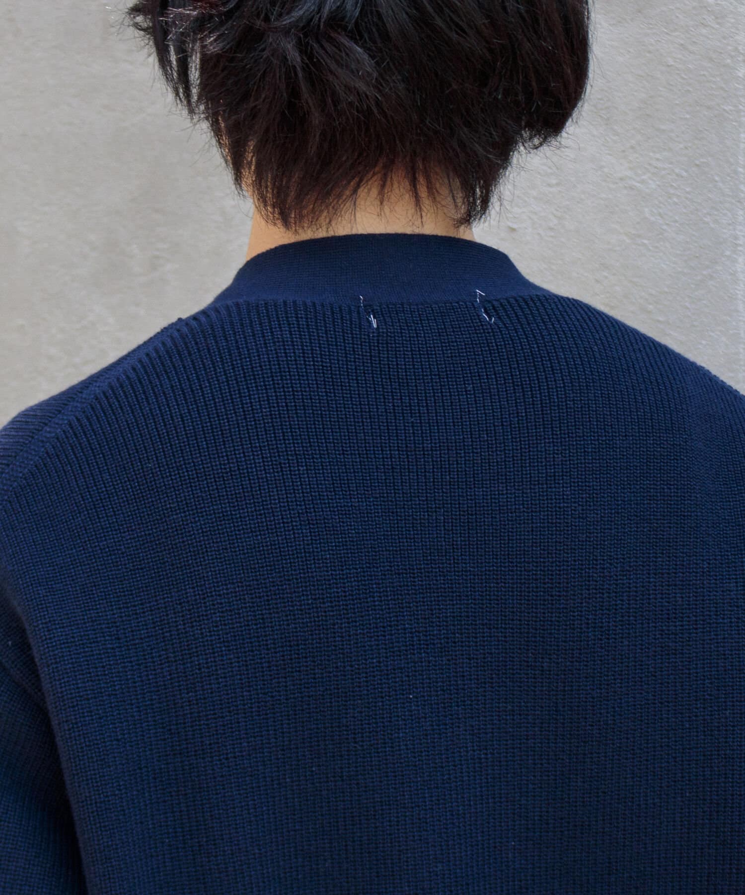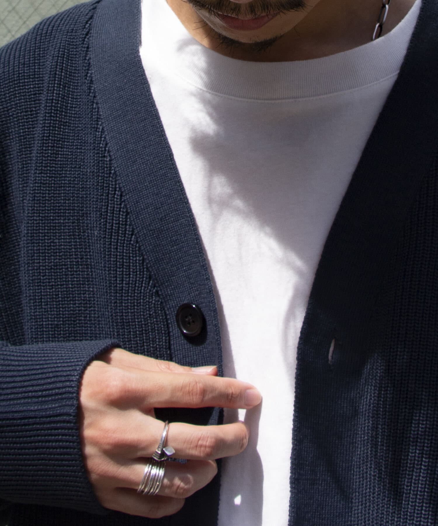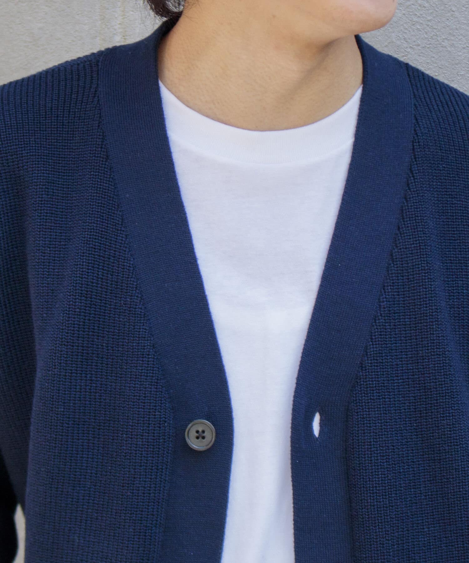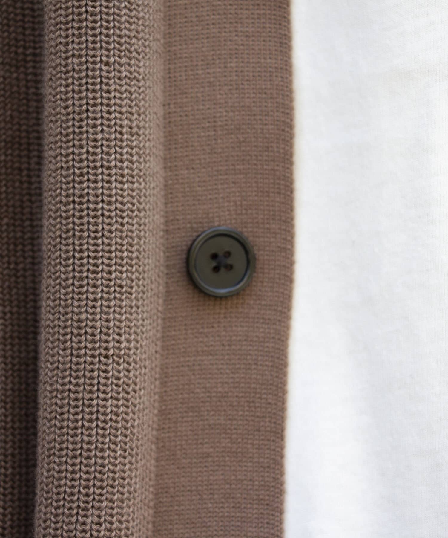 柔らかなタッチのポリエステル糸を3本取りのハイゲージで編み上げ、適度なハリと伸縮性を兼ね備えたニット生地を採用したロンT付きのカーディガン。
