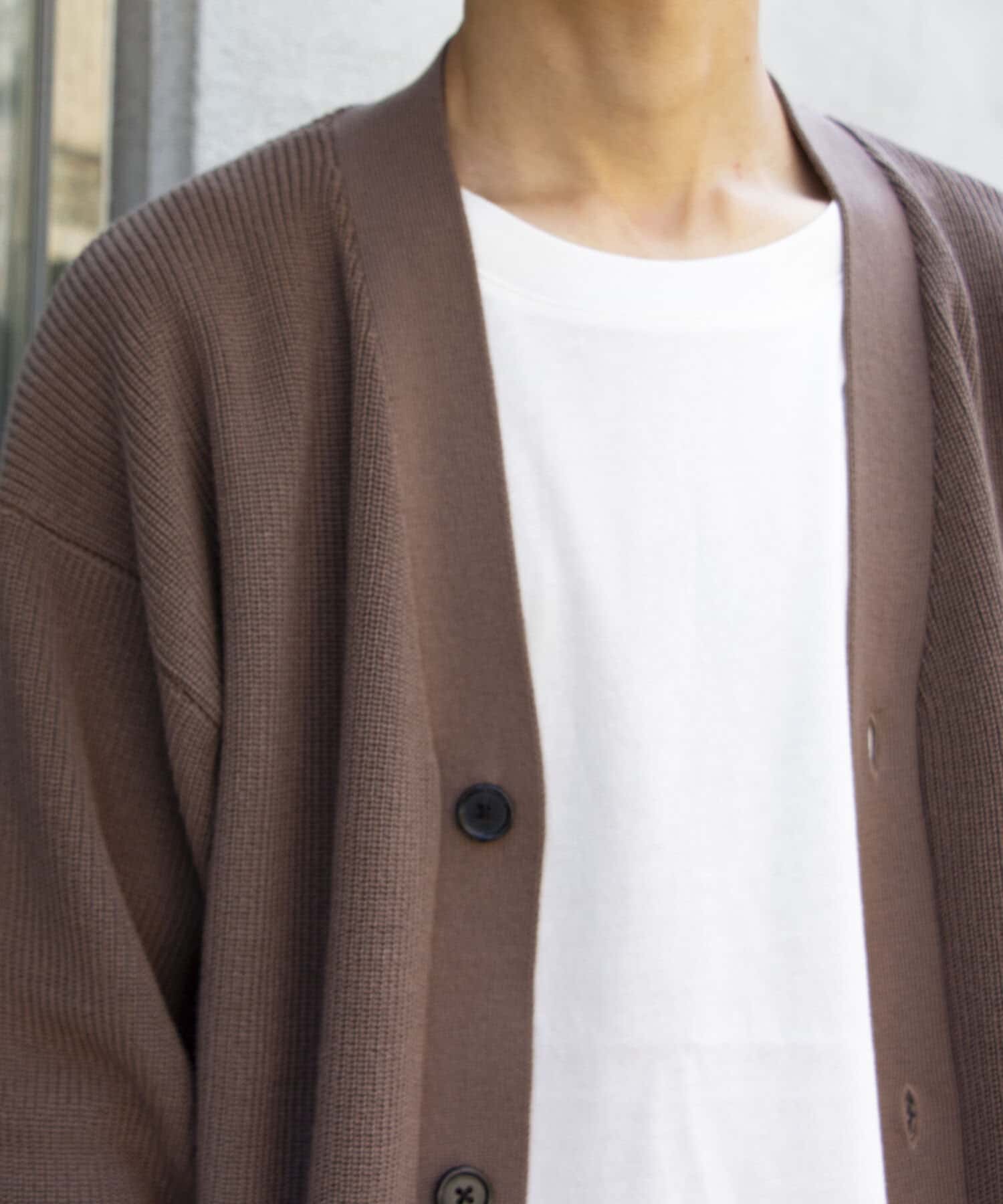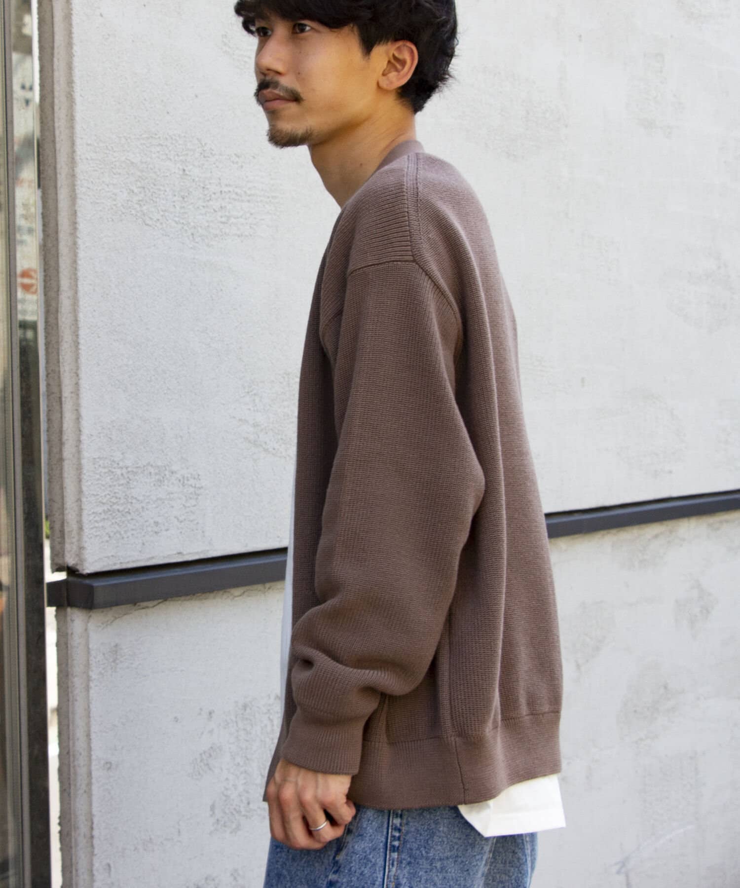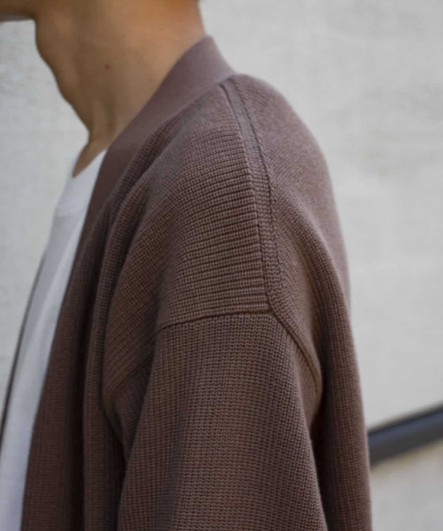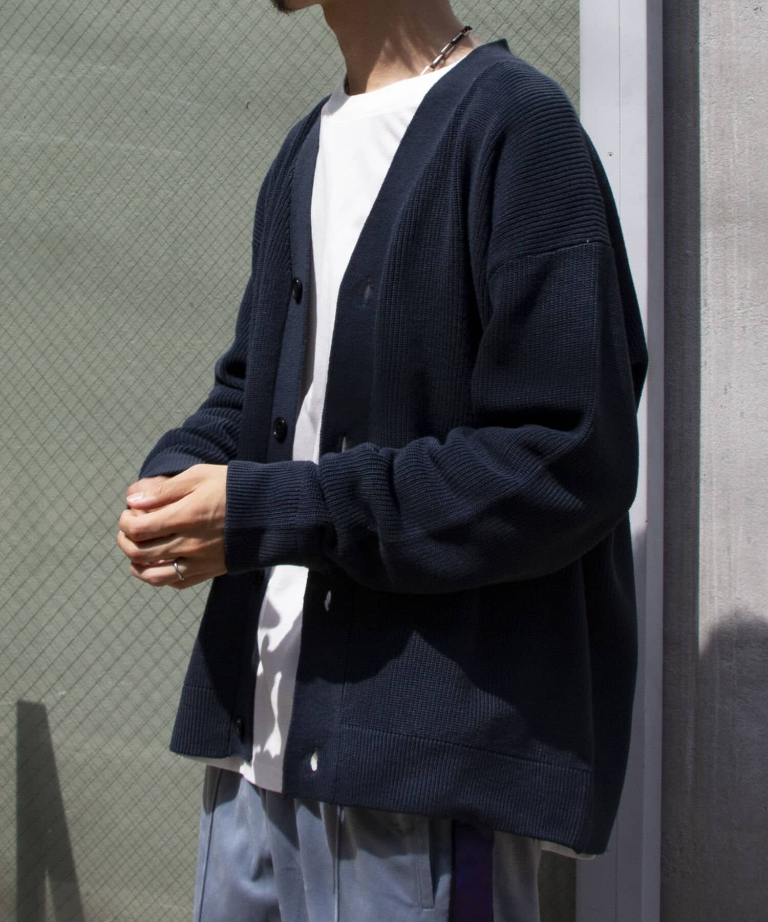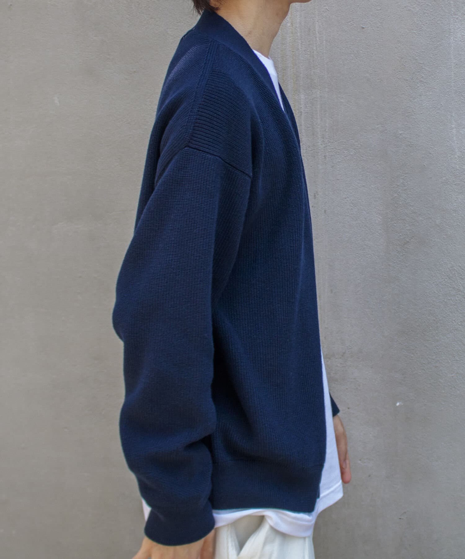 肩回りを包み込むようなドロップショルダー、ゆとりのある身幅、抜け感のあるビッグシルエットが目を引く存在感抜群のニットカーデ。
