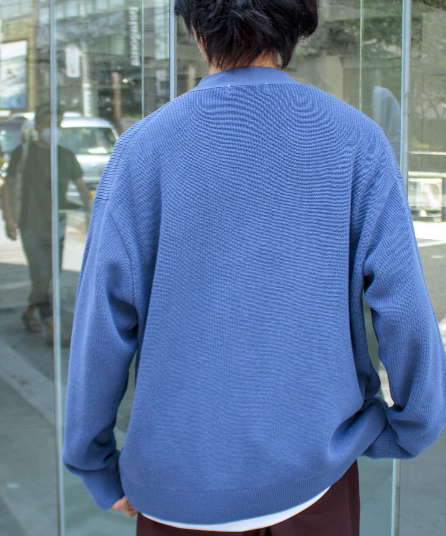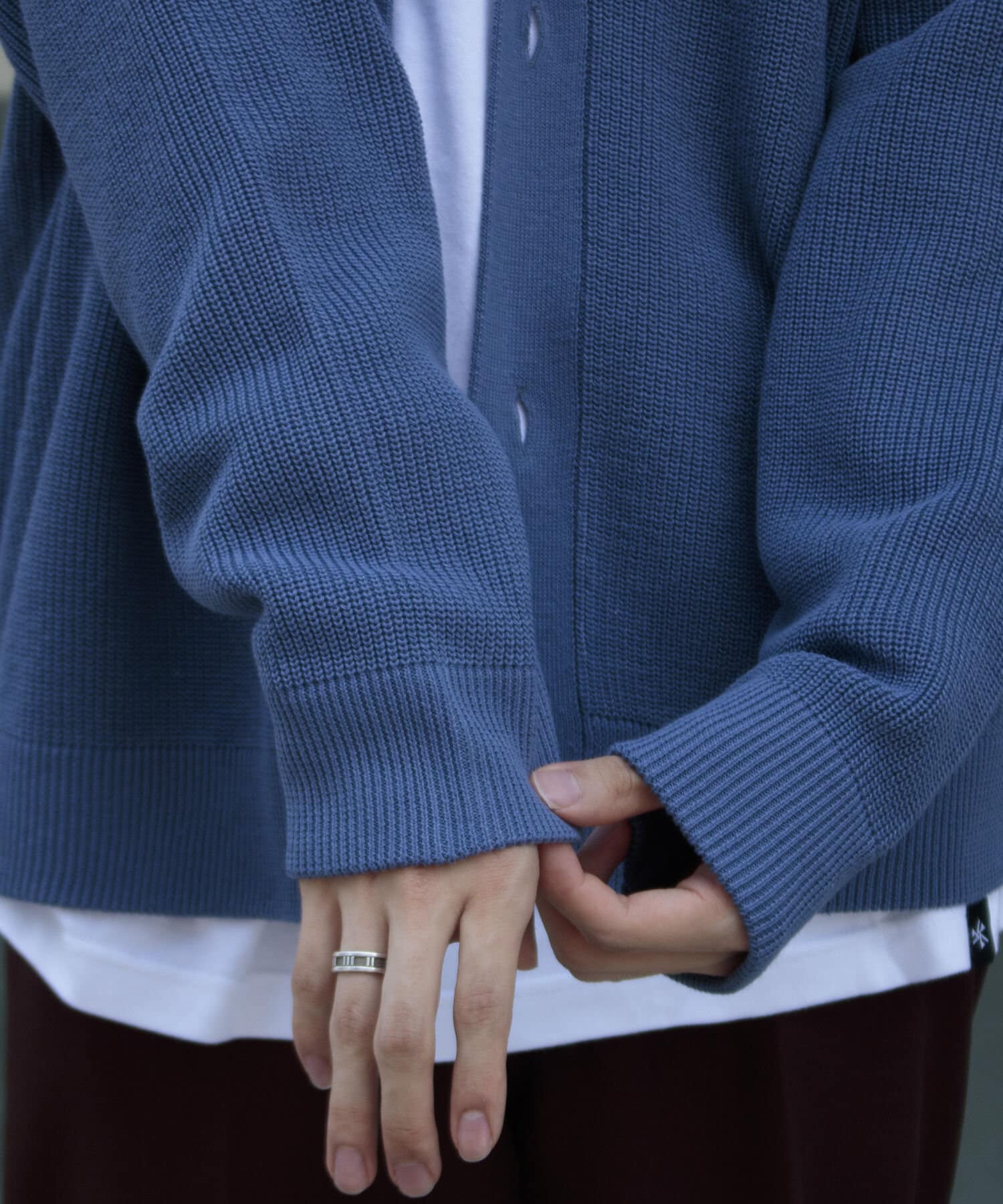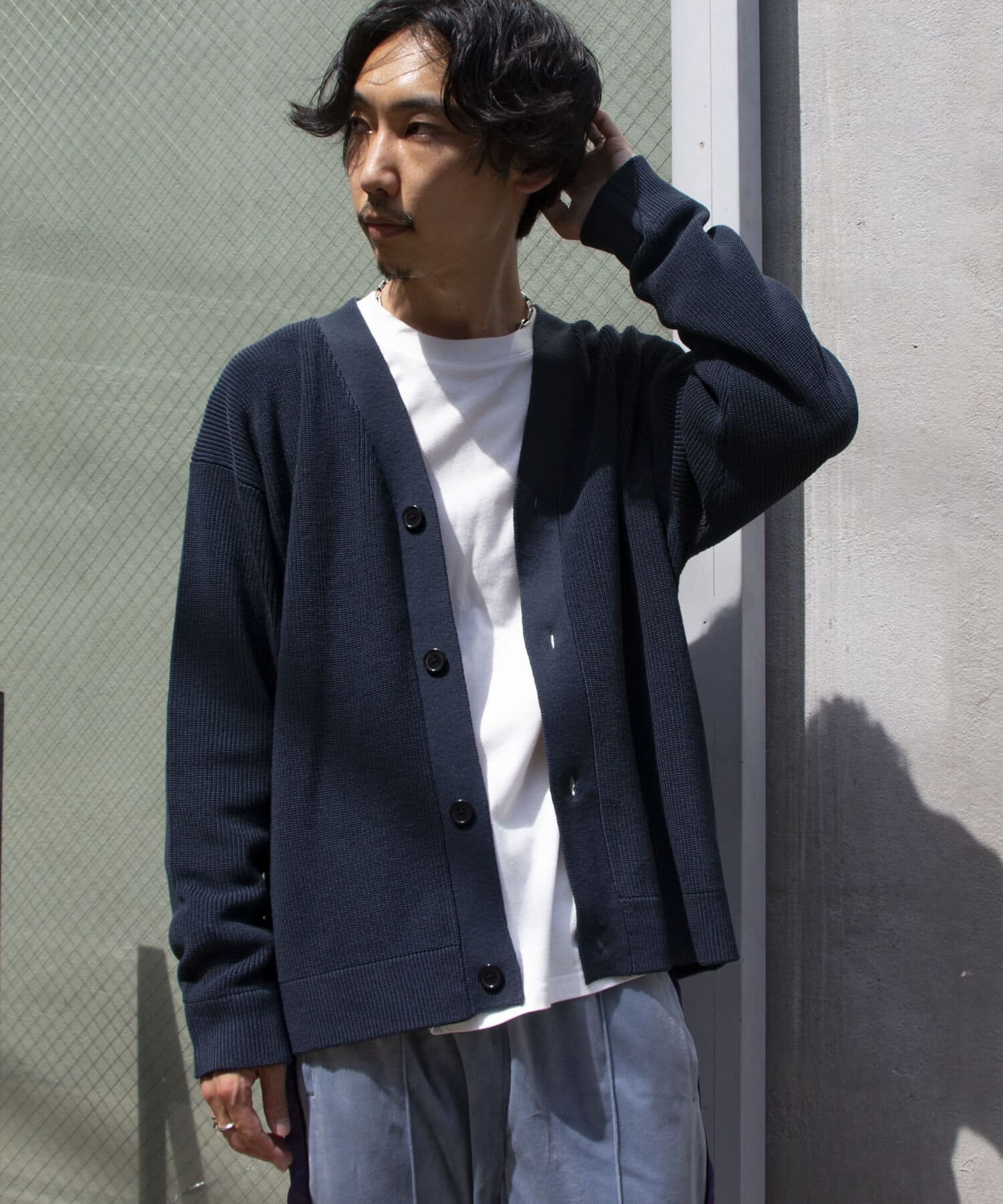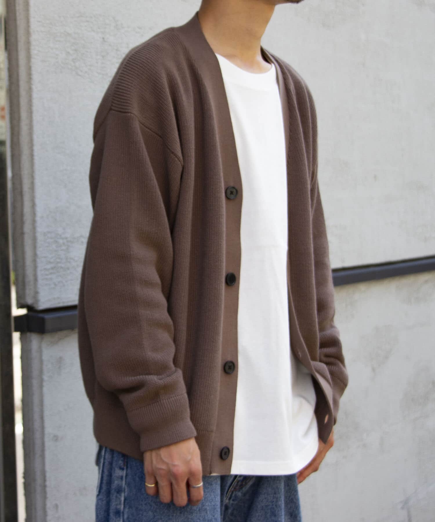 肩回りを包み込むようなドロップショルダー、ゆとりのある身幅、抜け感のあるビッグシルエットが目を引く存在感抜群のニットカーデ。
