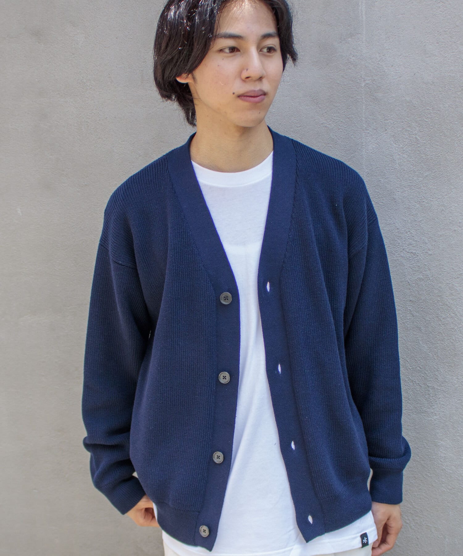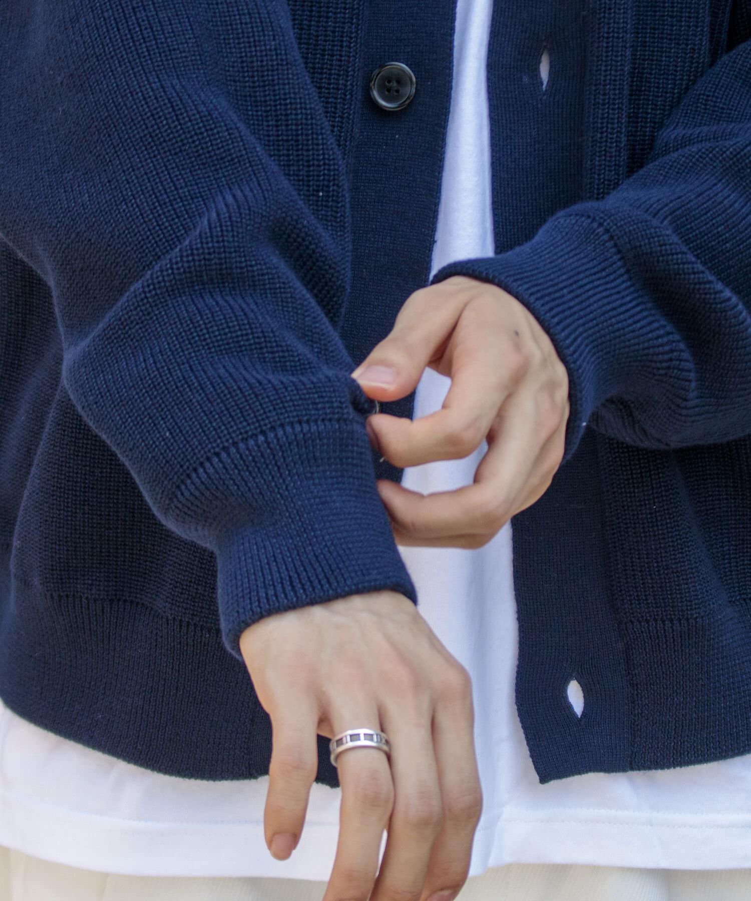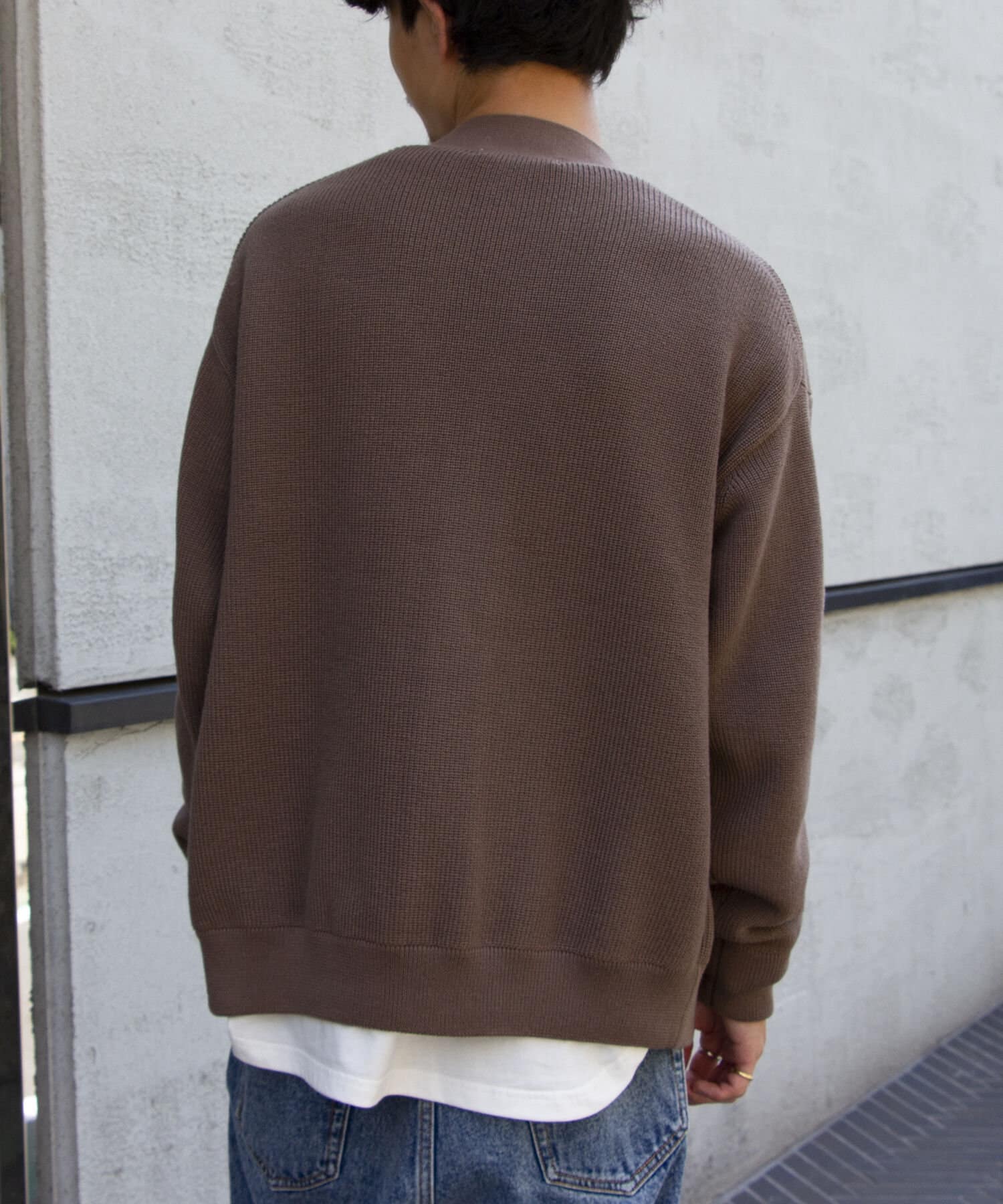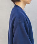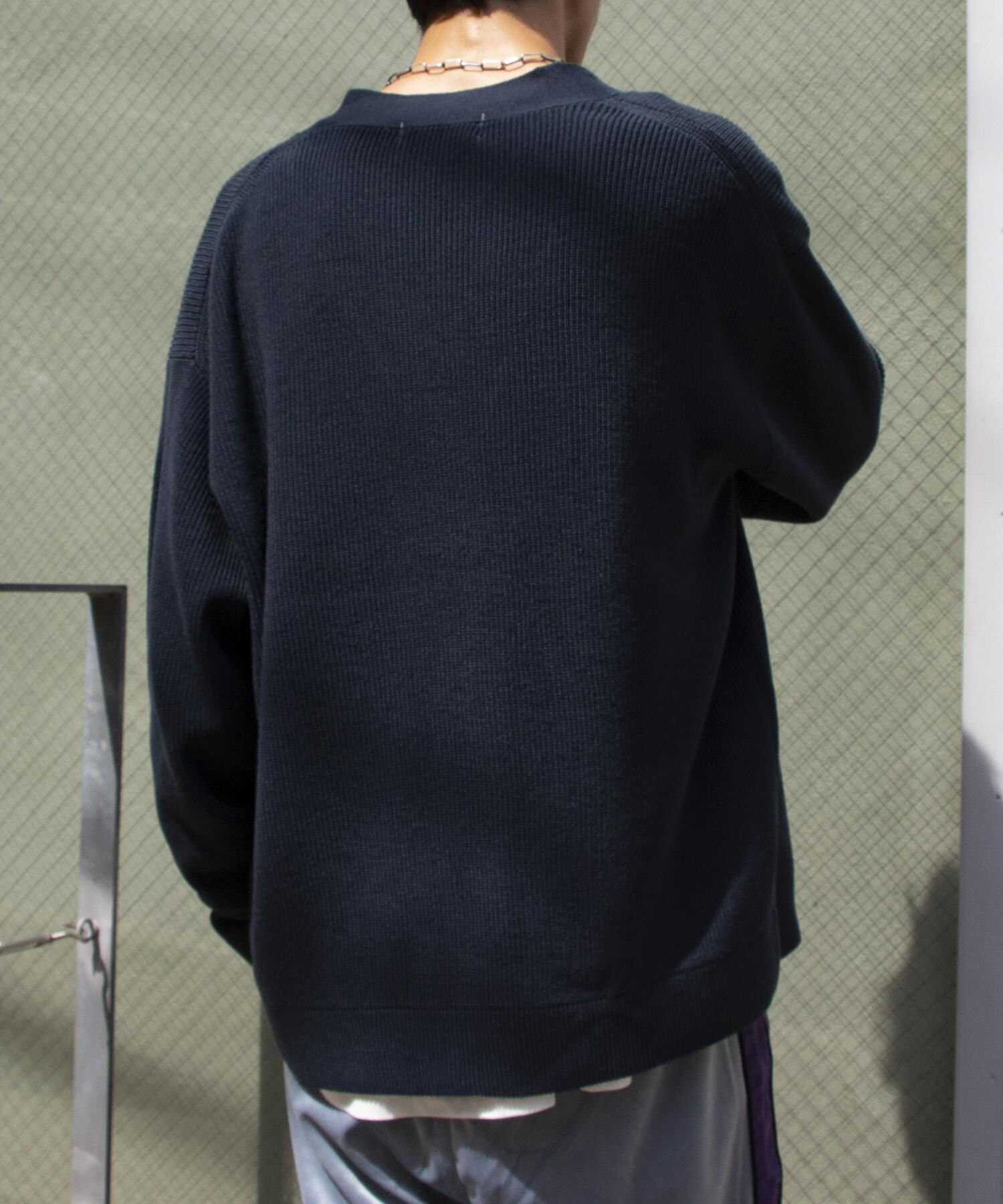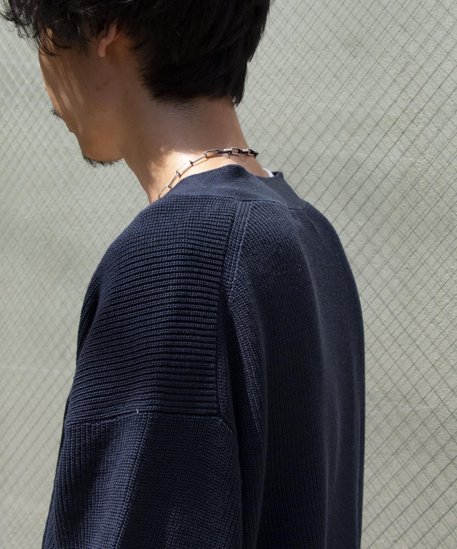 肩回りを包み込むようなドロップショルダー、ゆとりのある身幅、抜け感のあるビッグシルエットが目を引く存在感抜群のニットカーデ。