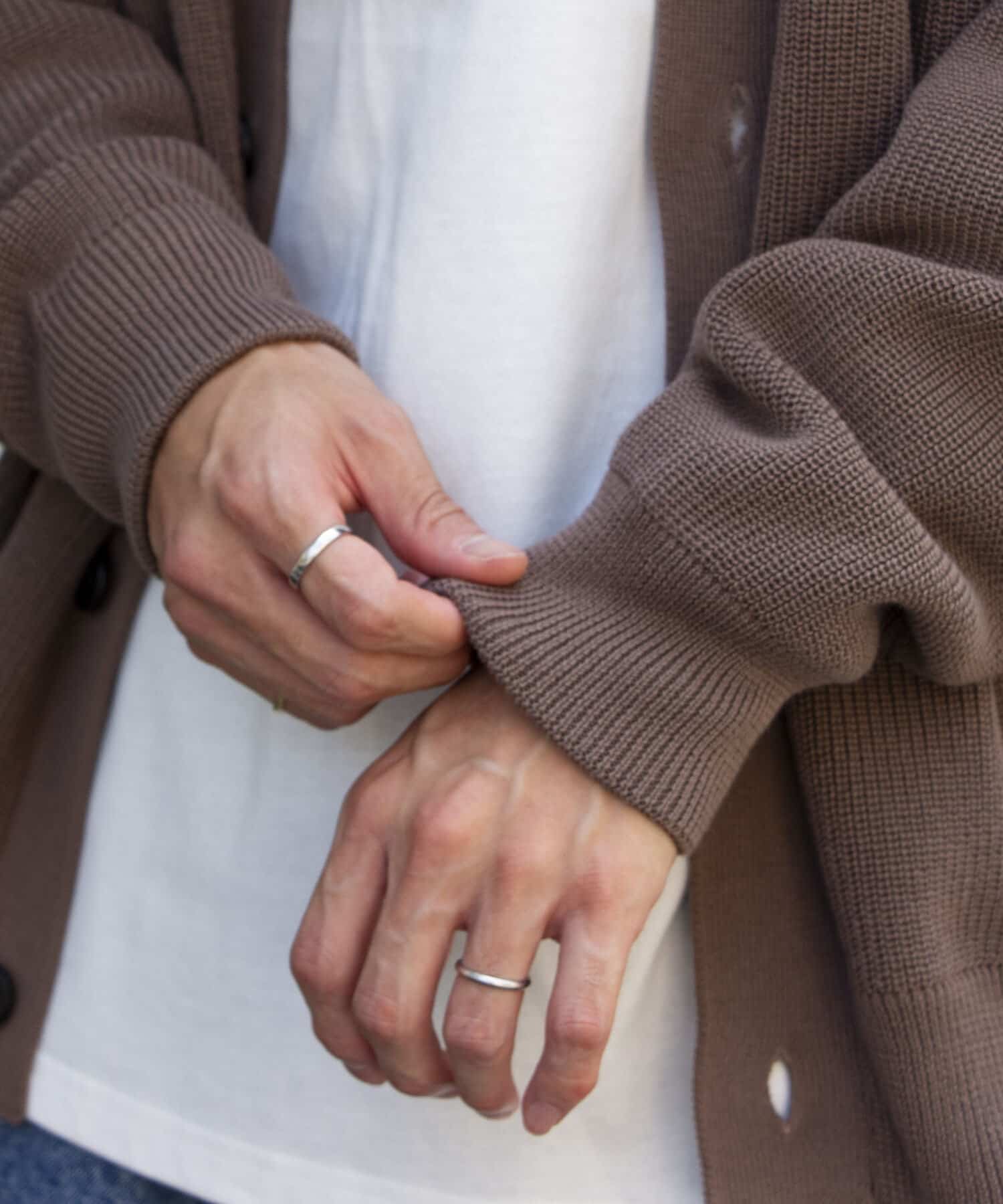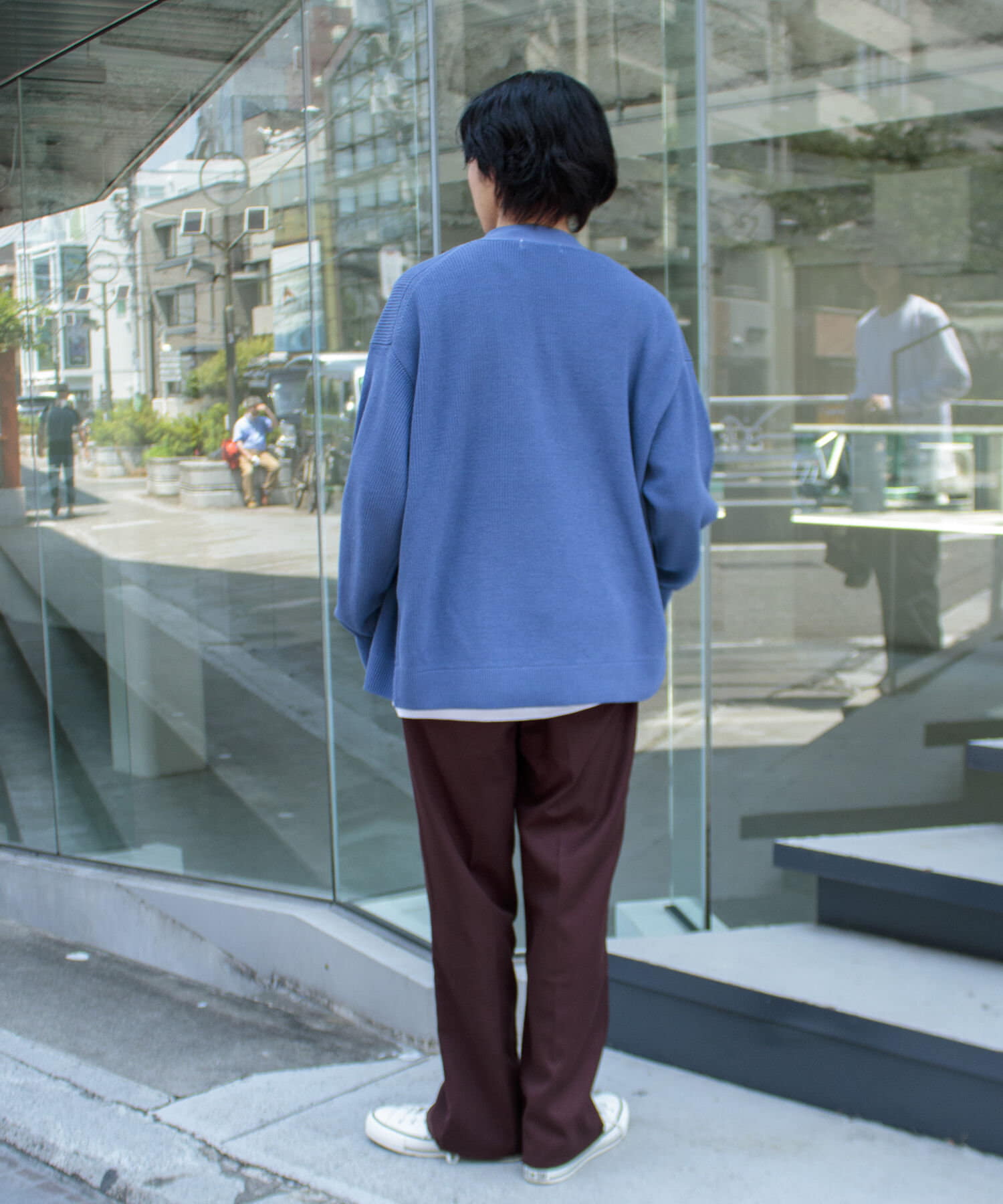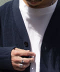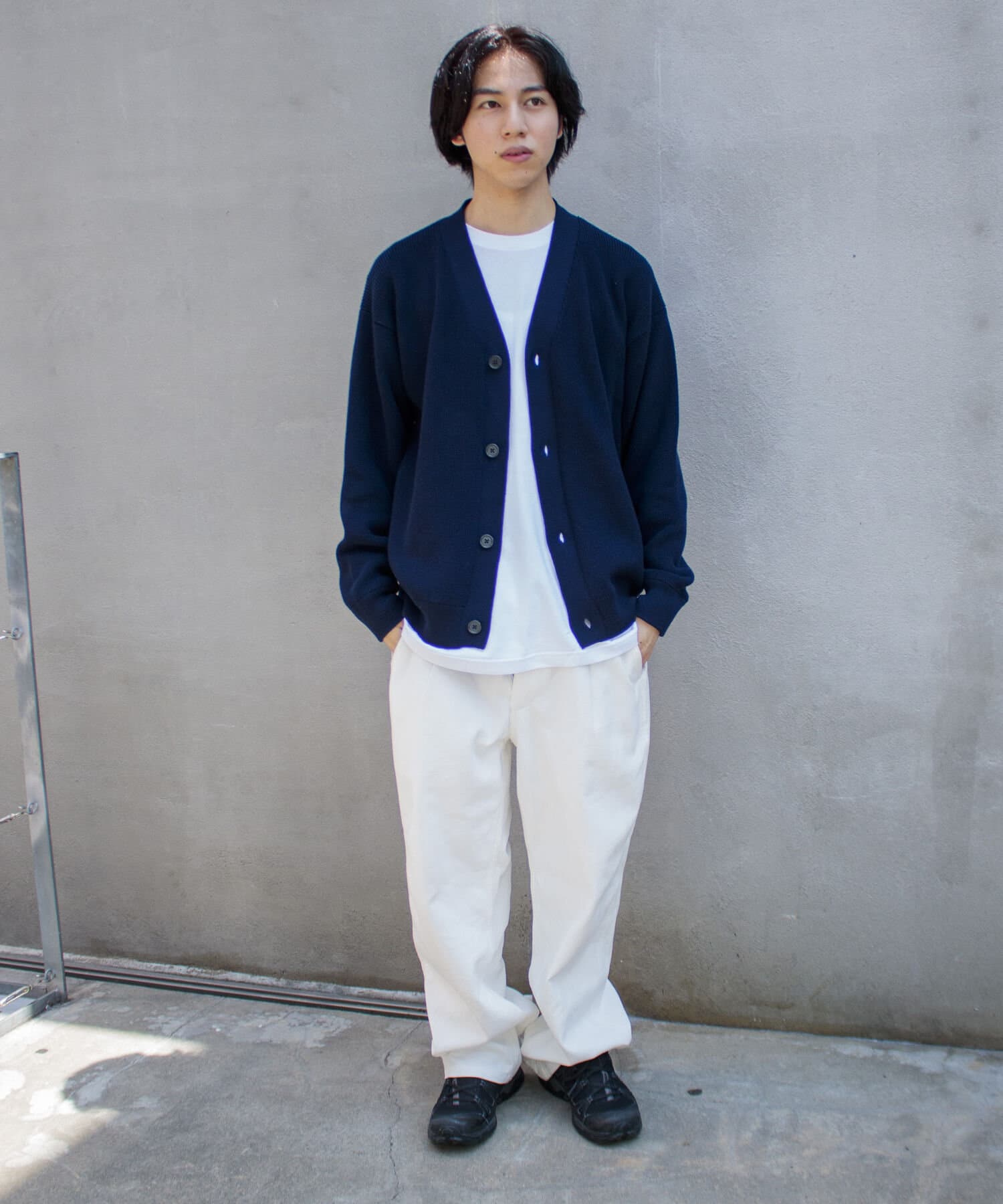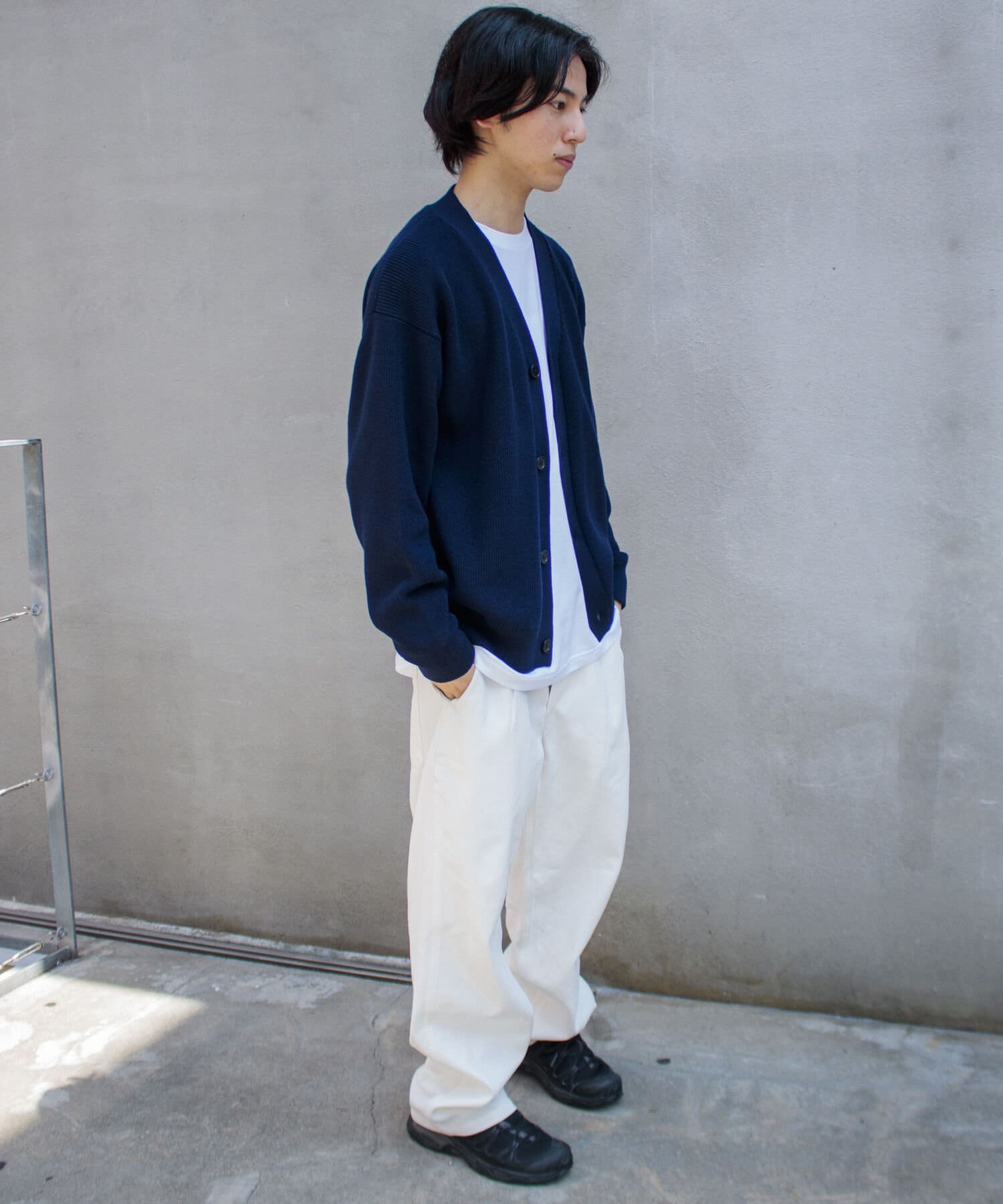 肩回りを包み込むようなドロップショルダー、ゆとりのある身幅、抜け感のあるビッグシルエットが目を引く存在感抜群のニットカーデ。