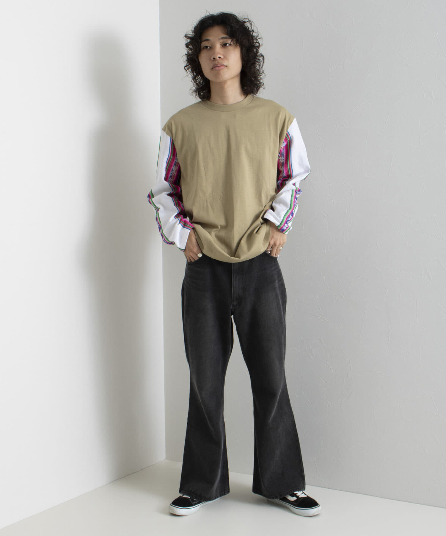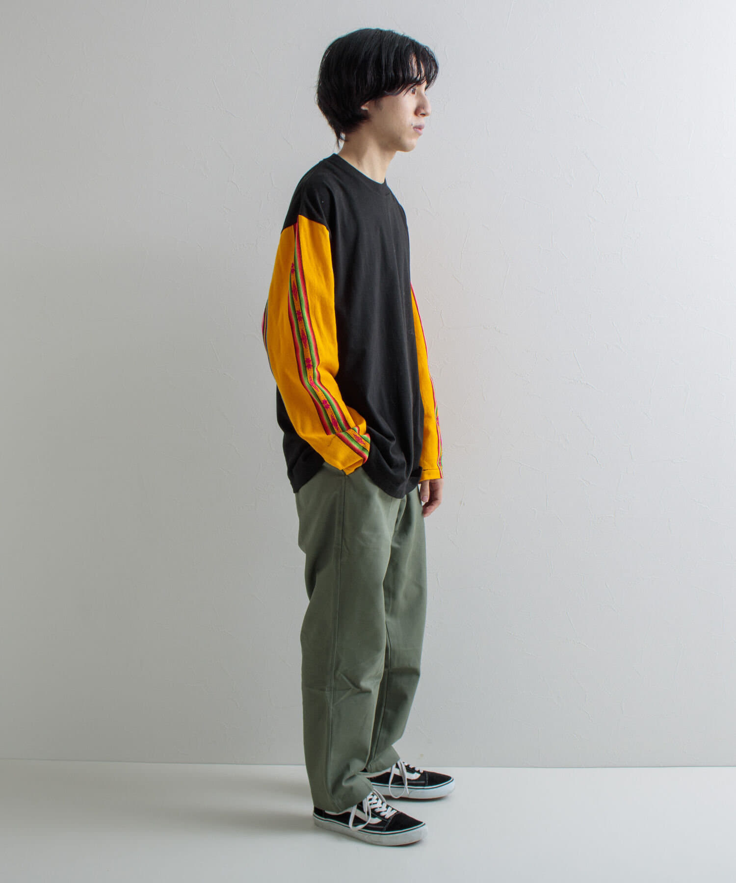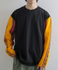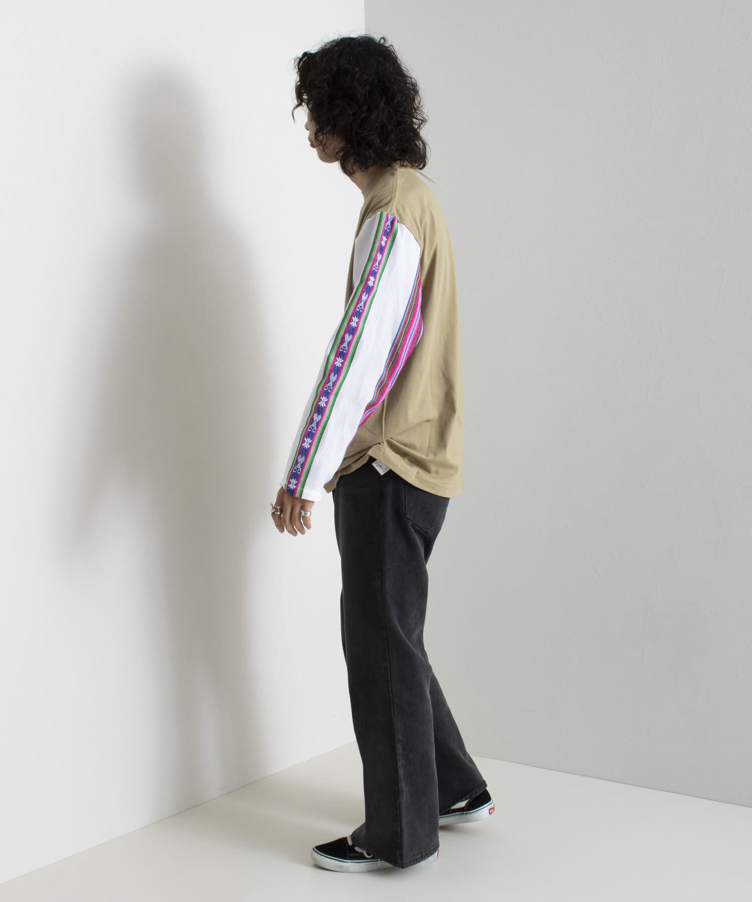 Tシャツのボディそれぞれに合うように選ばれたマテリアルを袖に切り替えをすることにより唯一無二のロンTが完成しました。