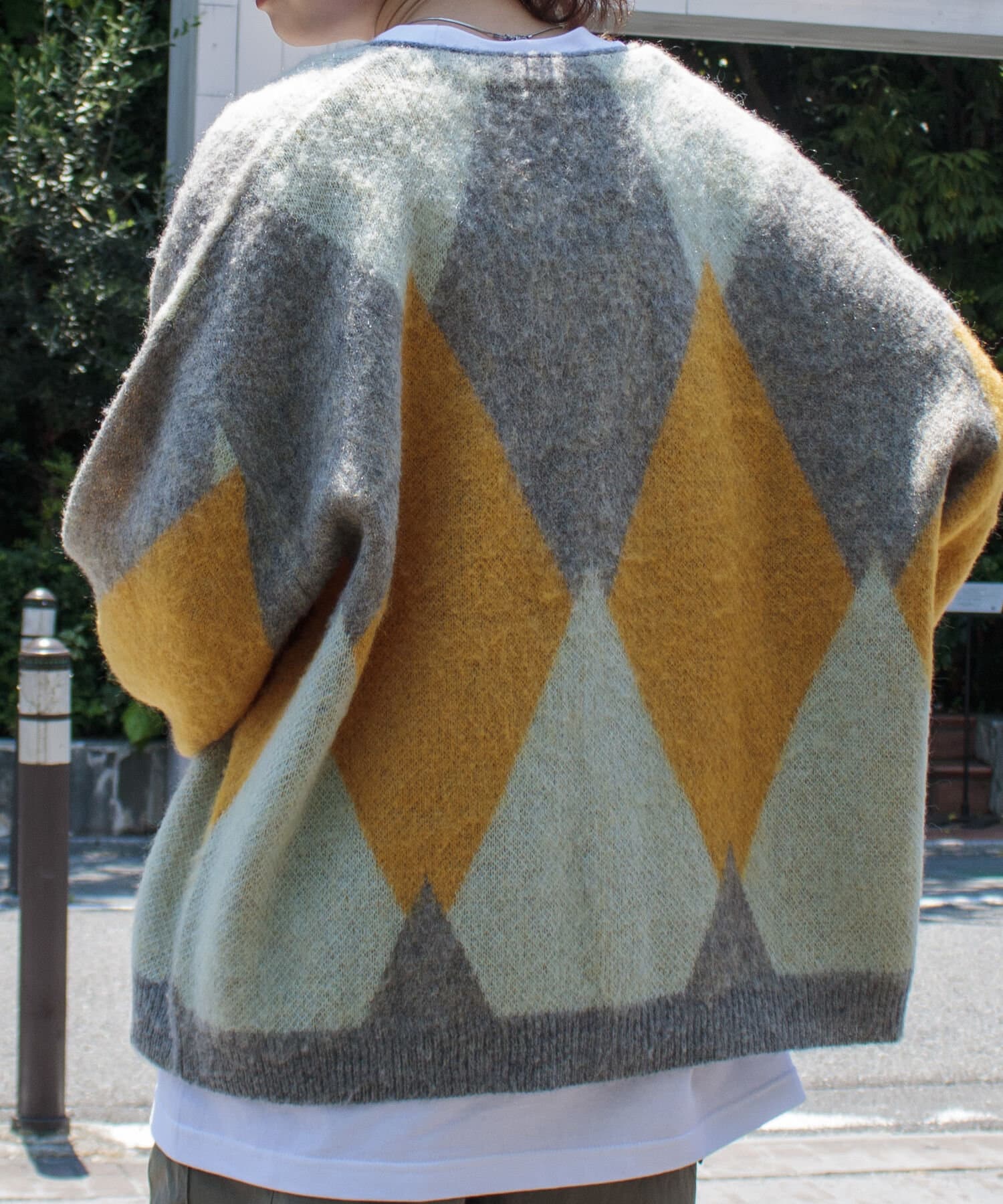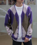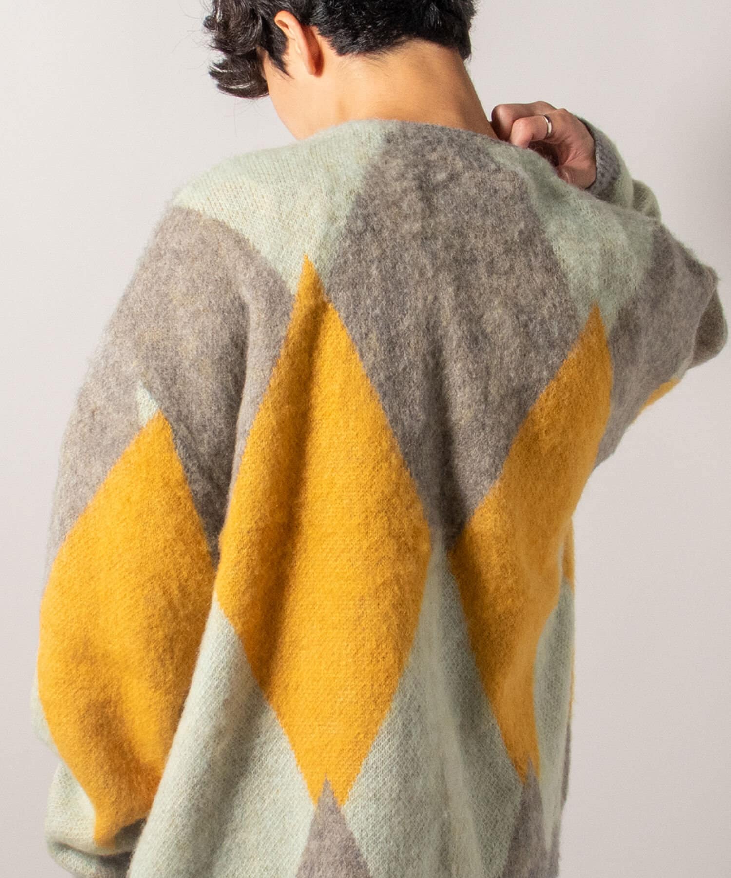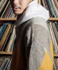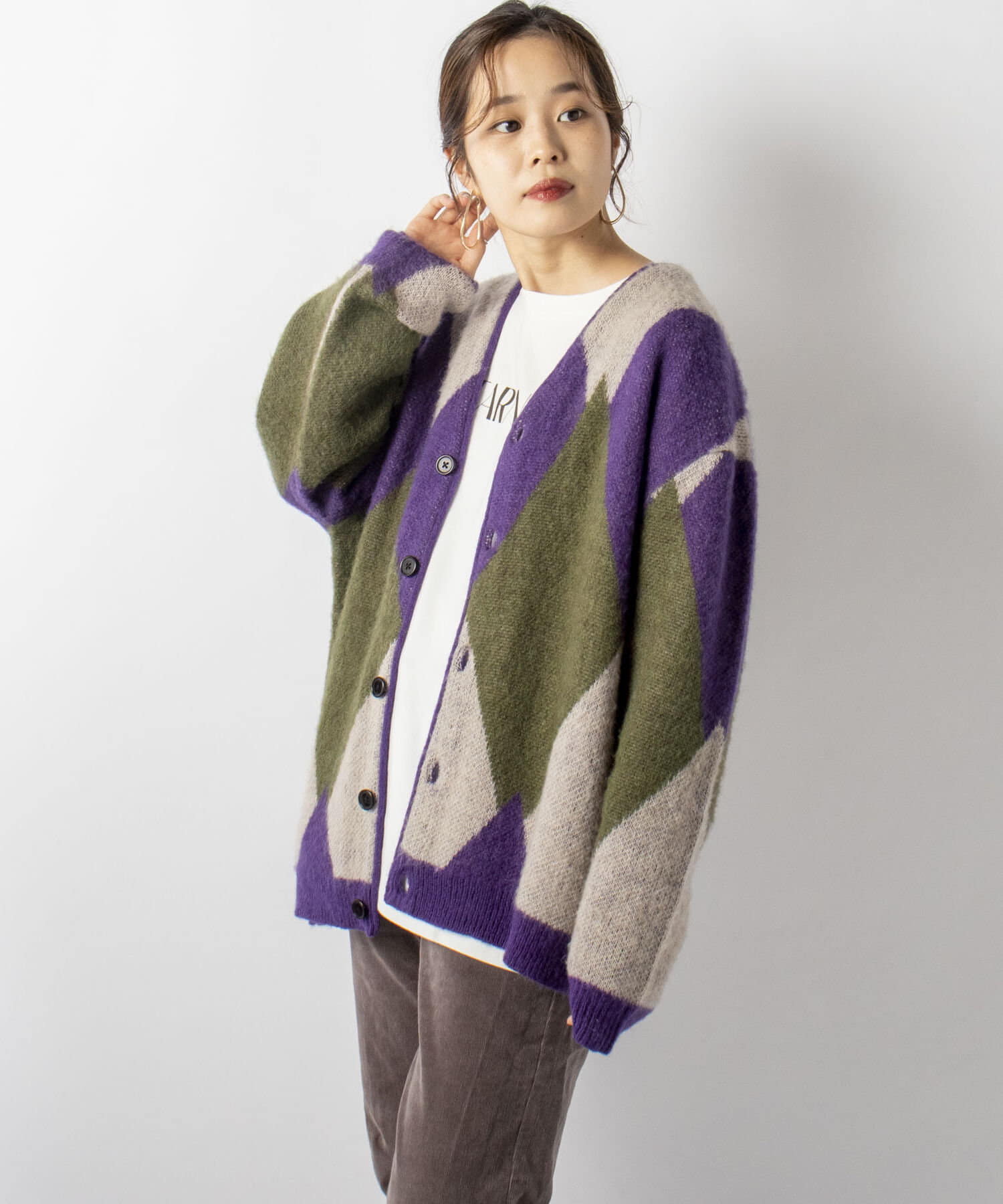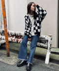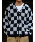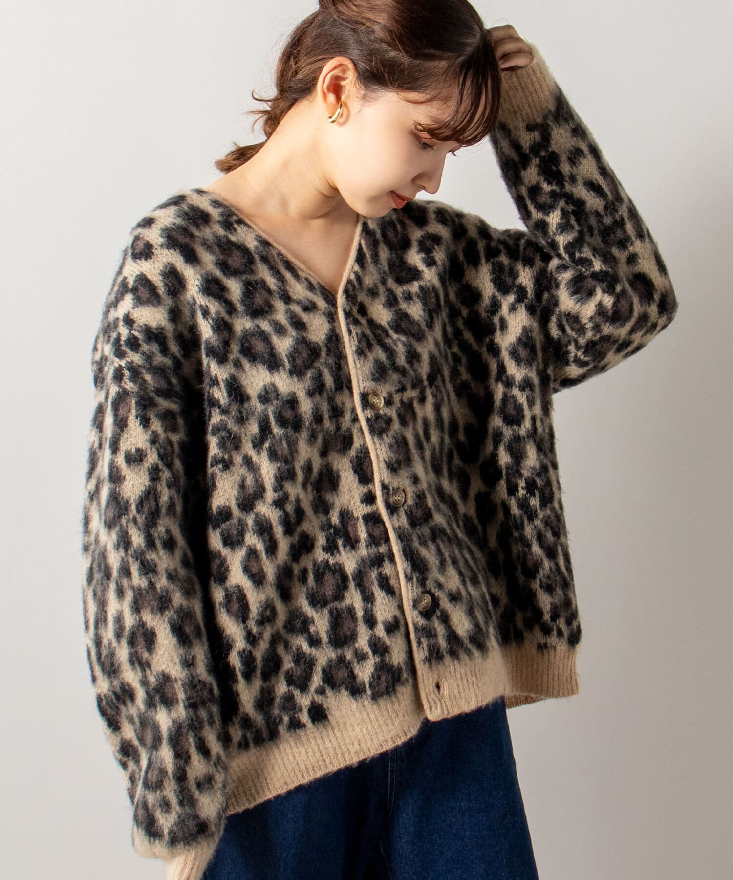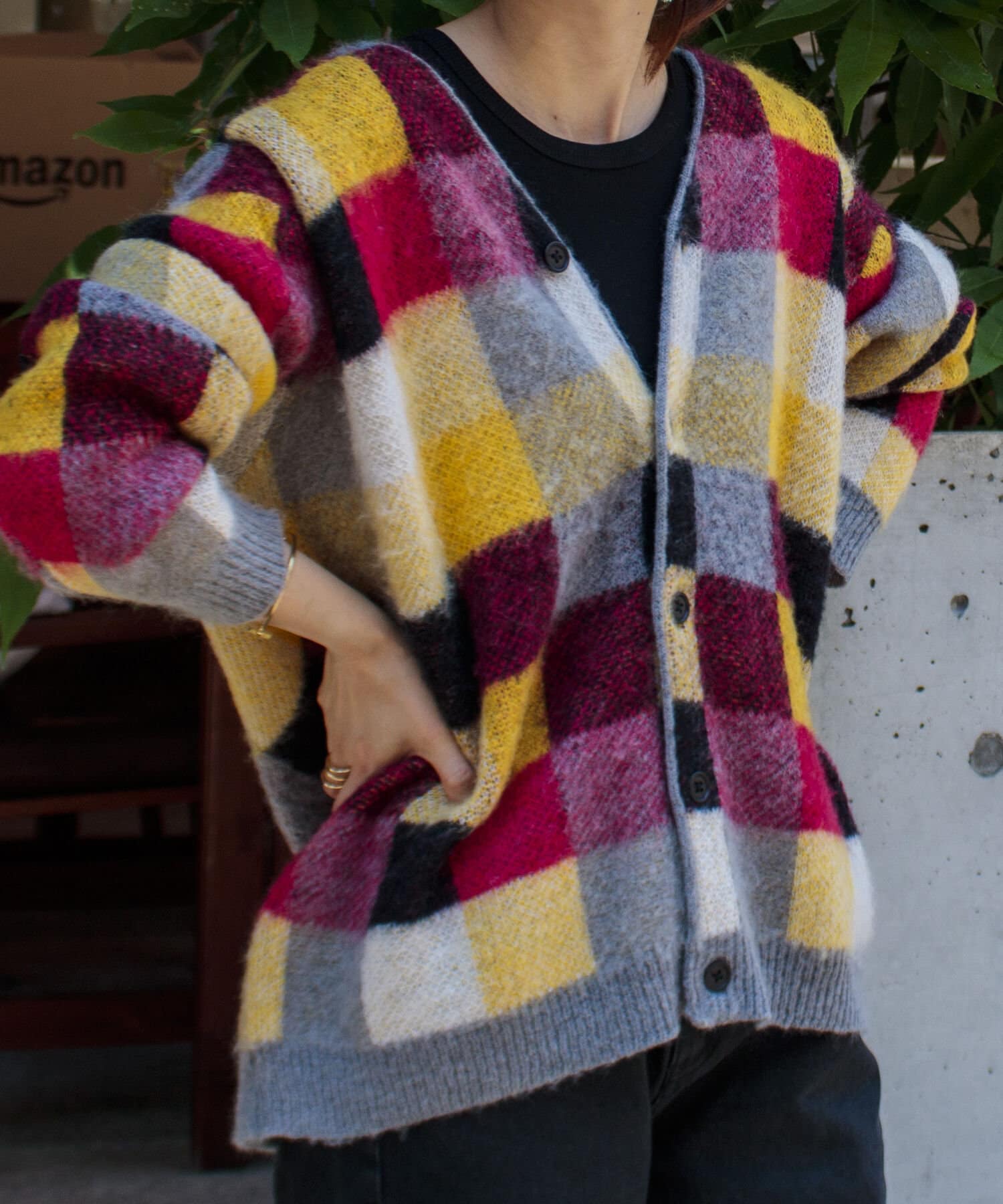 毛足の長いモヘア混カーデにインパクト大な柄をのせた1枚!