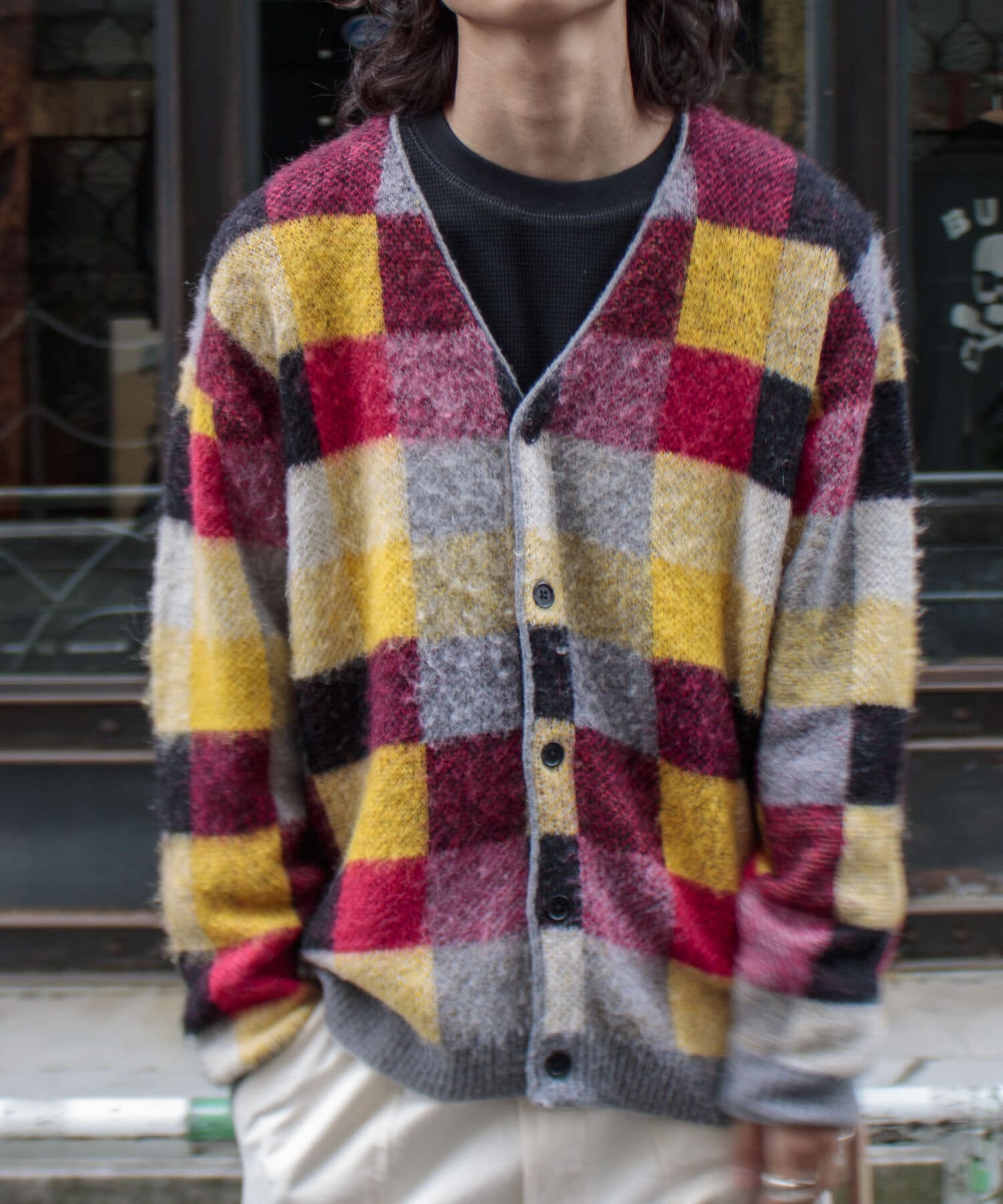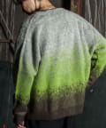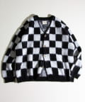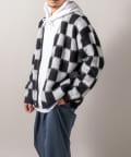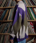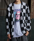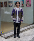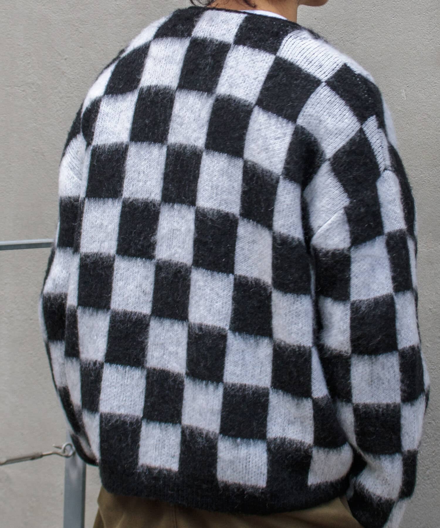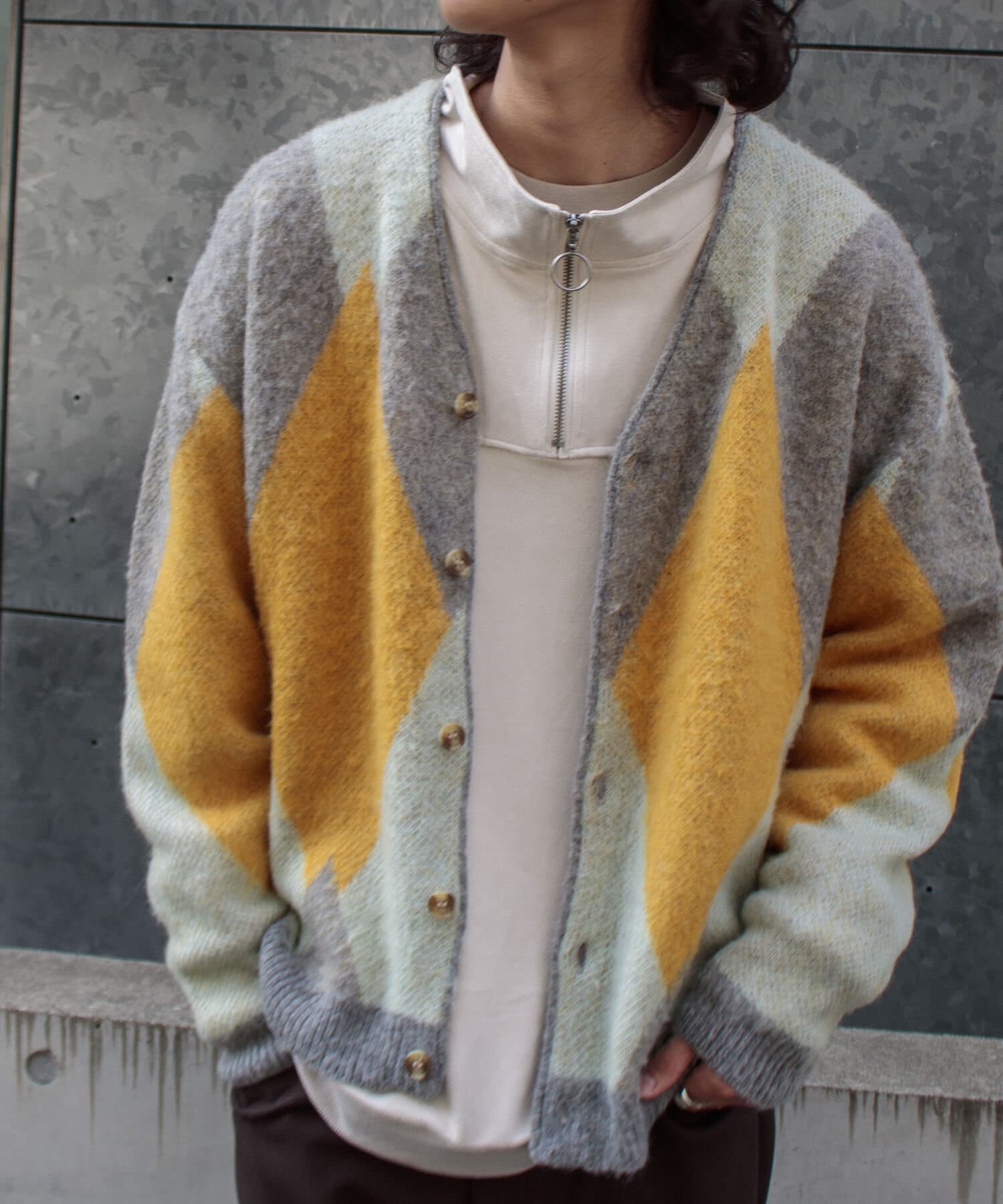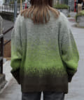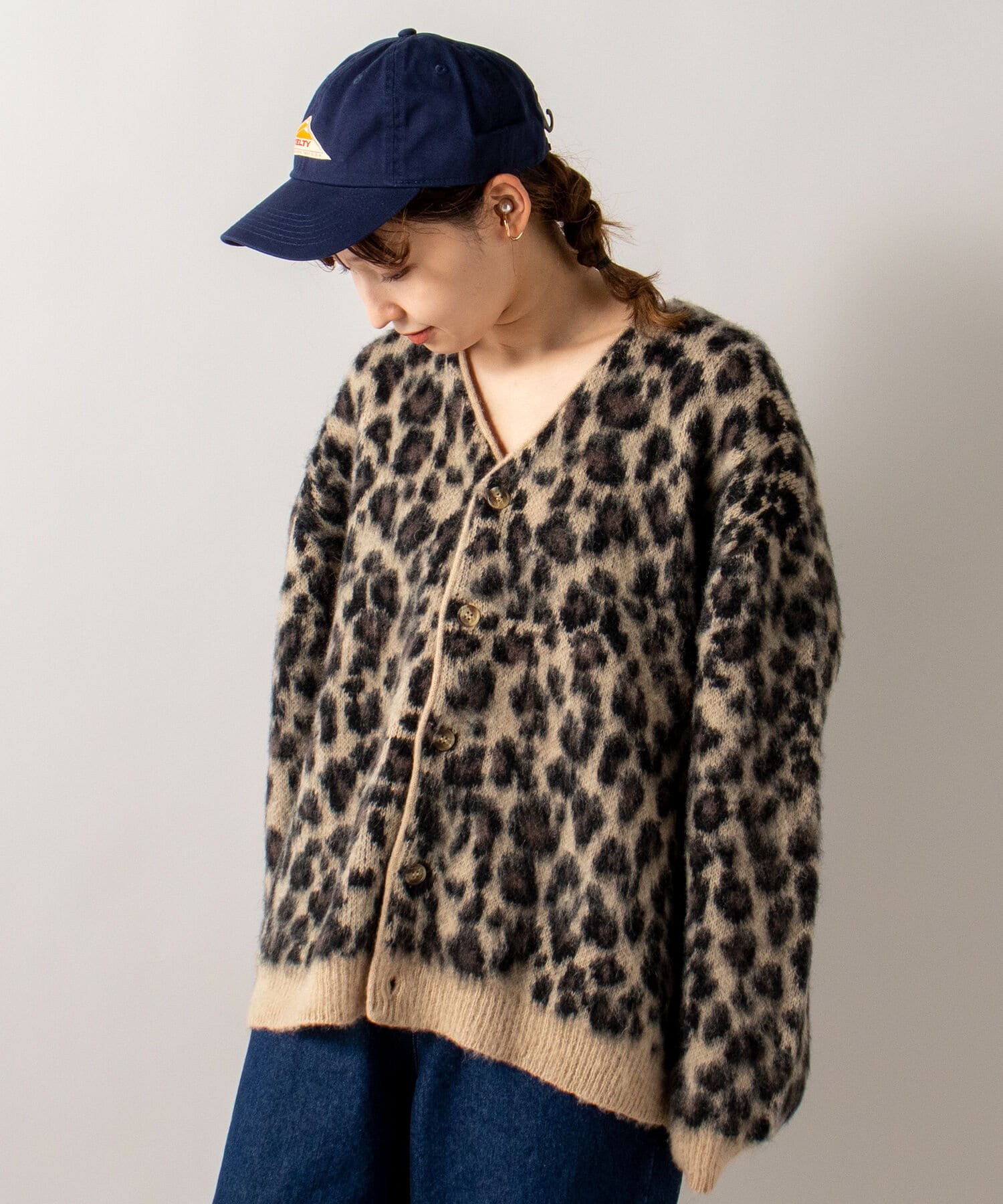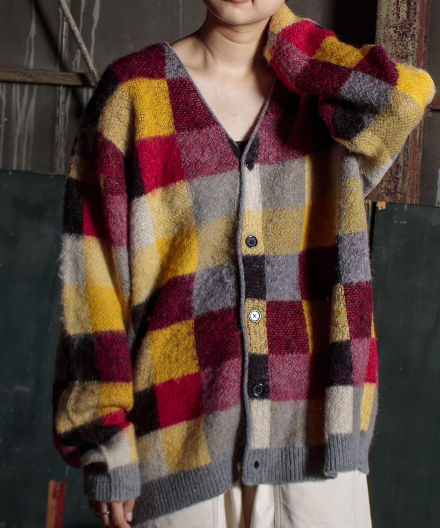 毛足の長いモヘア混カーデにインパクト大な柄をのせた1枚!