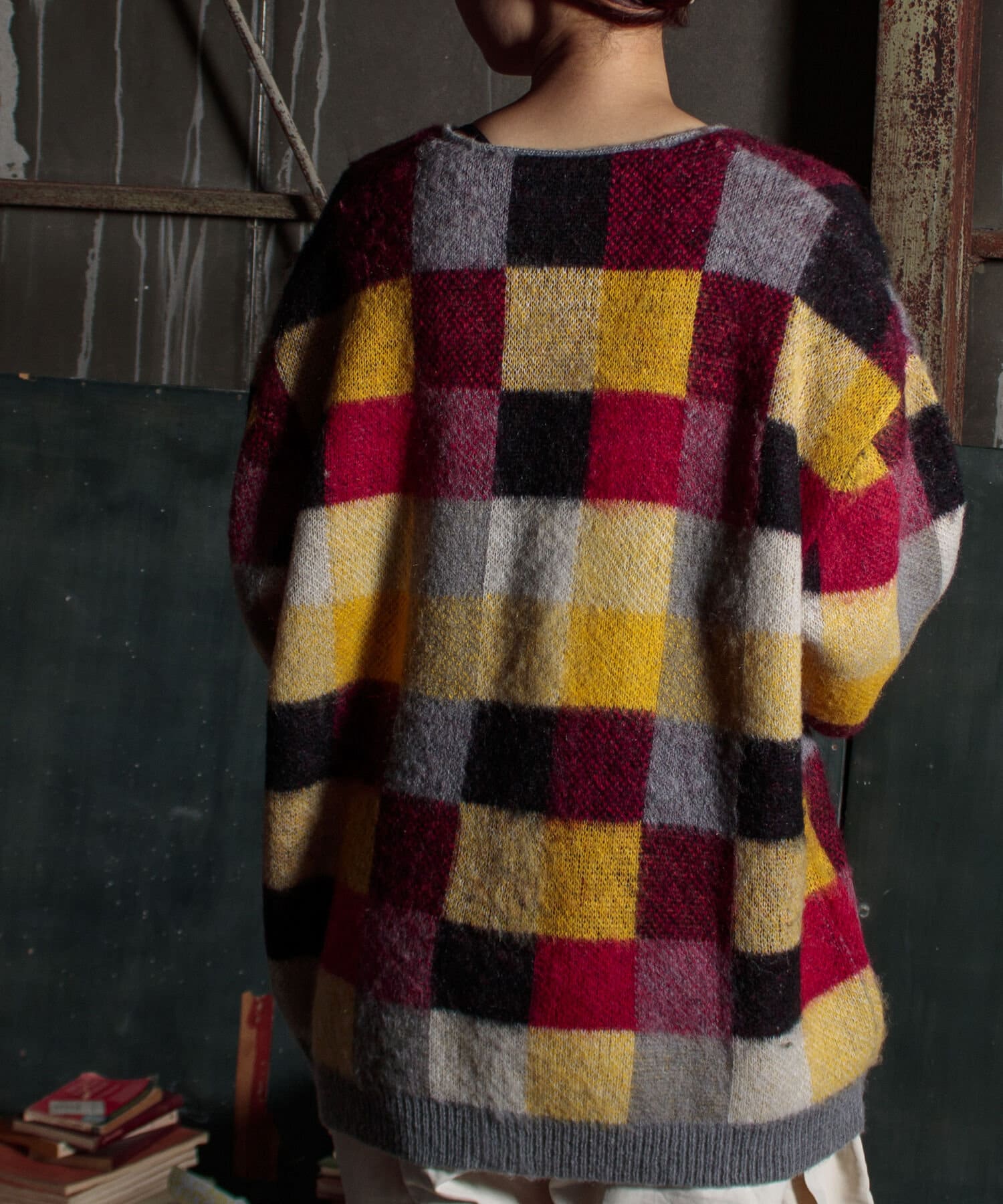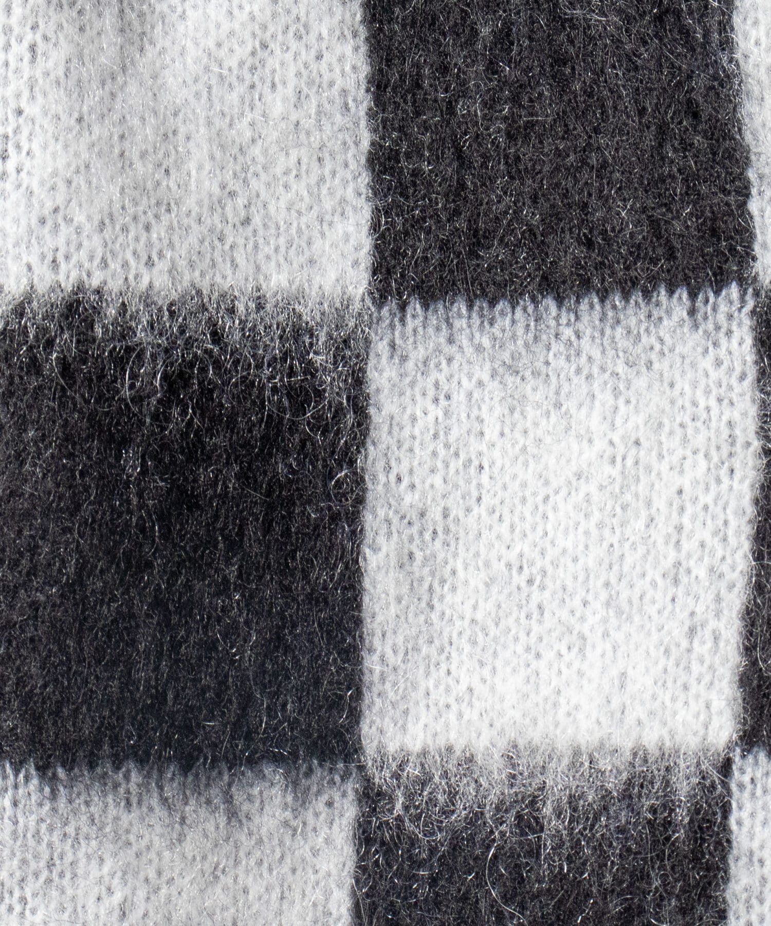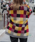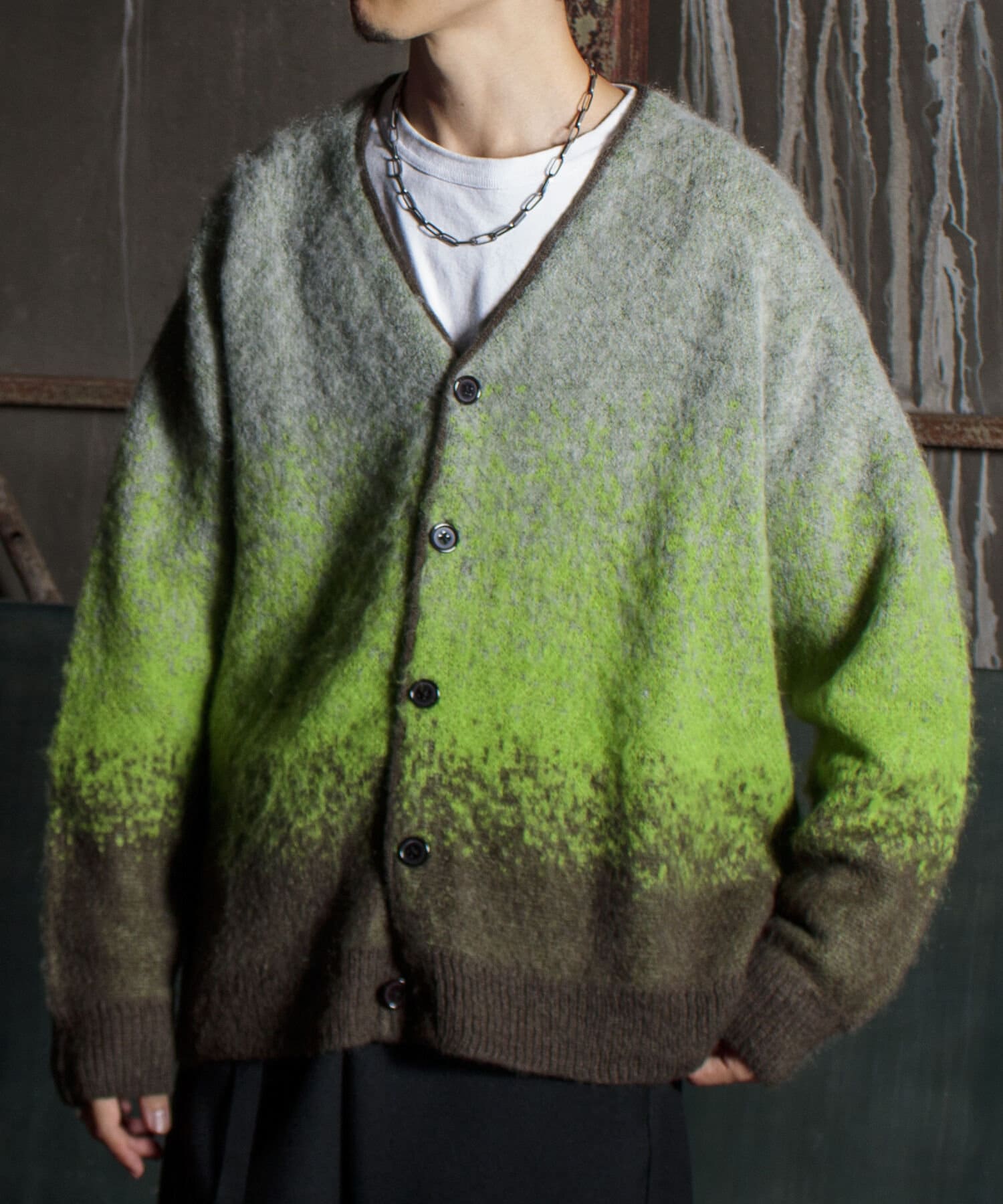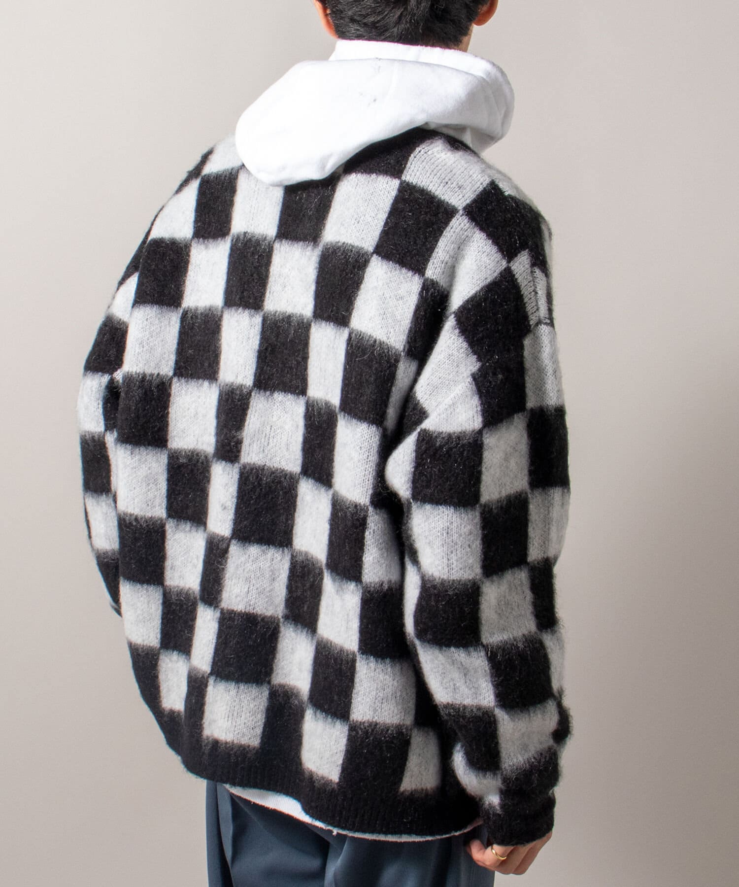毛足の長いモヘア混カーデにインパクト大な柄をのせた1枚!