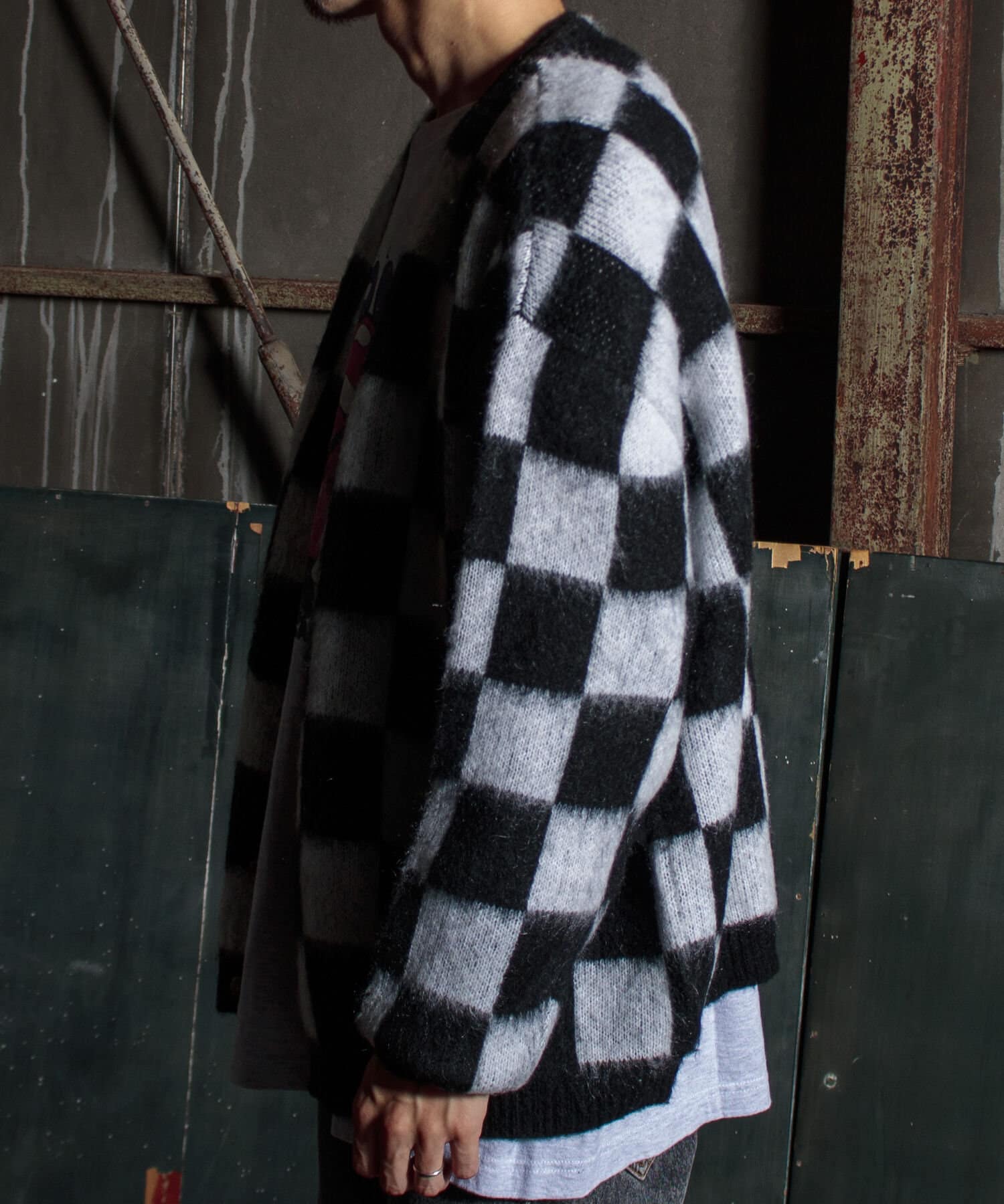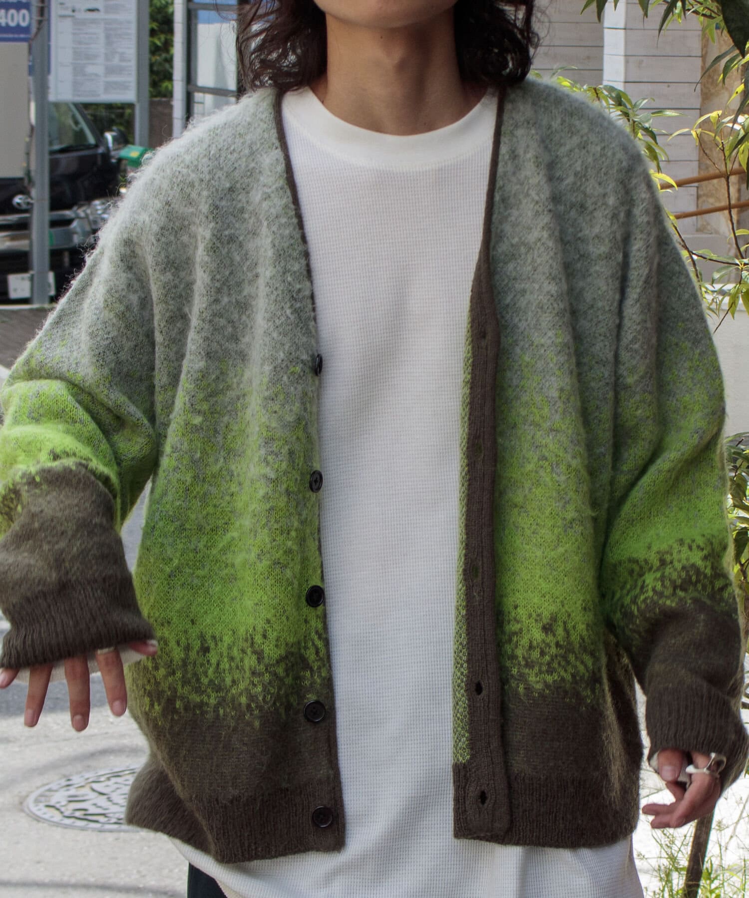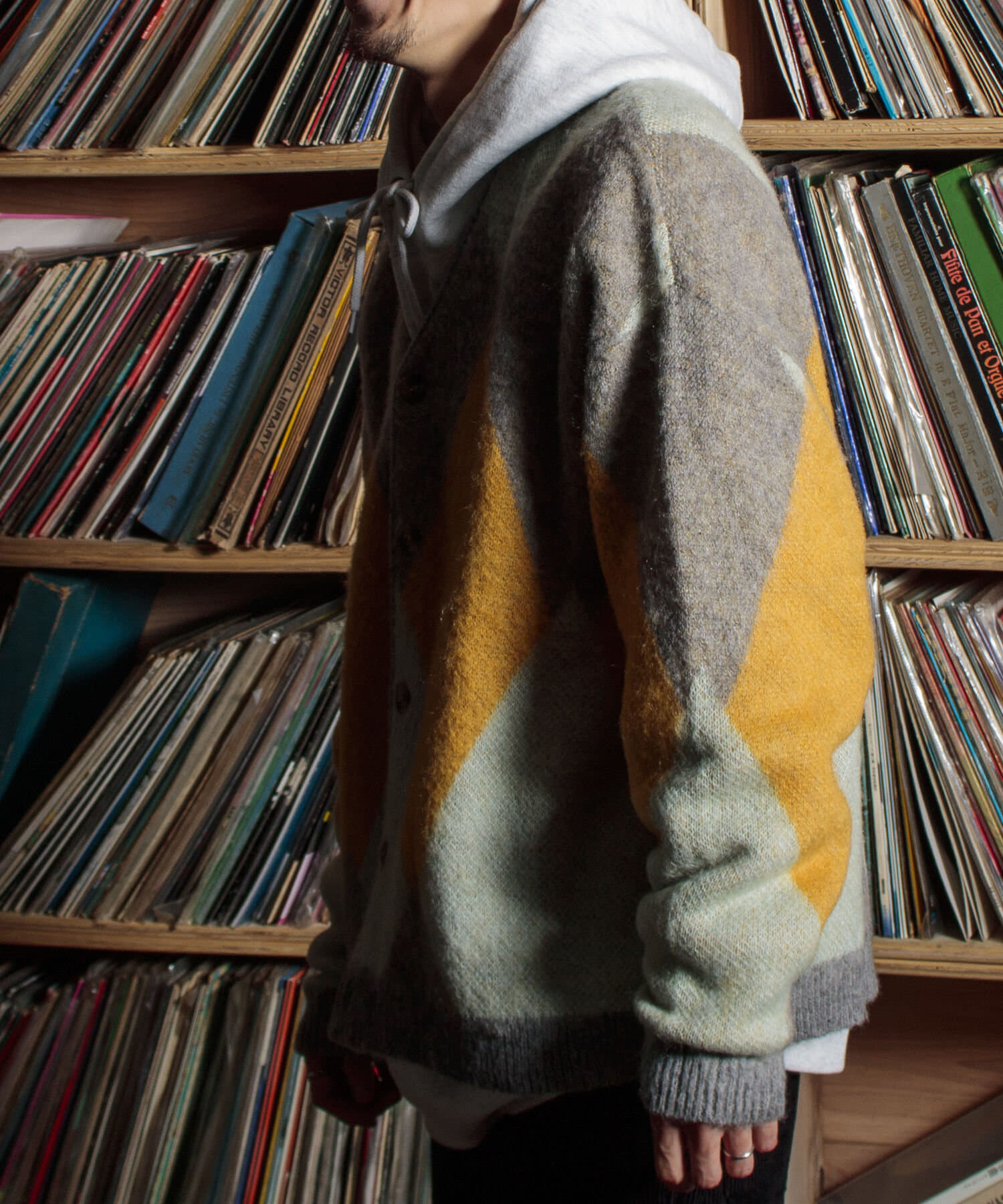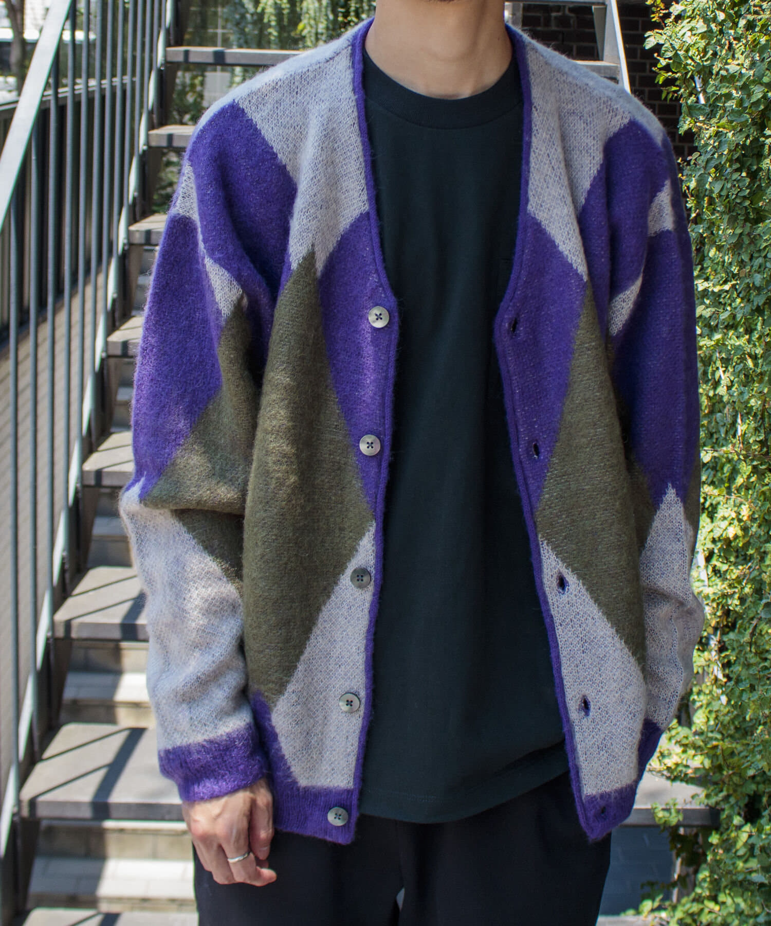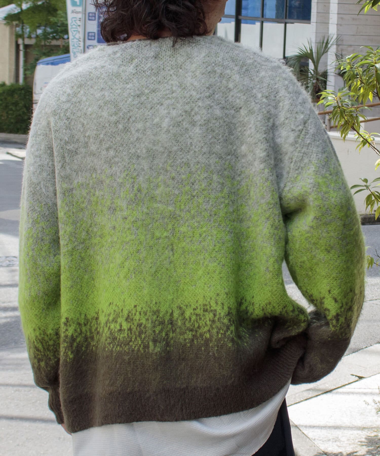 毛足の長いモヘア混カーデにインパクト大な柄をのせた1枚!
