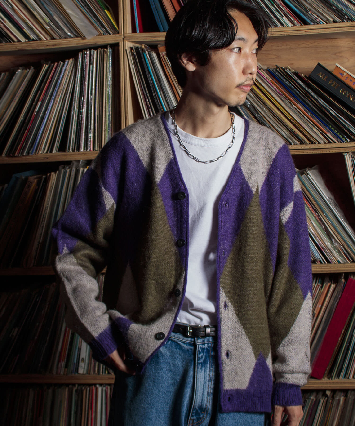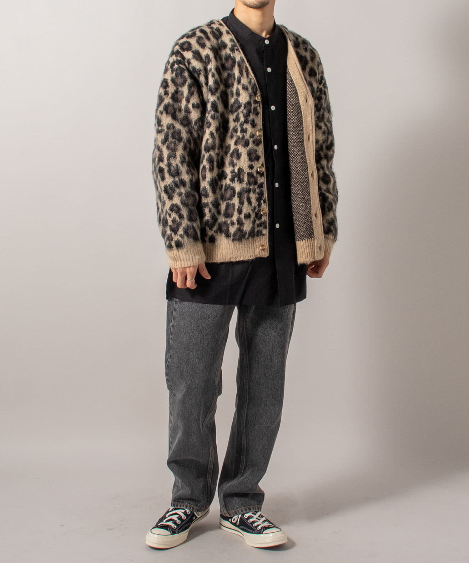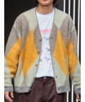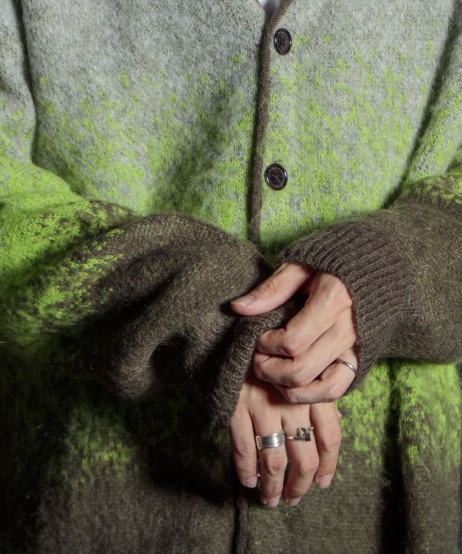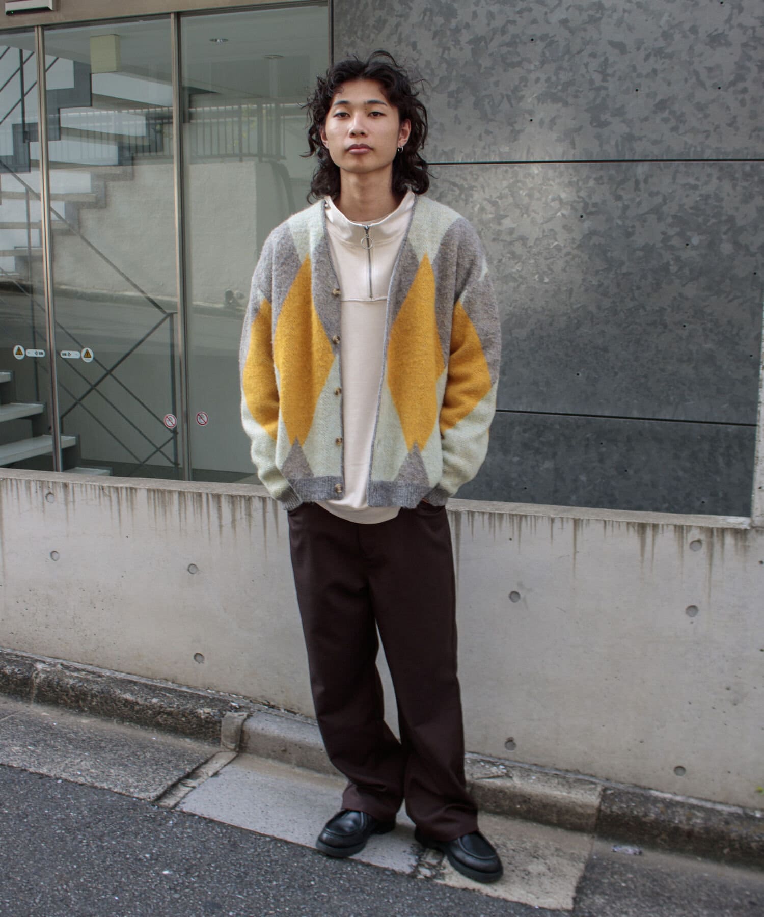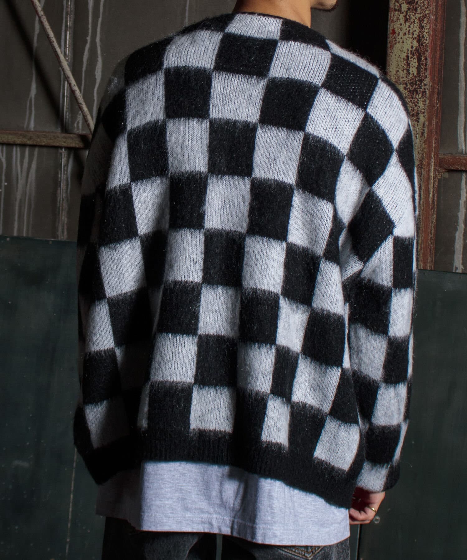 毛足の長いモヘア混カーデにインパクト大な柄をのせた1枚!