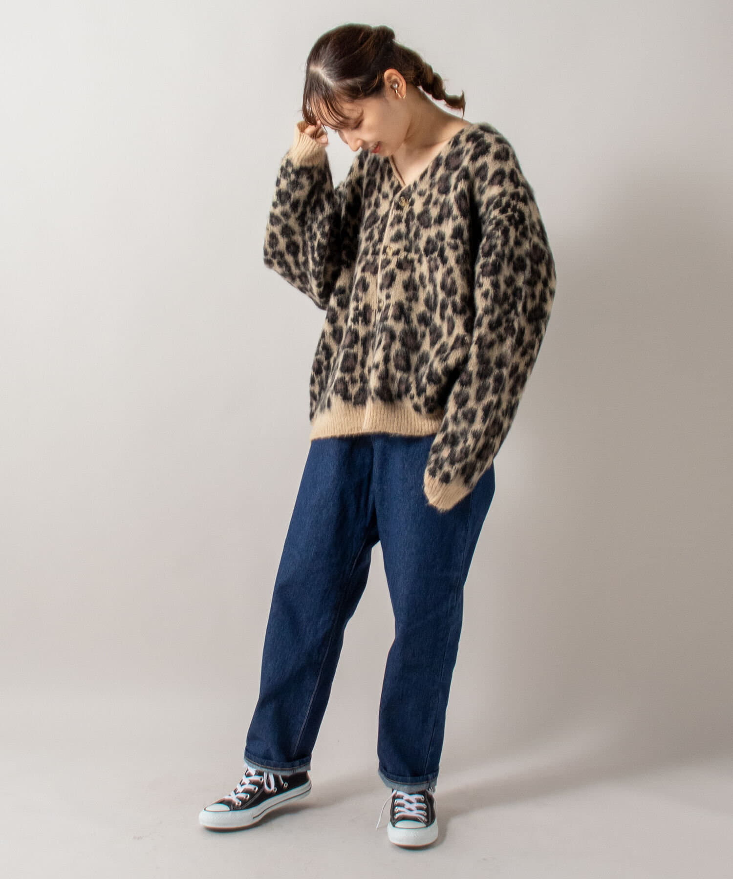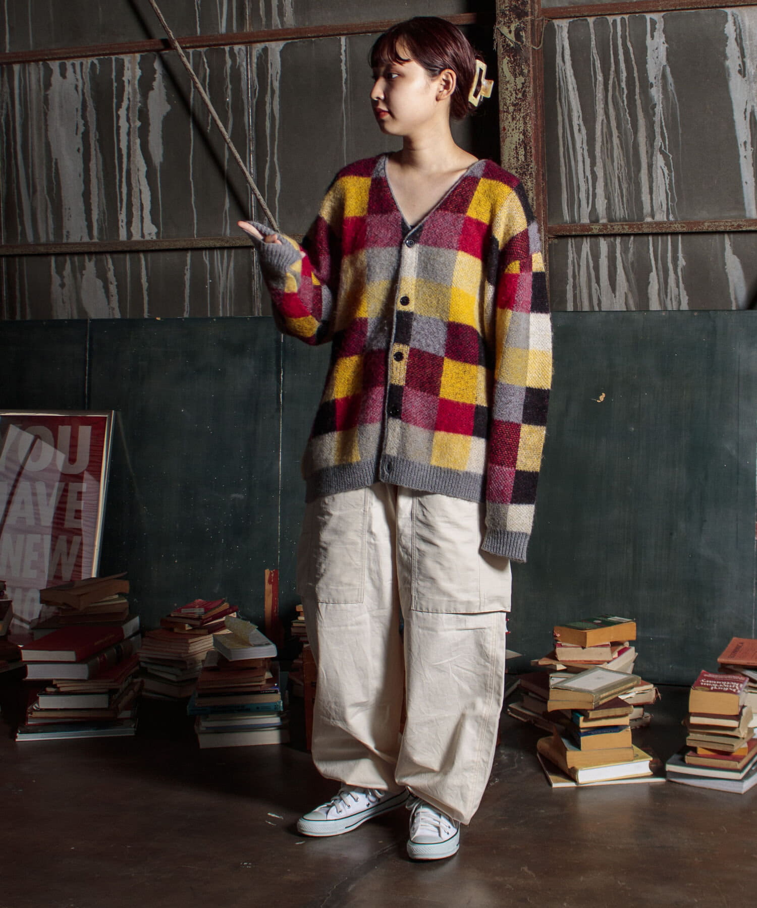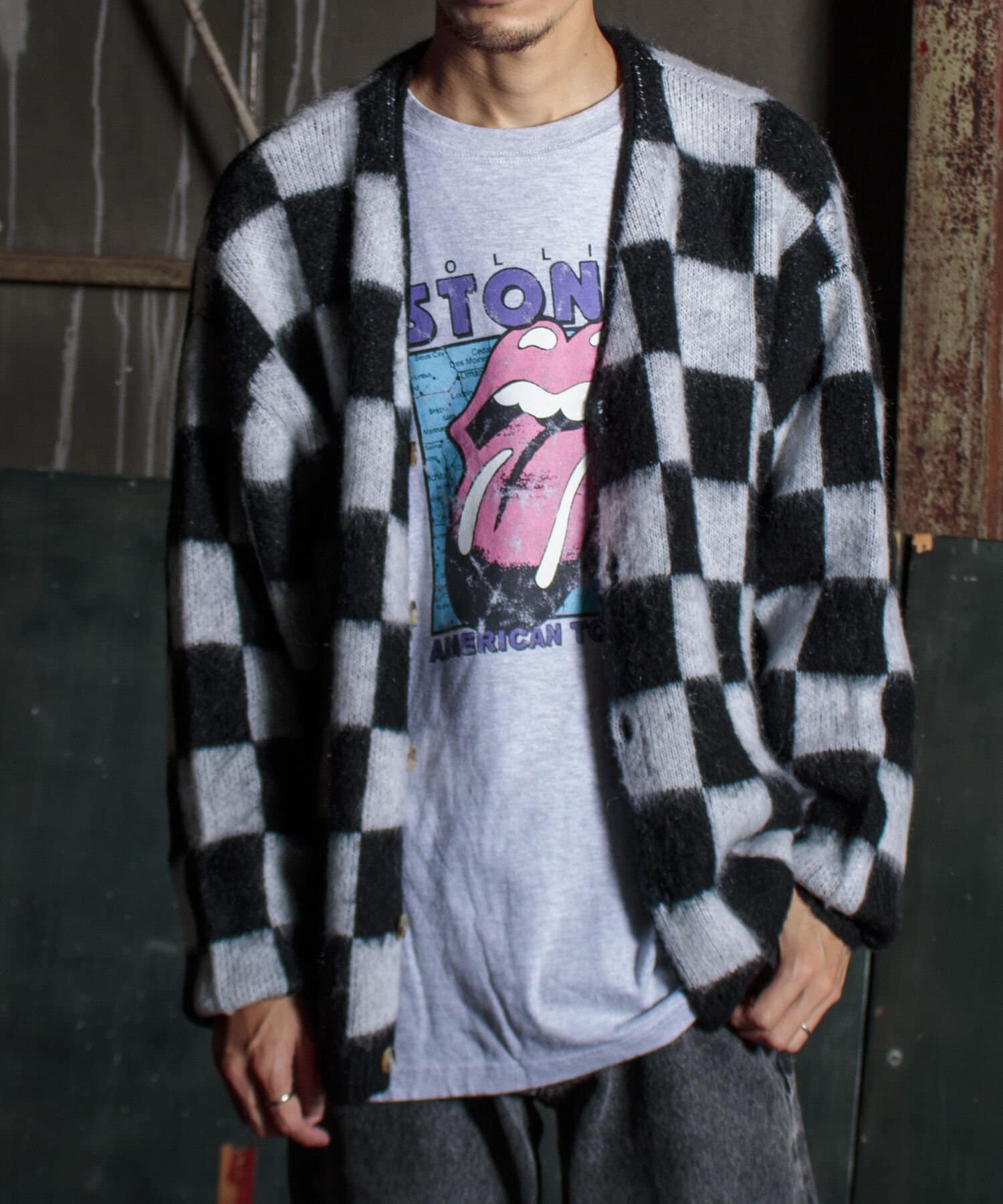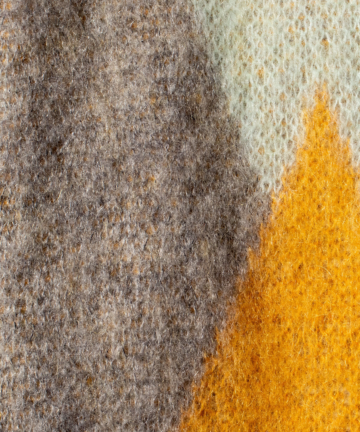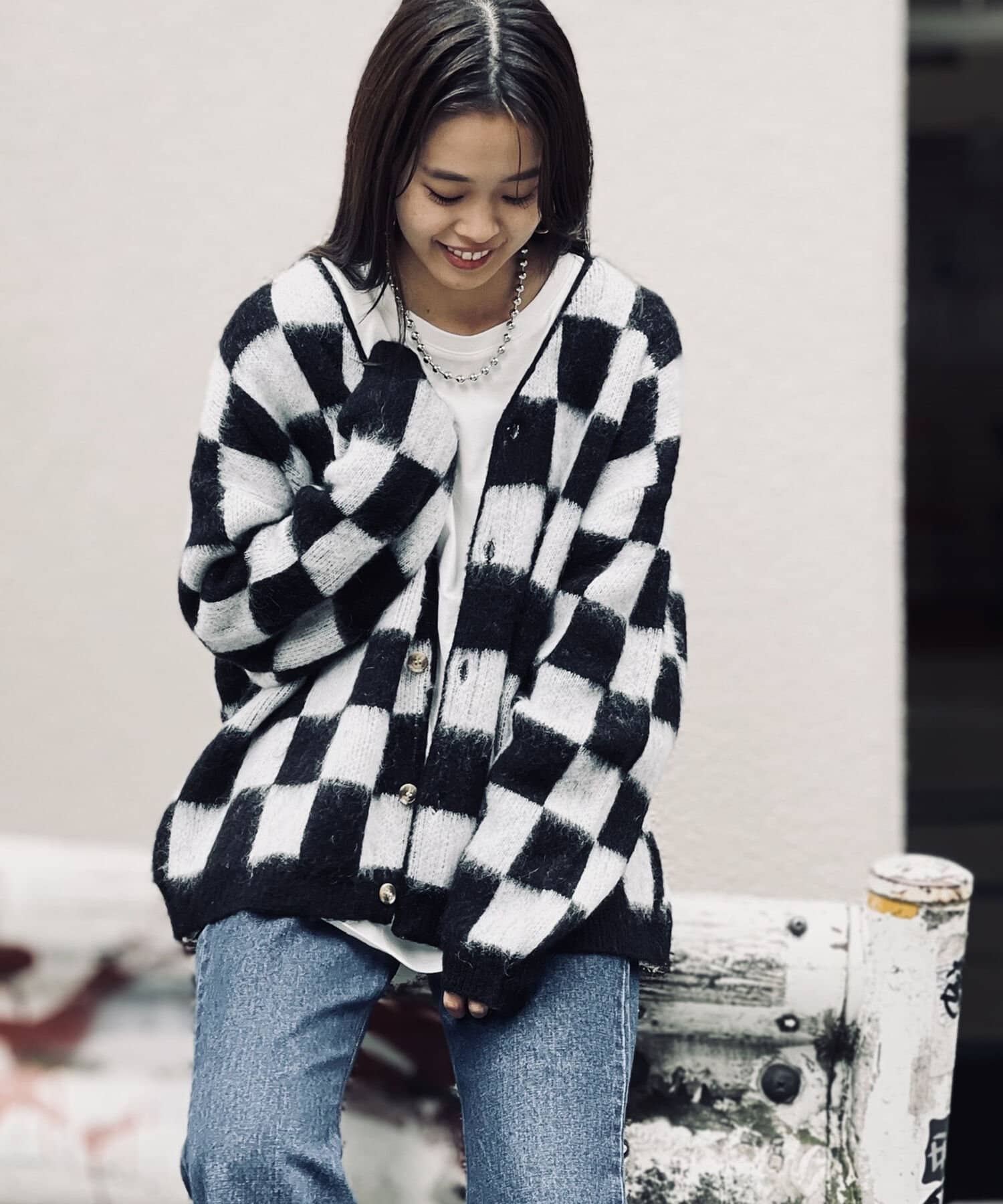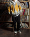 毛足の長いモヘア混カーデにインパクト大な柄をのせた1枚!