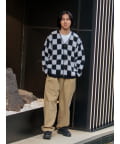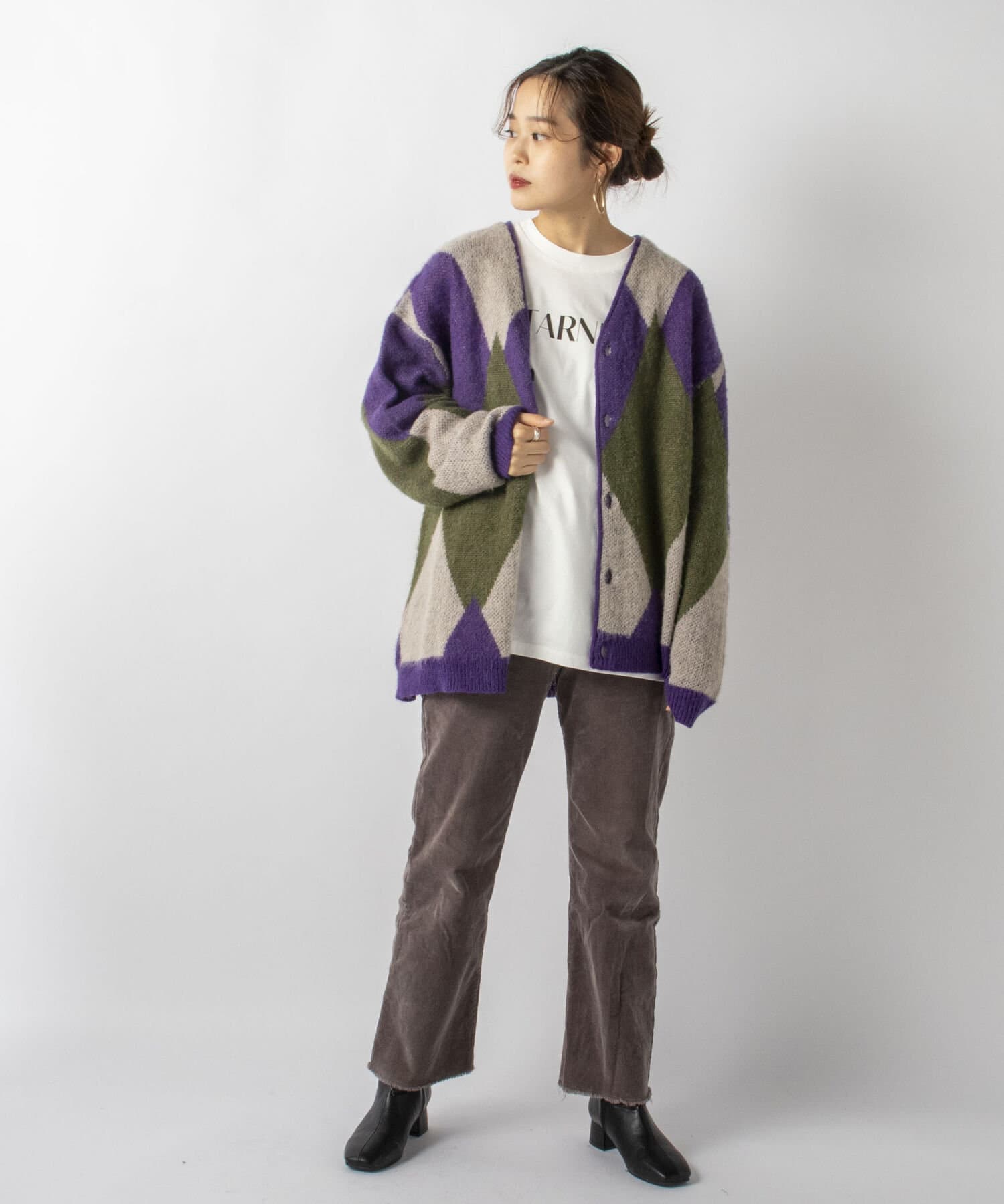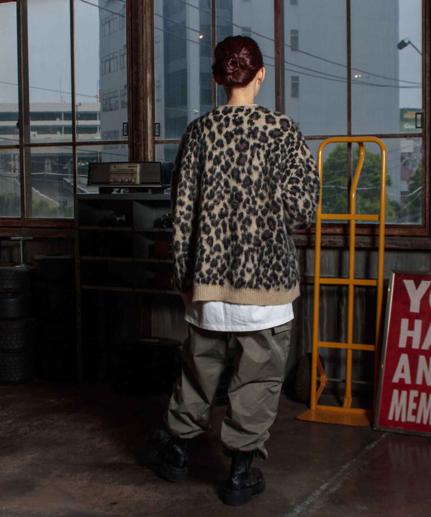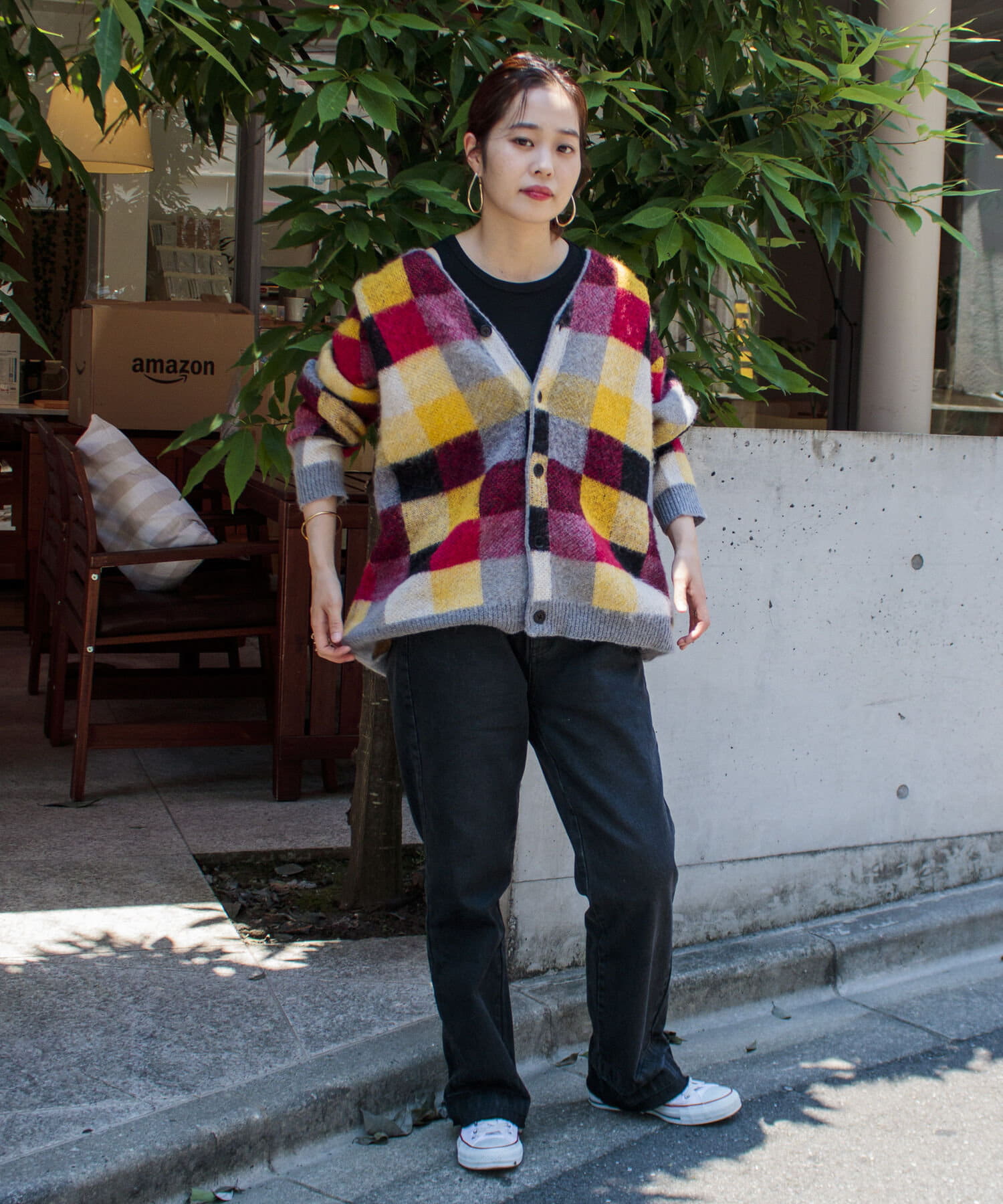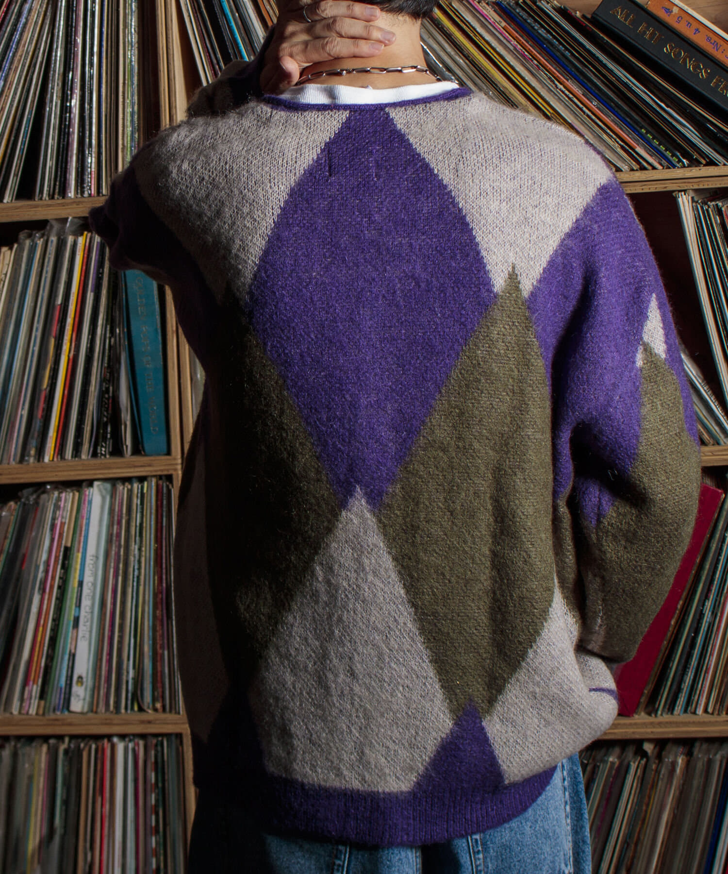 毛足の長いモヘア混カーデにインパクト大な柄をのせた1枚!