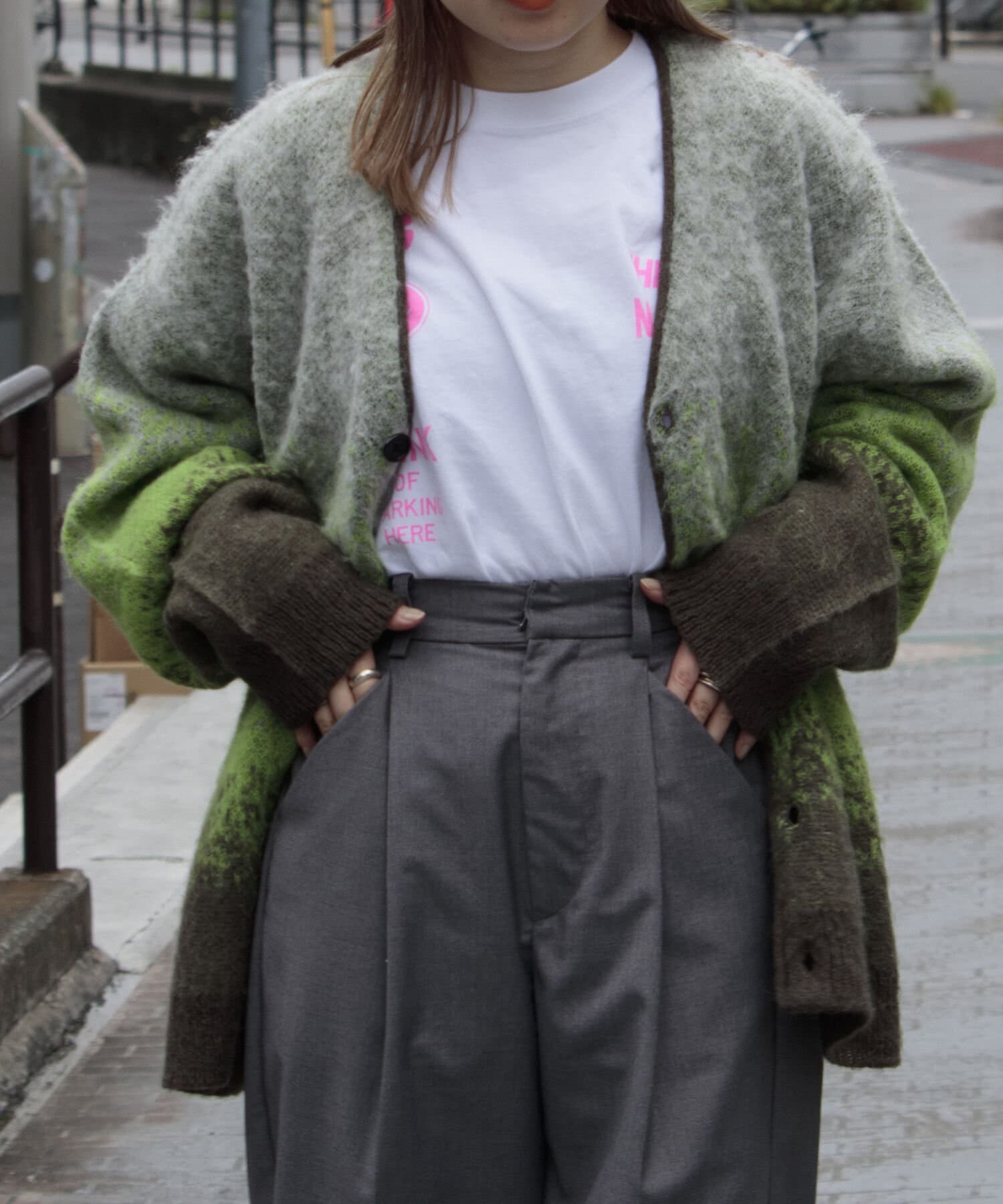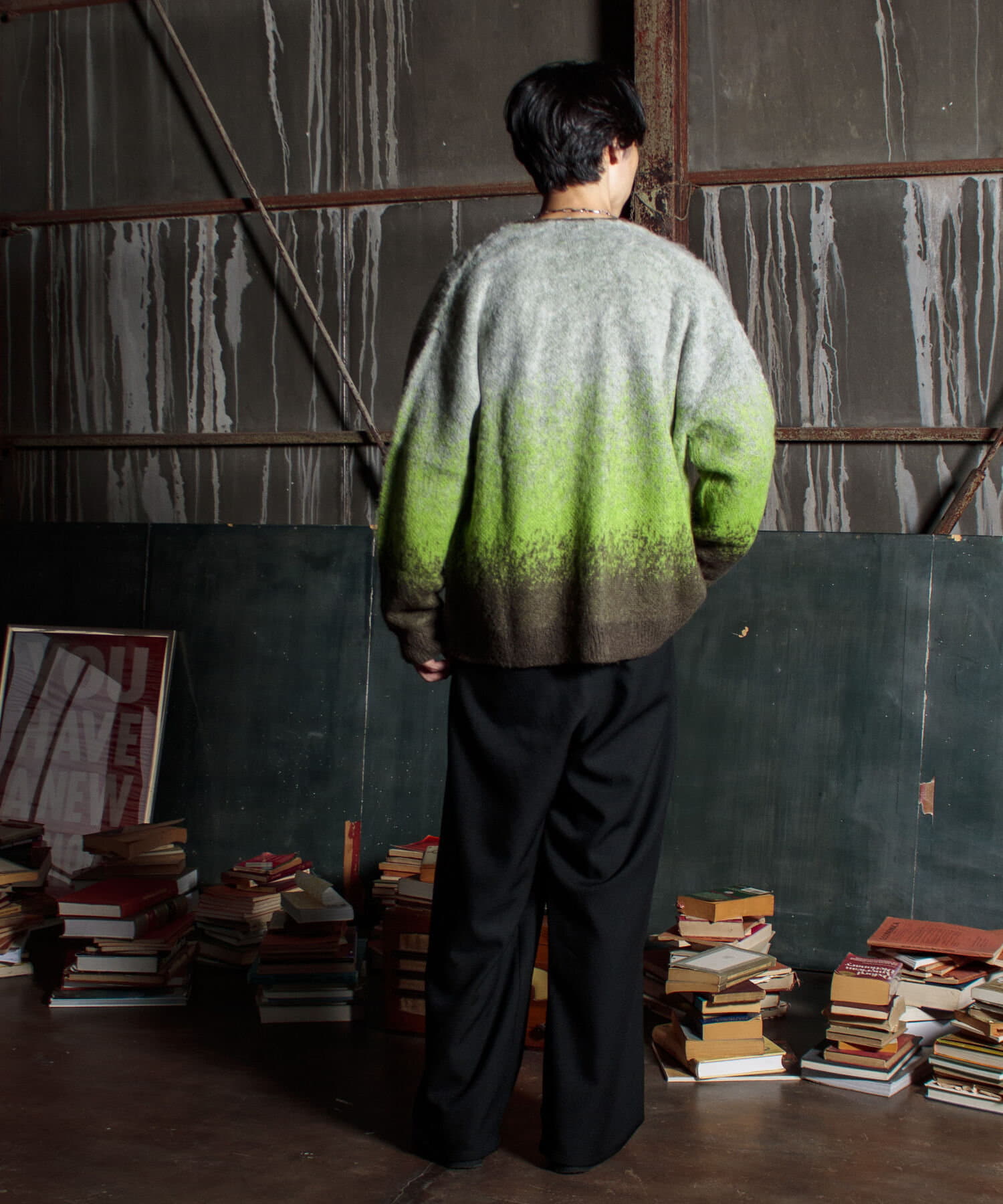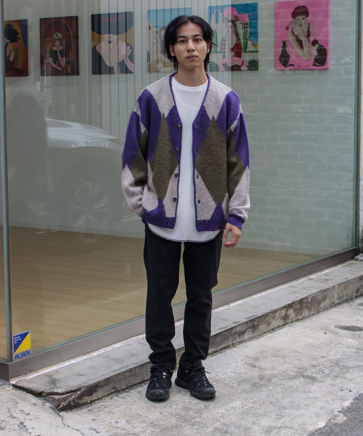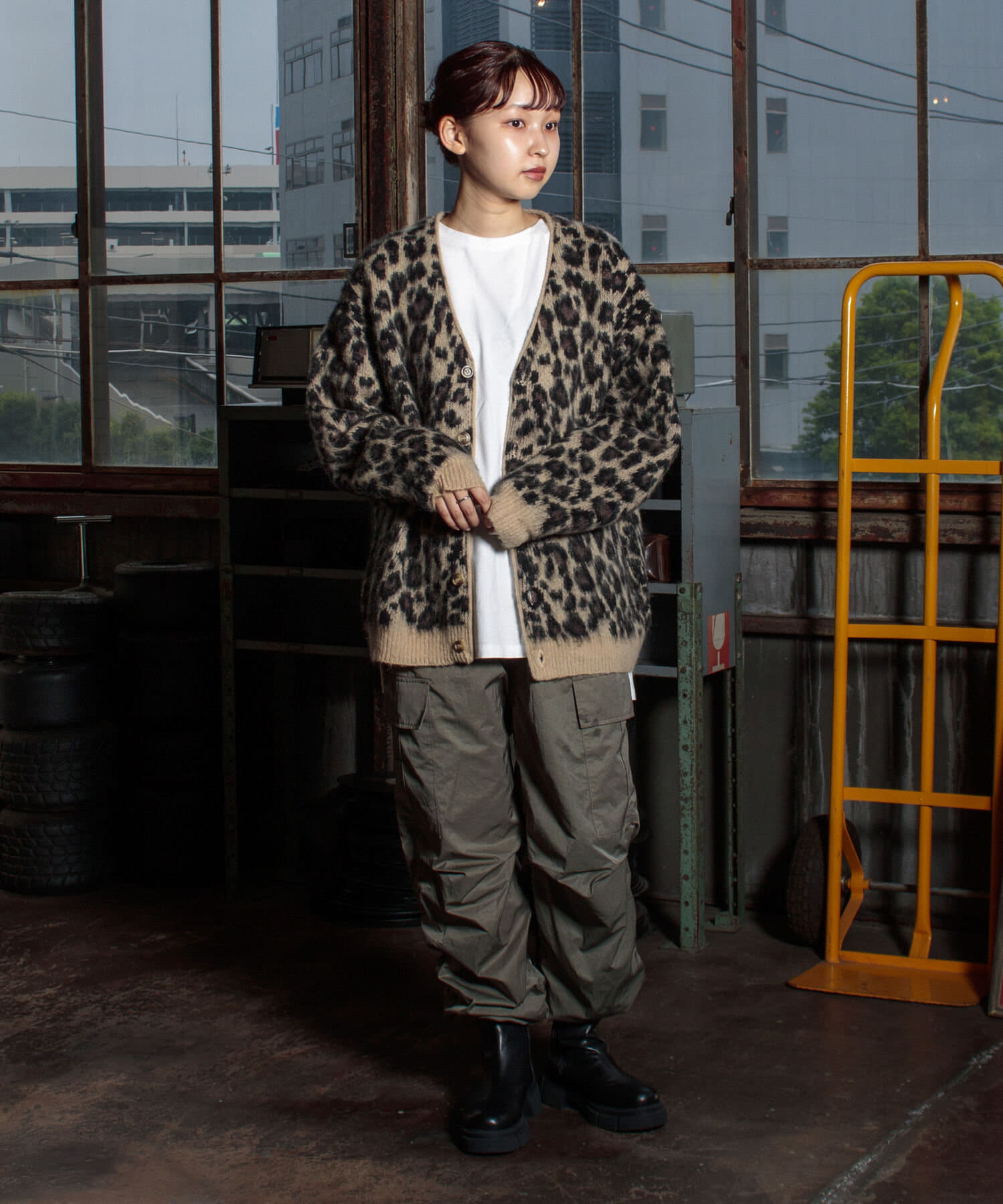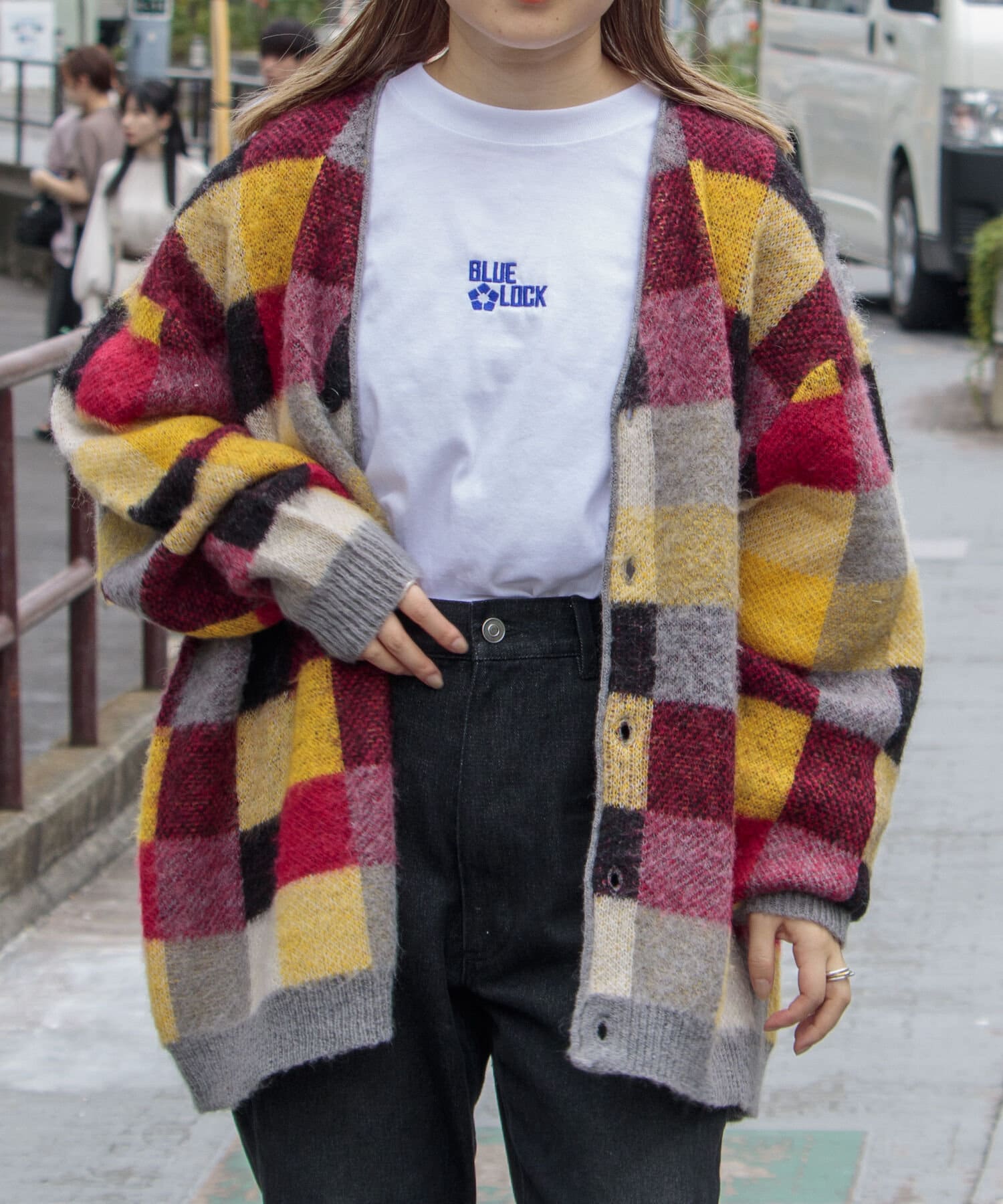 毛足の長いモヘア混カーデにインパクト大な柄をのせた1枚!