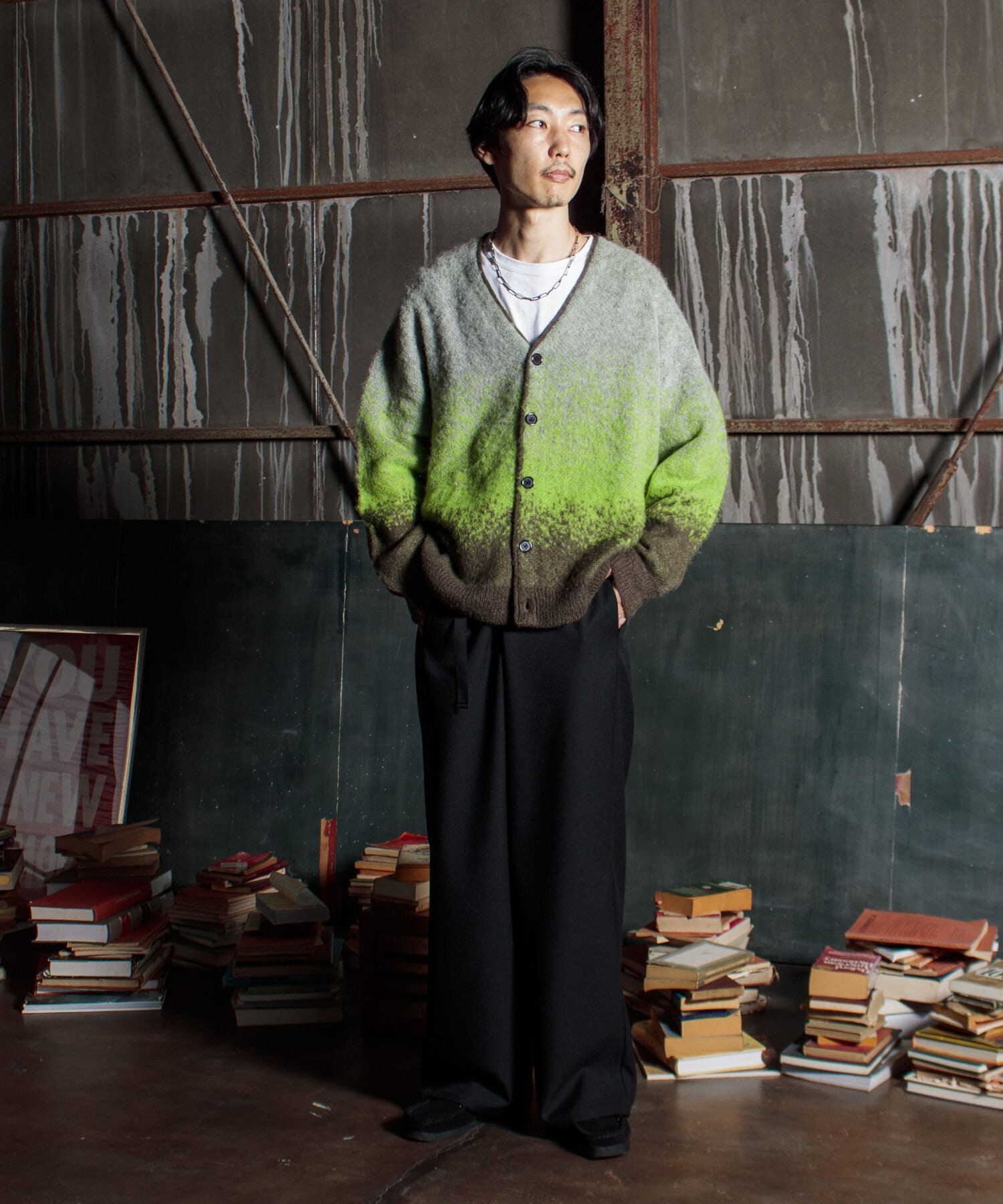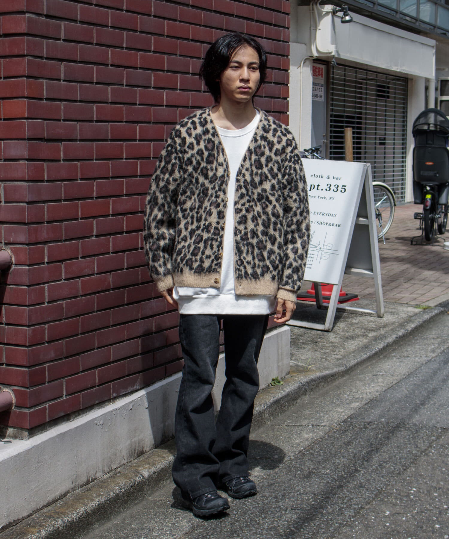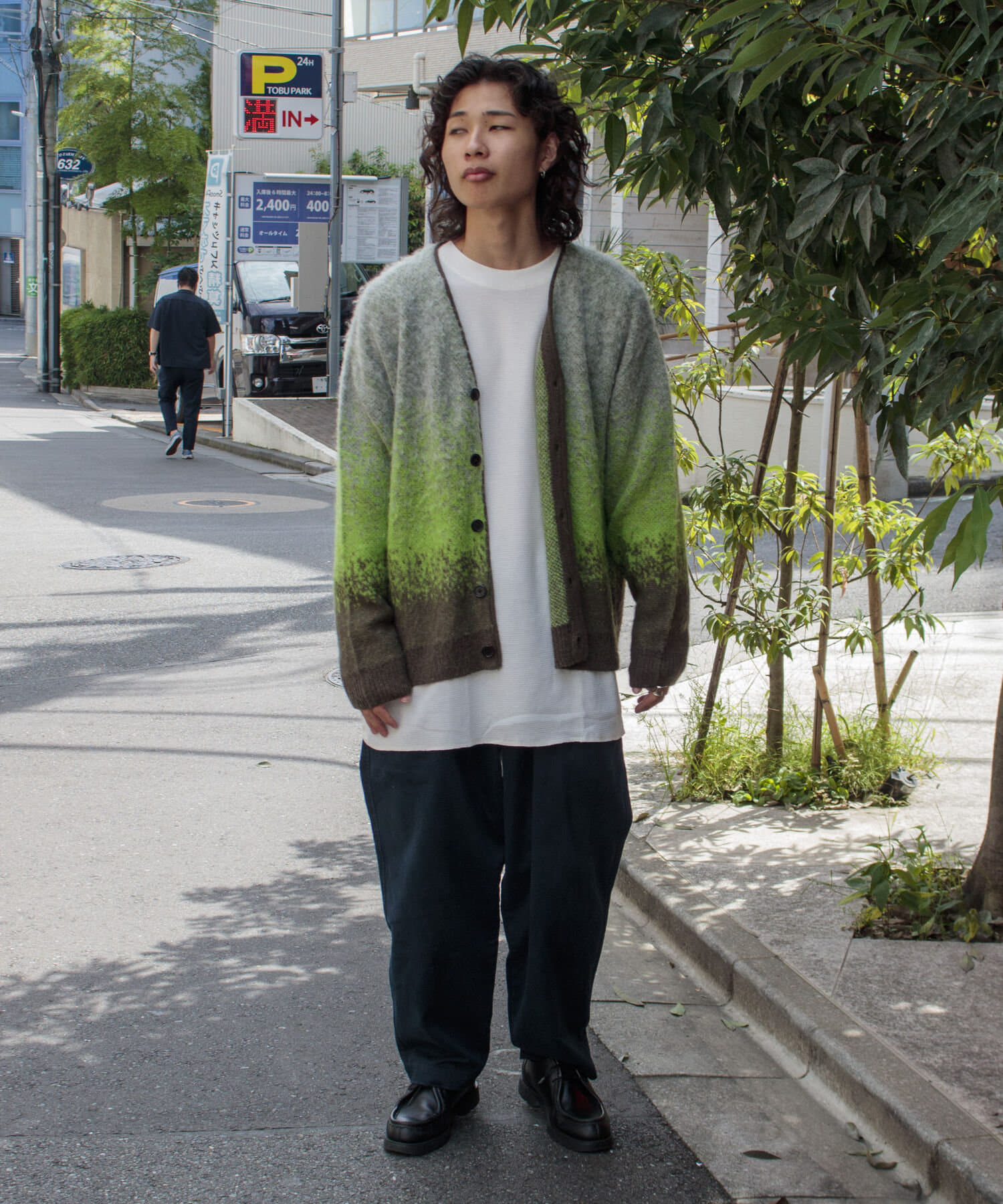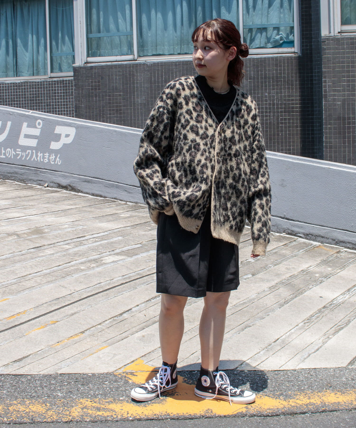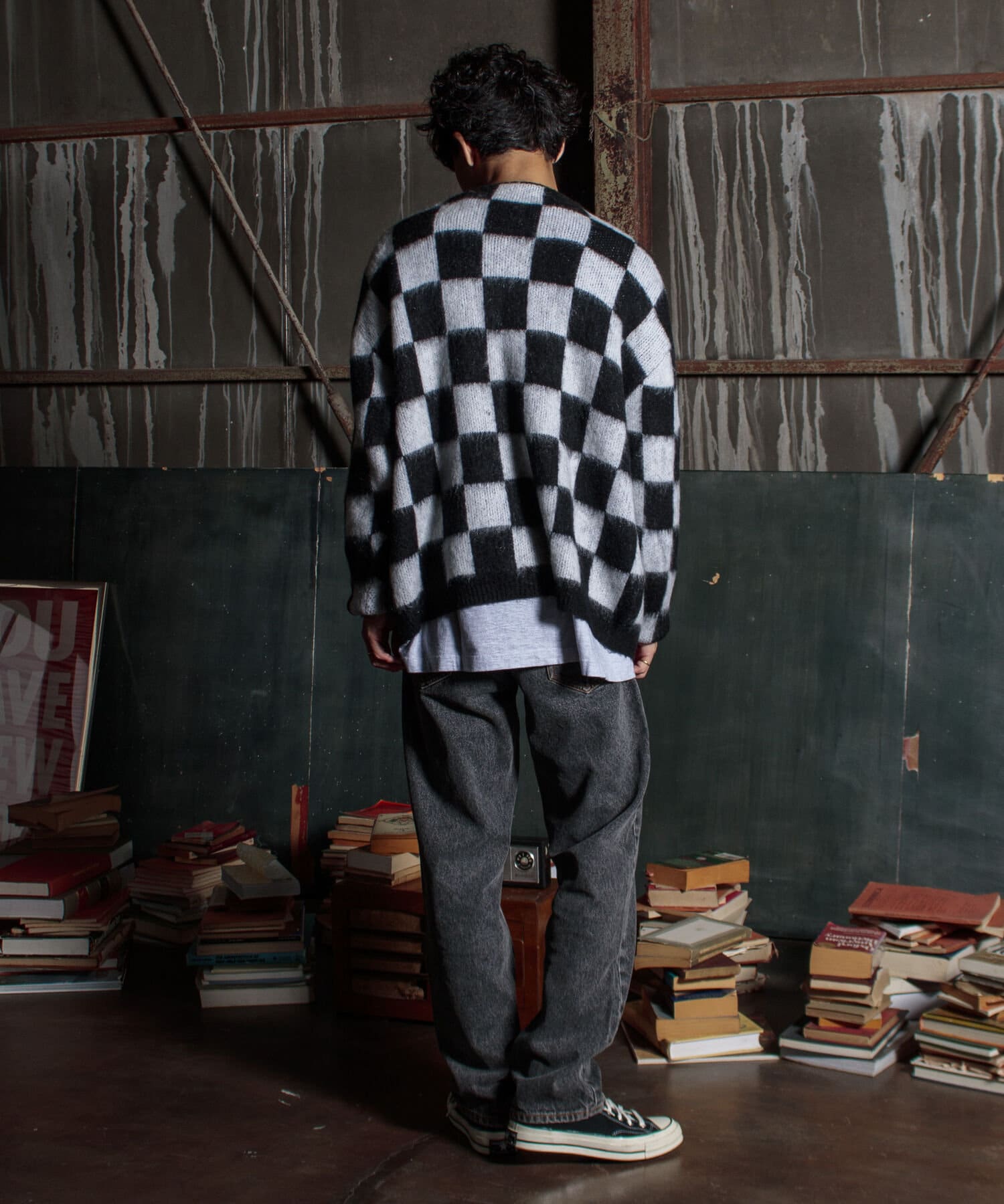 毛足の長いモヘア混カーデにインパクト大な柄をのせた1枚!