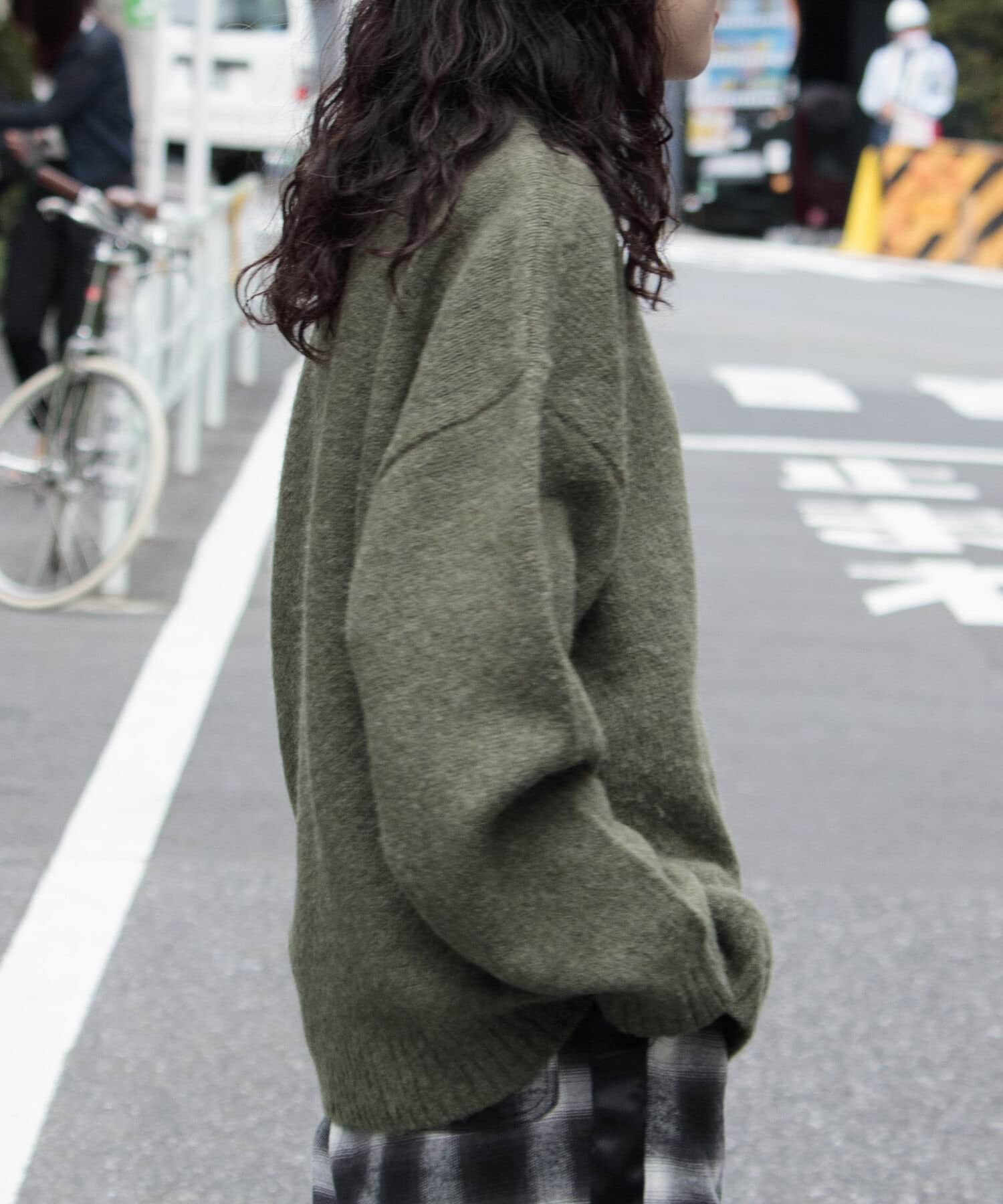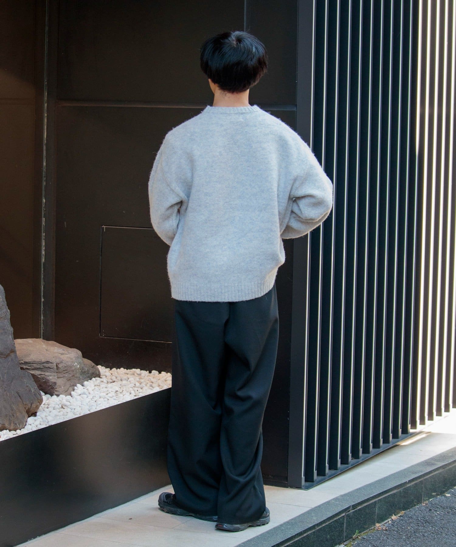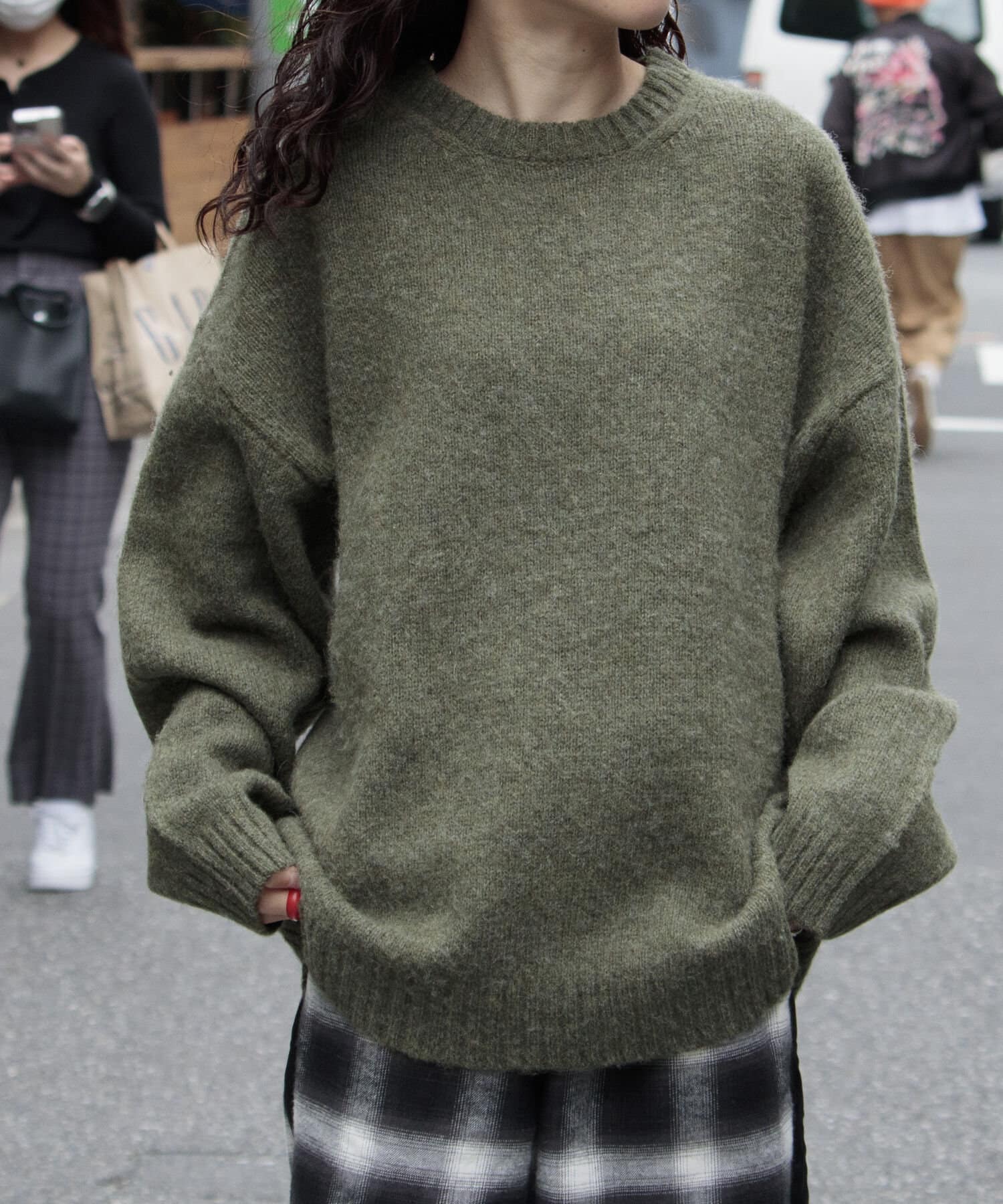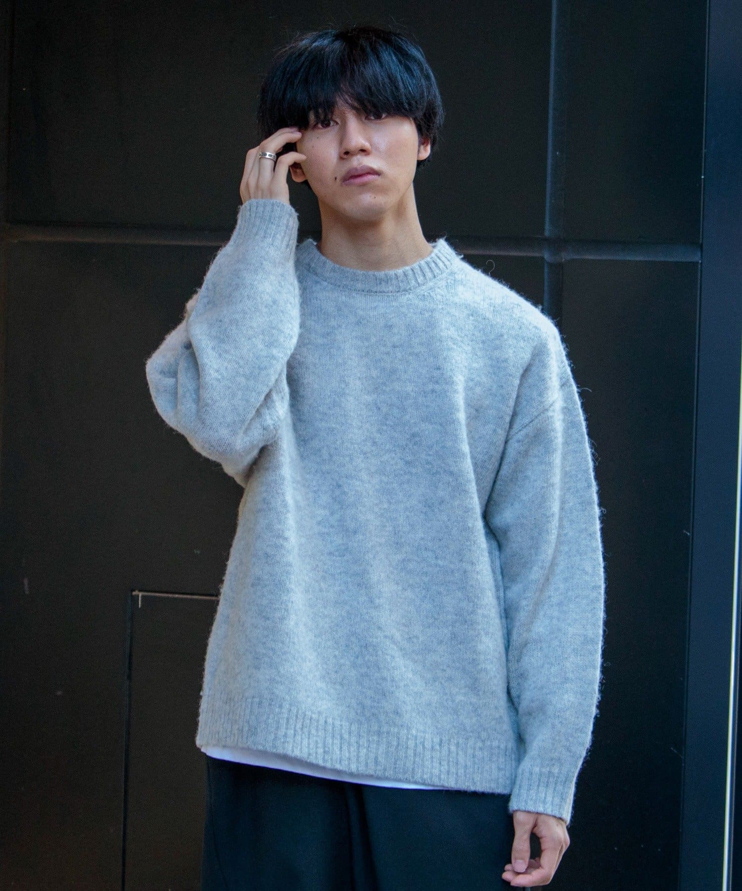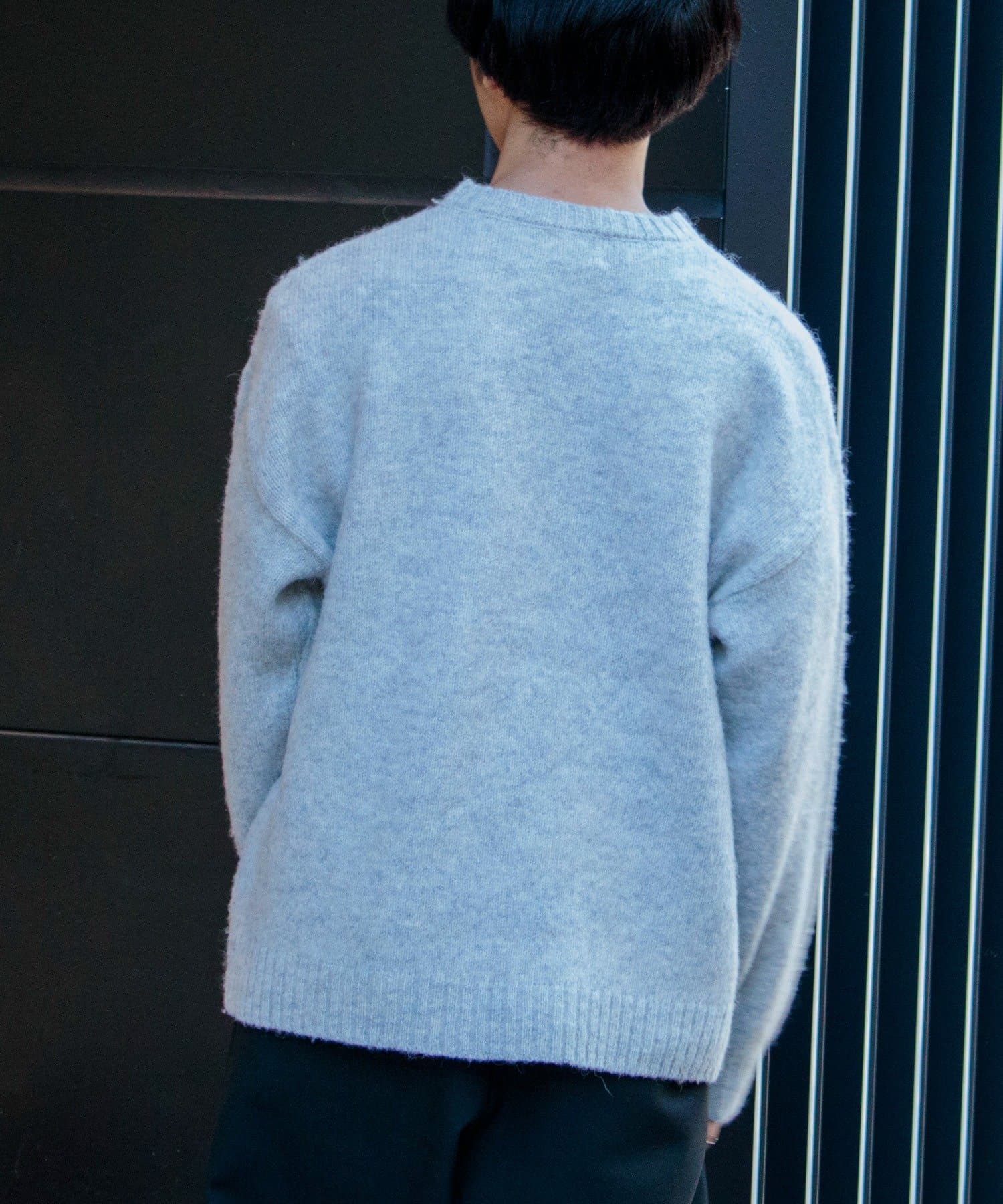 ウール高混率の糸を贅沢に使用し、ムク犬のようなふわふわの起毛加工を施したビッグシルエットのニットプルオーバー。