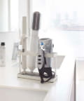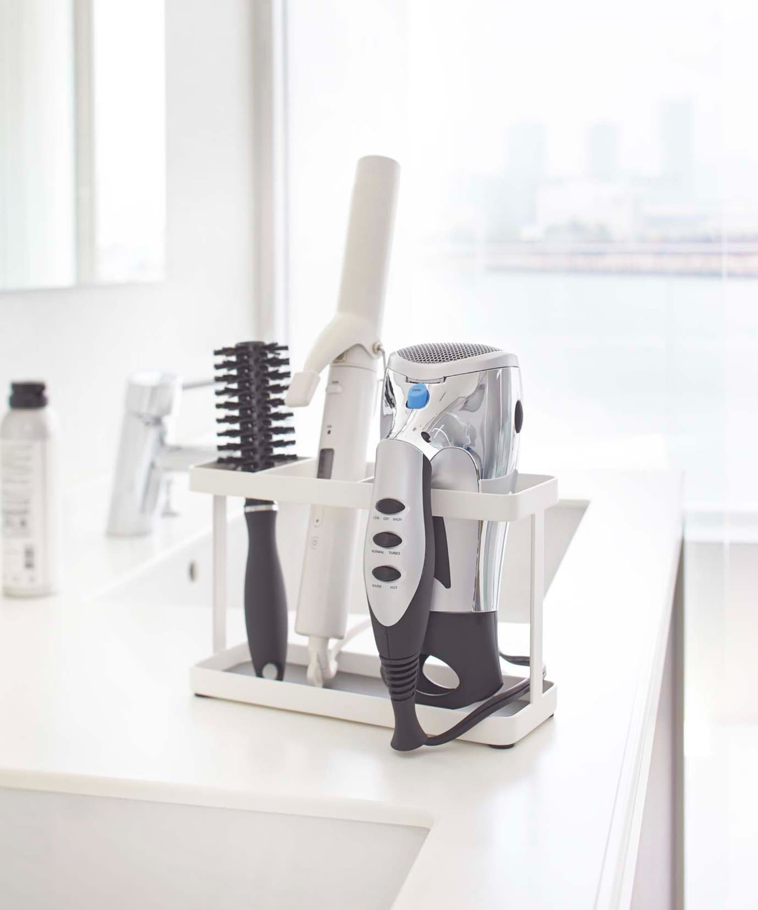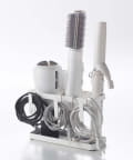 置き場所に困るドライヤーやヘアアイロンをスッキリまとめて同時収納。洗面台に直置きでも、扉に引っ掛けても使える便利な収納スタンドです。