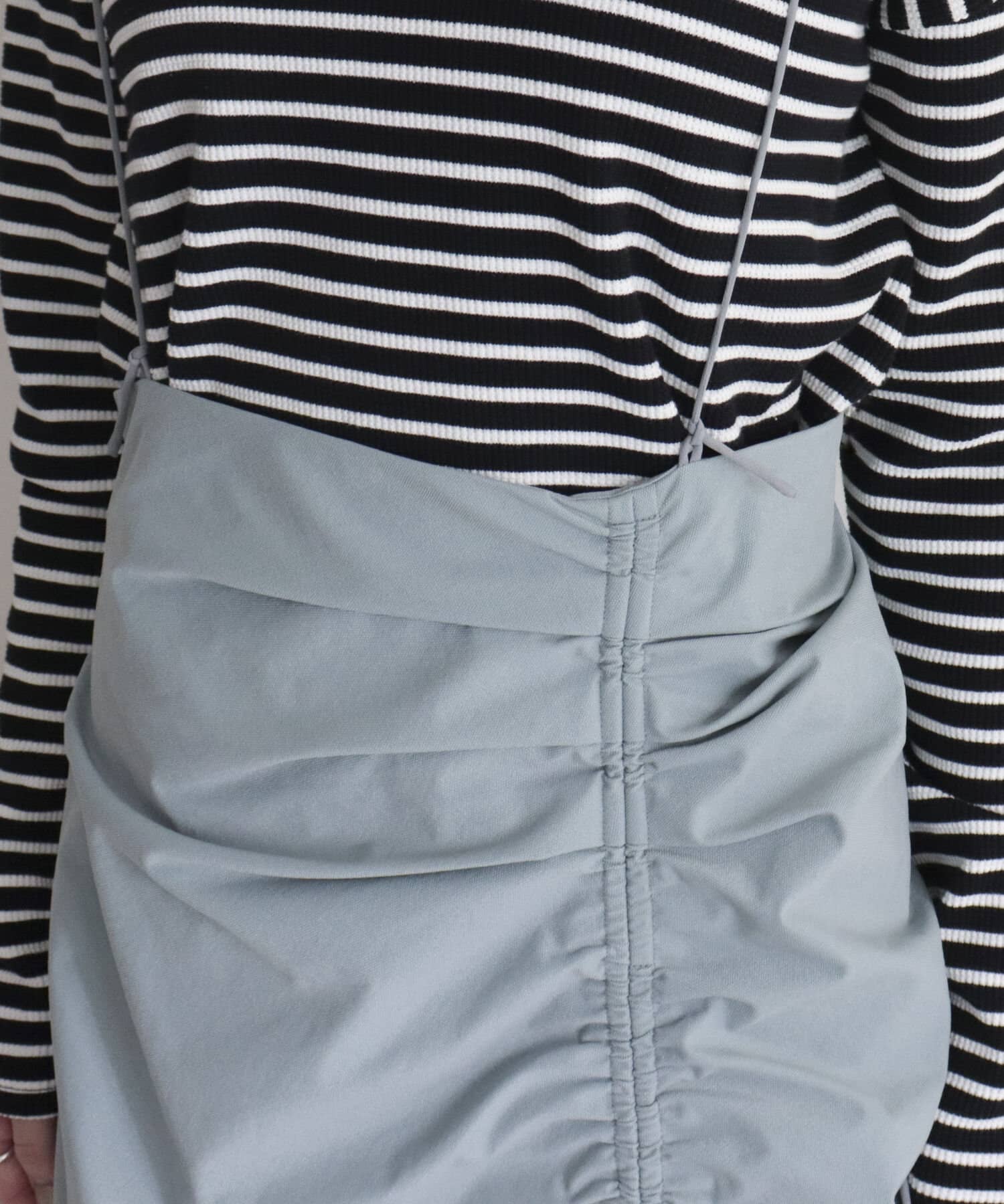 華奢なひも付きでサロペットスカートの着方も楽しめる2WAYタイプで、紐は結び目で取り外しと長さ調節が可能です。