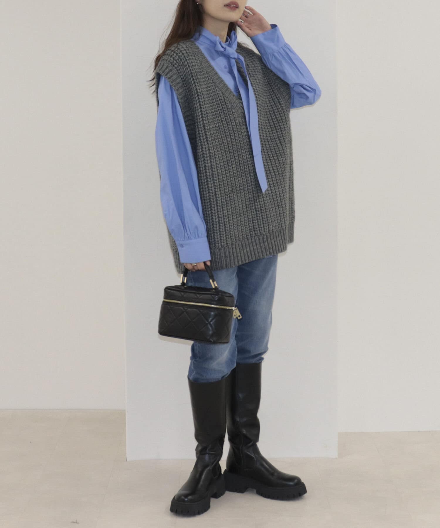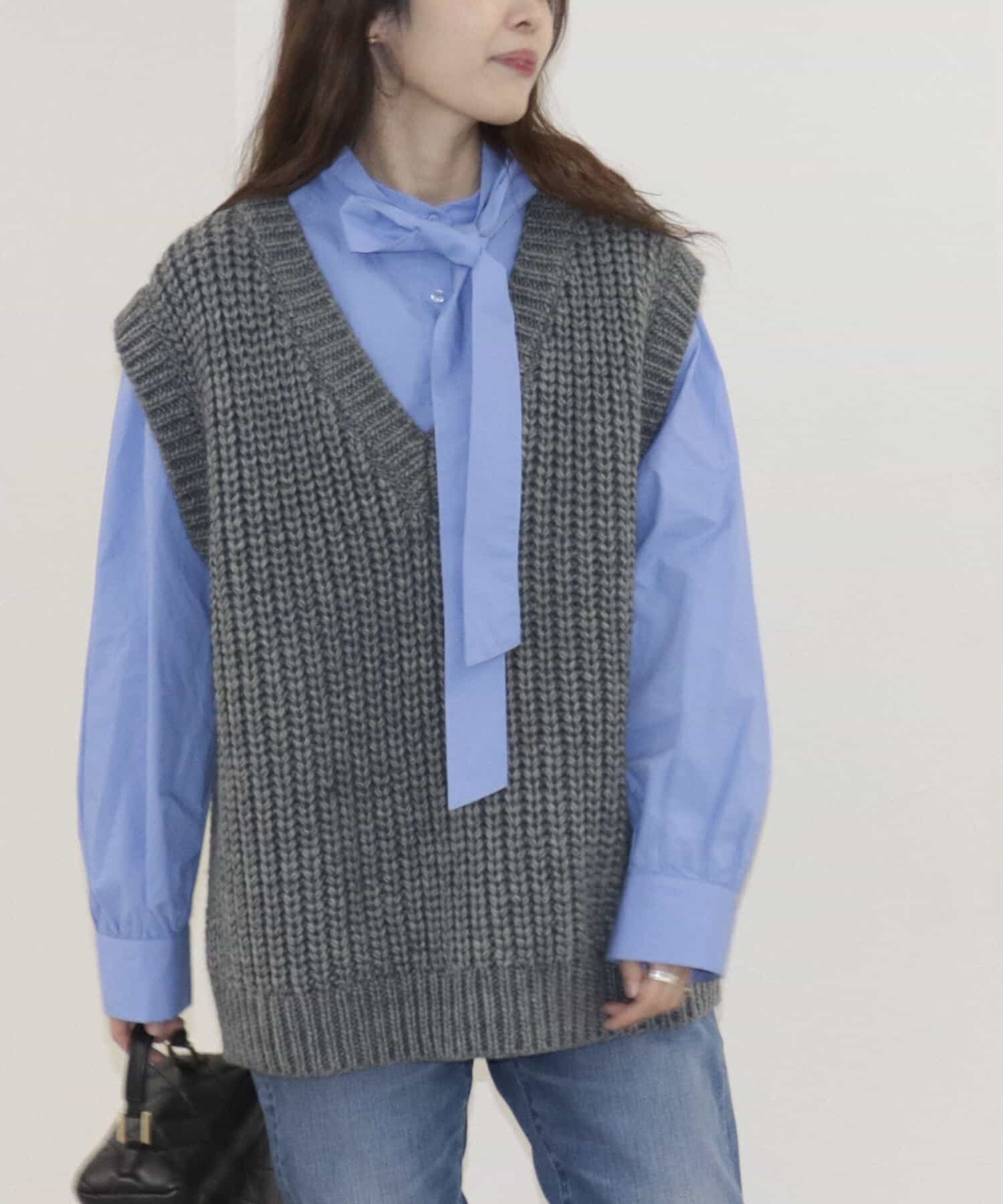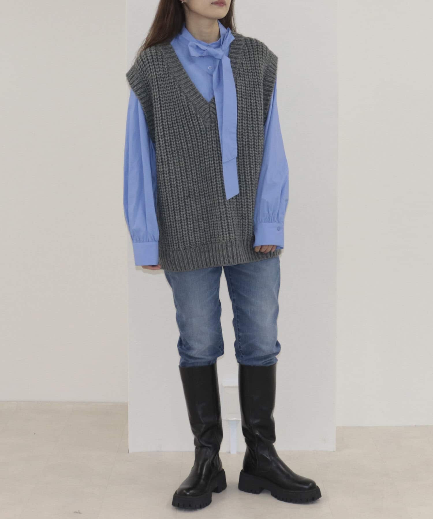 ・ベストは無地で腰周りが程よく隠れる丈感なので別使いでタイトなデニムと合わせても安心感のある着丈。