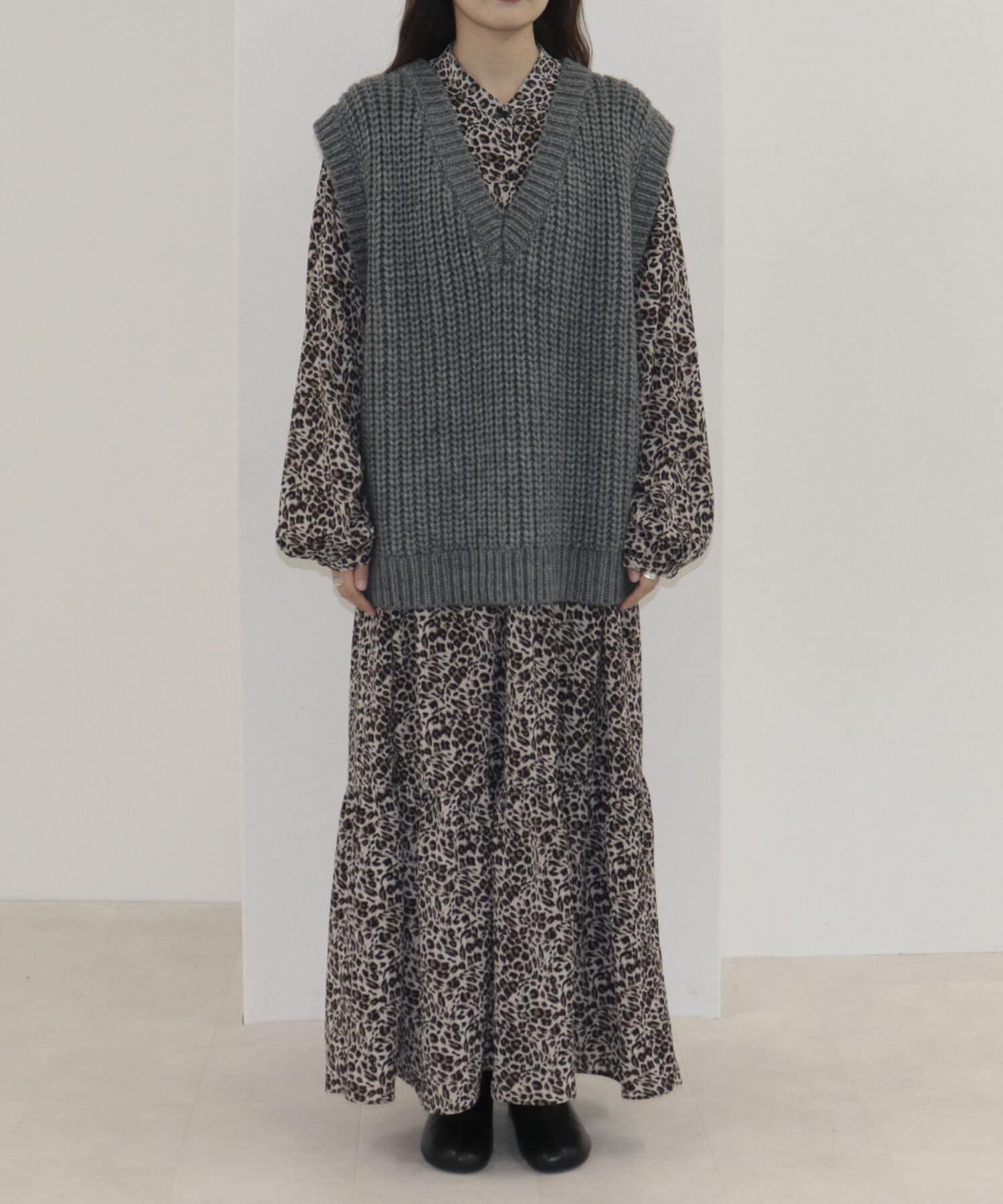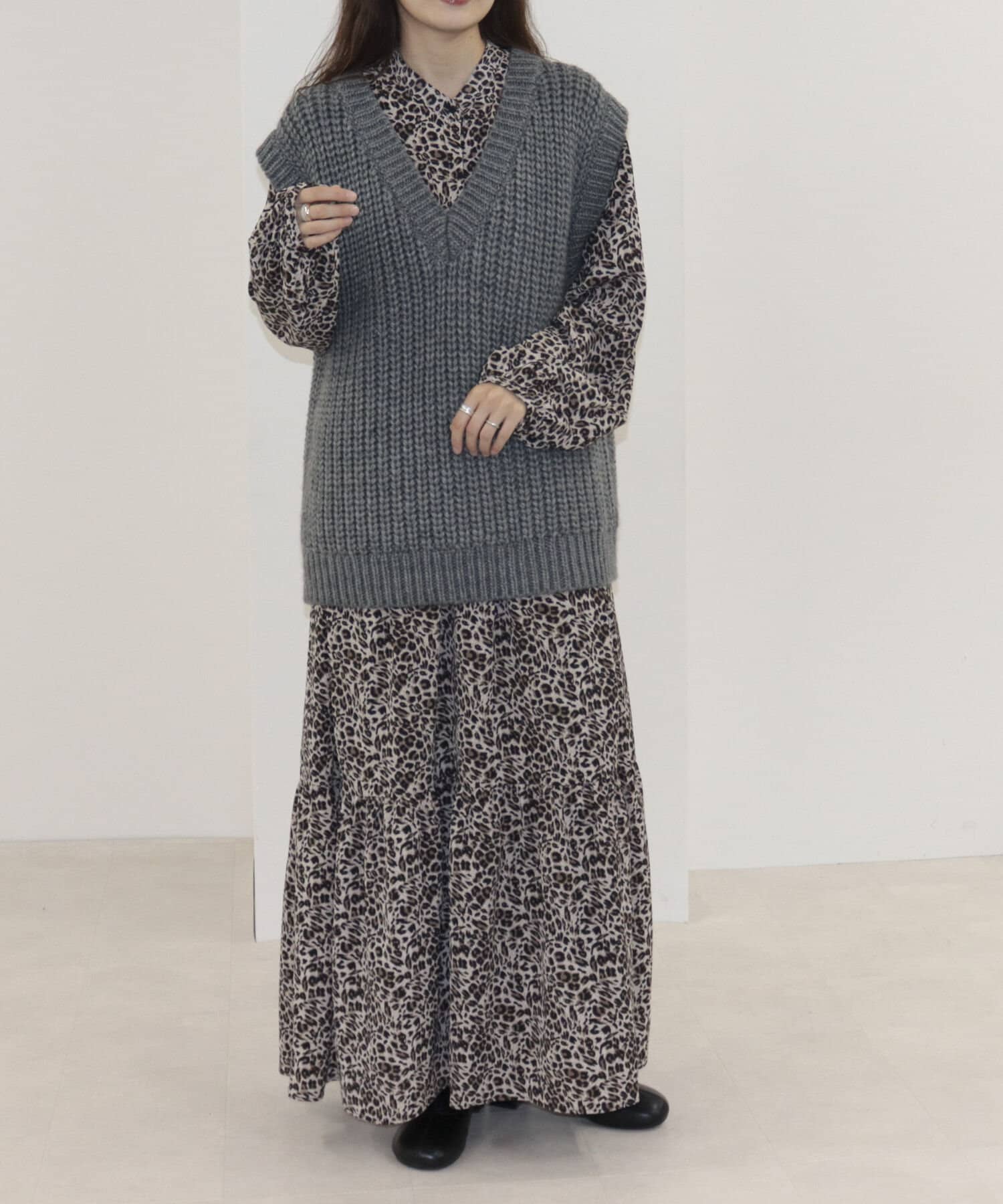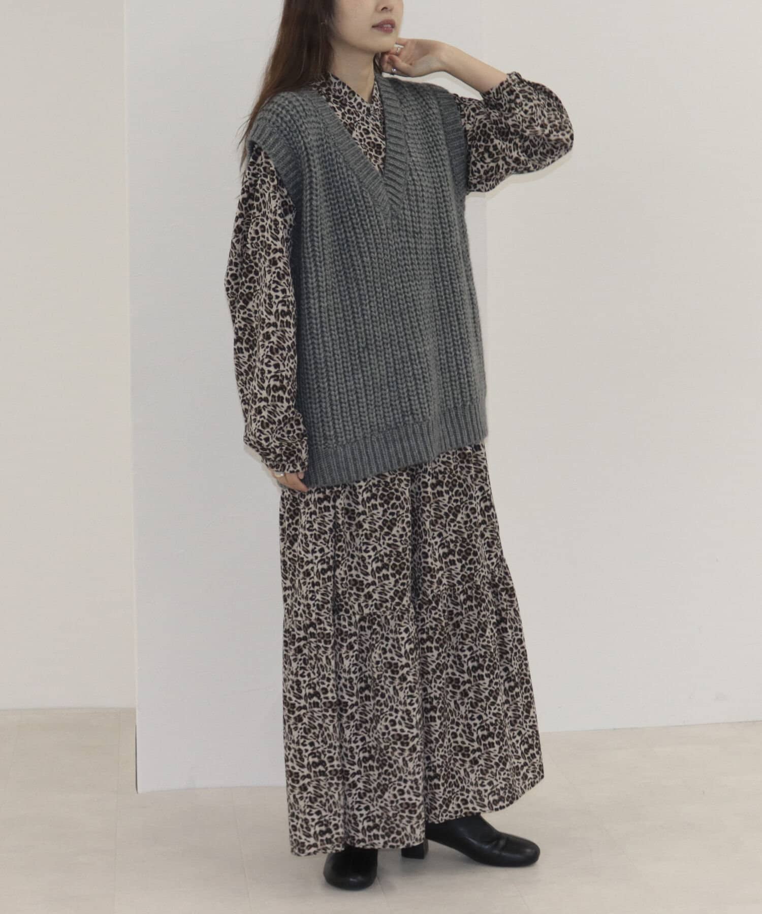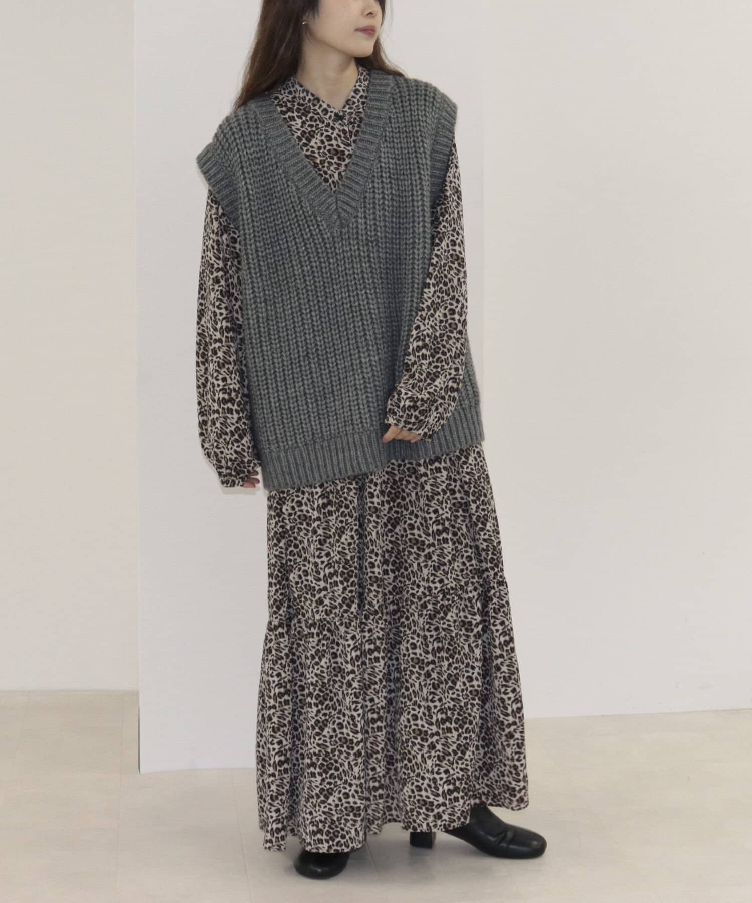 ・ワンピースはサラッとした素材で落ち着いた色味のレオパードプリント。
