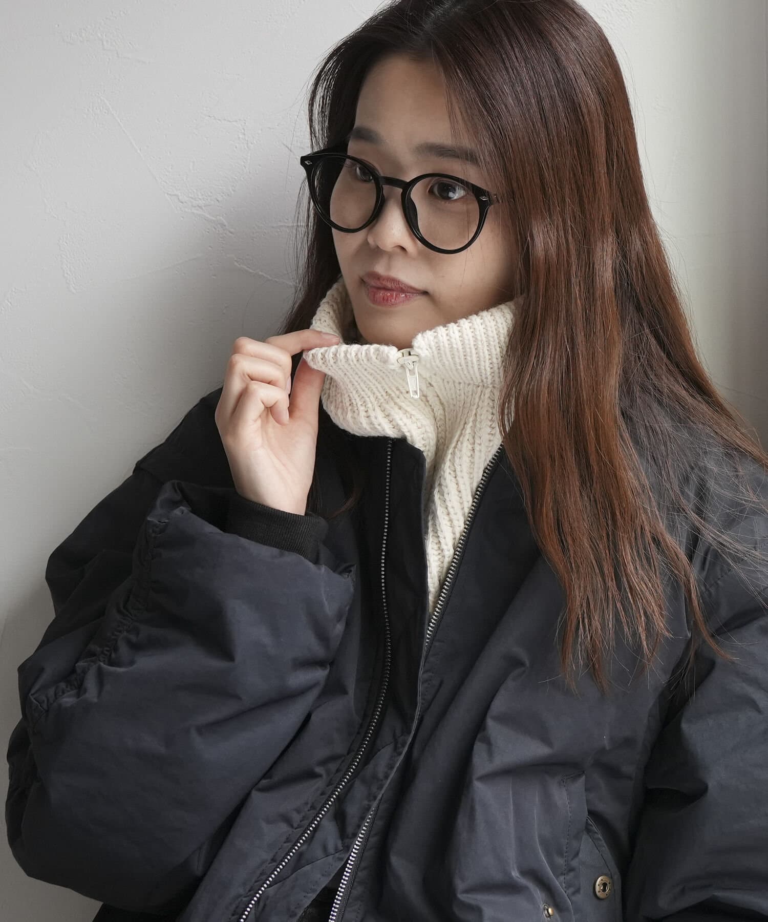 ・ジップを閉じてハイネックに、半分開ければハーフジップの衿付きデザインになります。