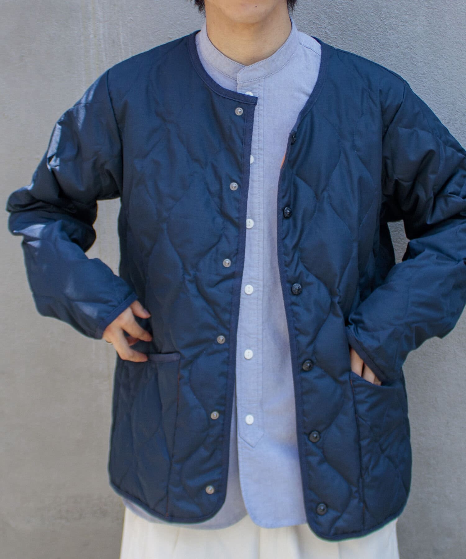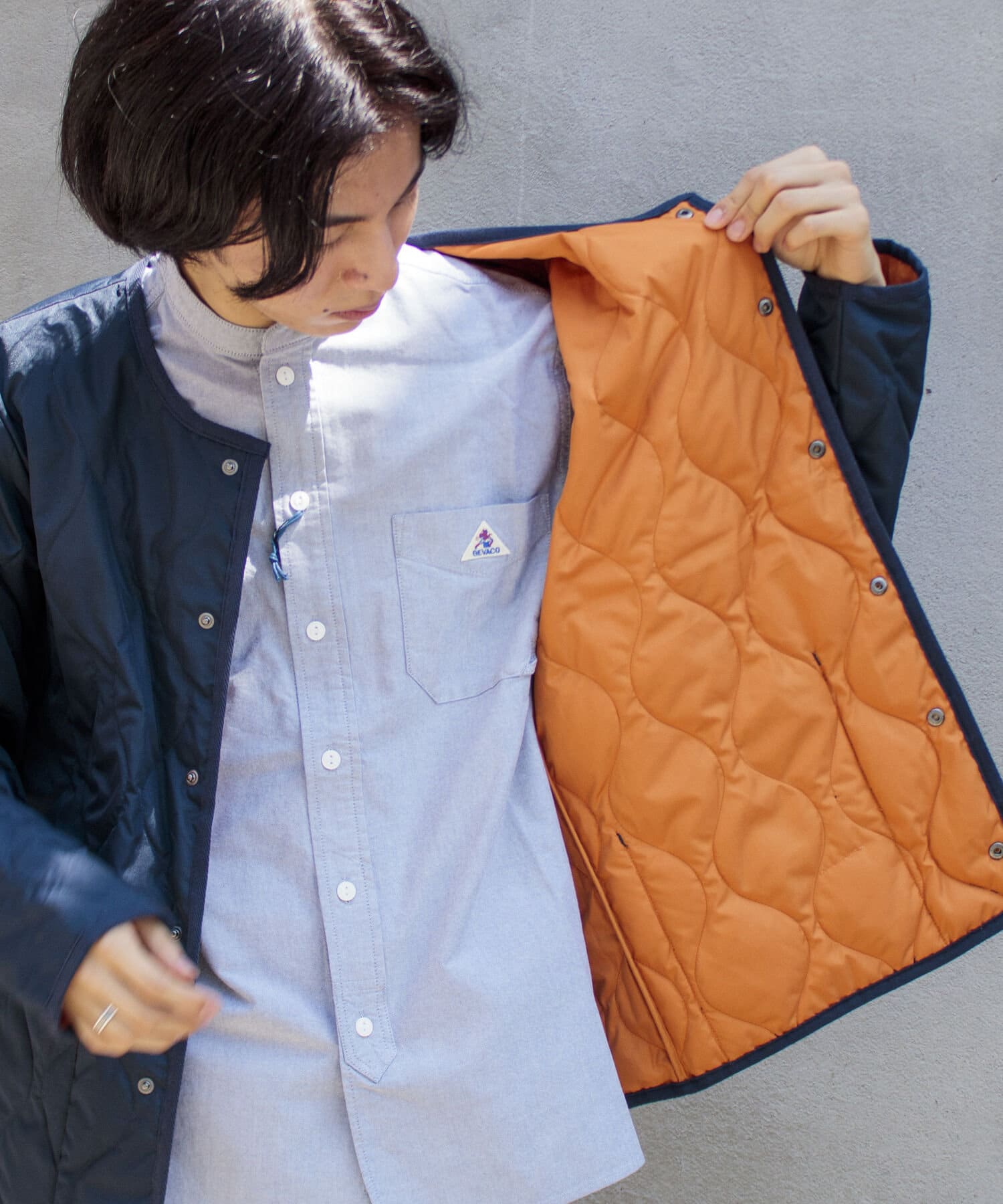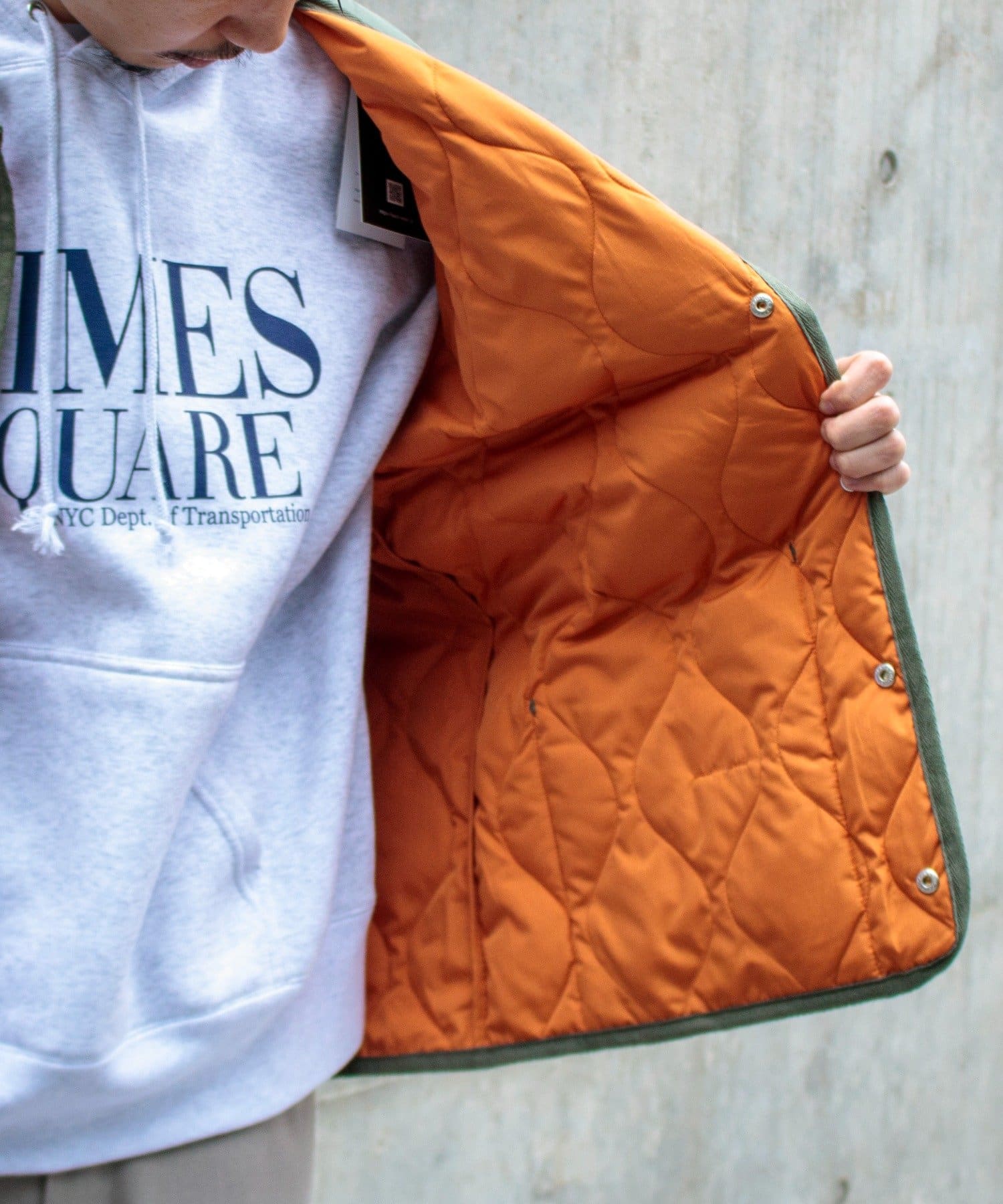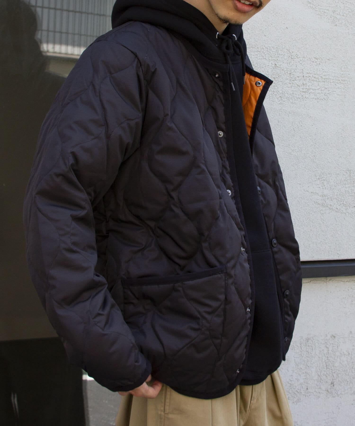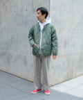 ややオーバーサイズのシルエットに裏地がオレンジなので、MA-1のようなブルゾン感覚での着用はもちろん、インナーダウンのようにコートのインでも活躍する1着に仕上がっています。