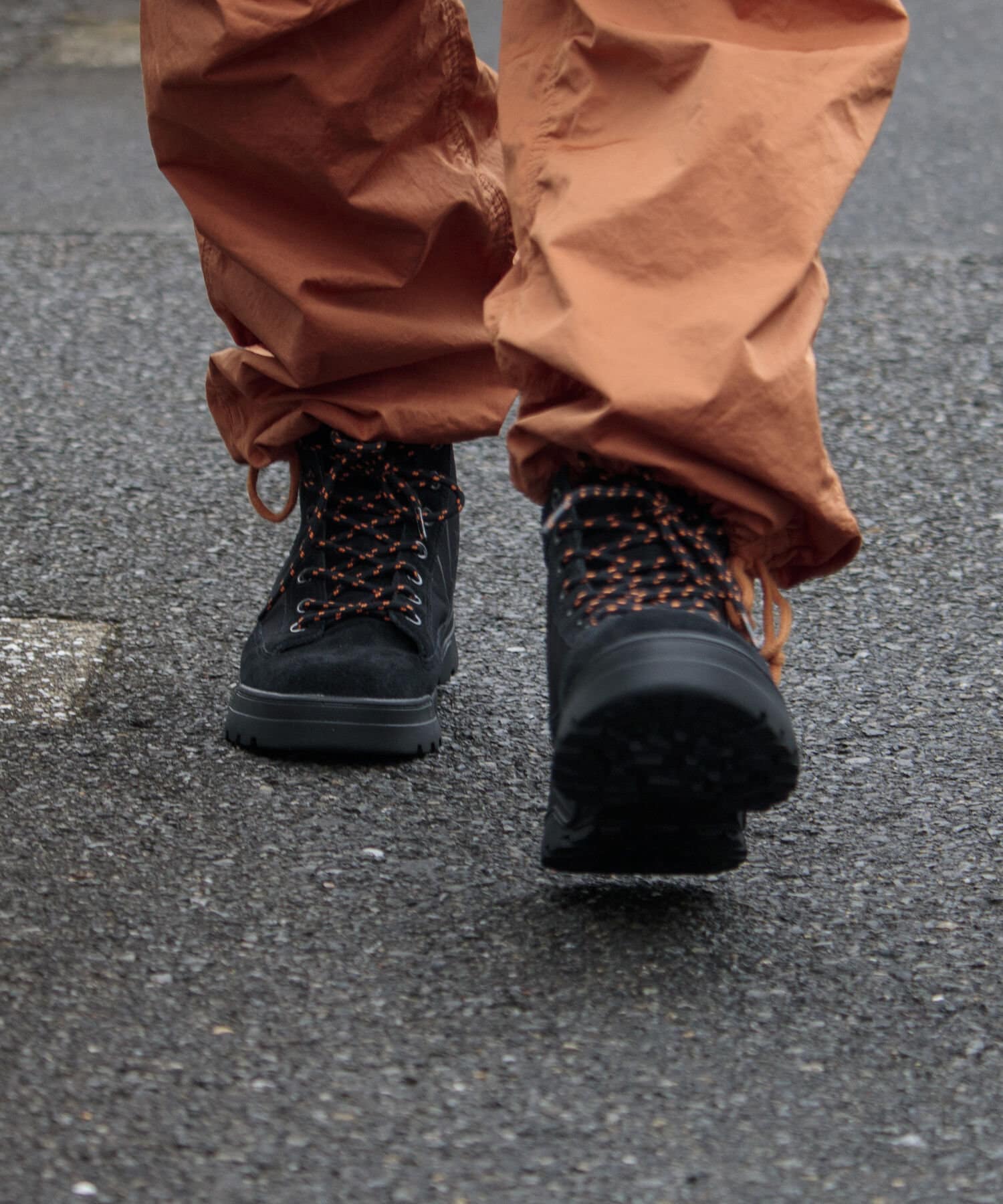 シューレースとインソールに差したビビッドなオレンジ、サイドの外側に落とし込んだミルスペック風にプリントしたモデル名やスペック表記もポイント。