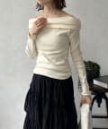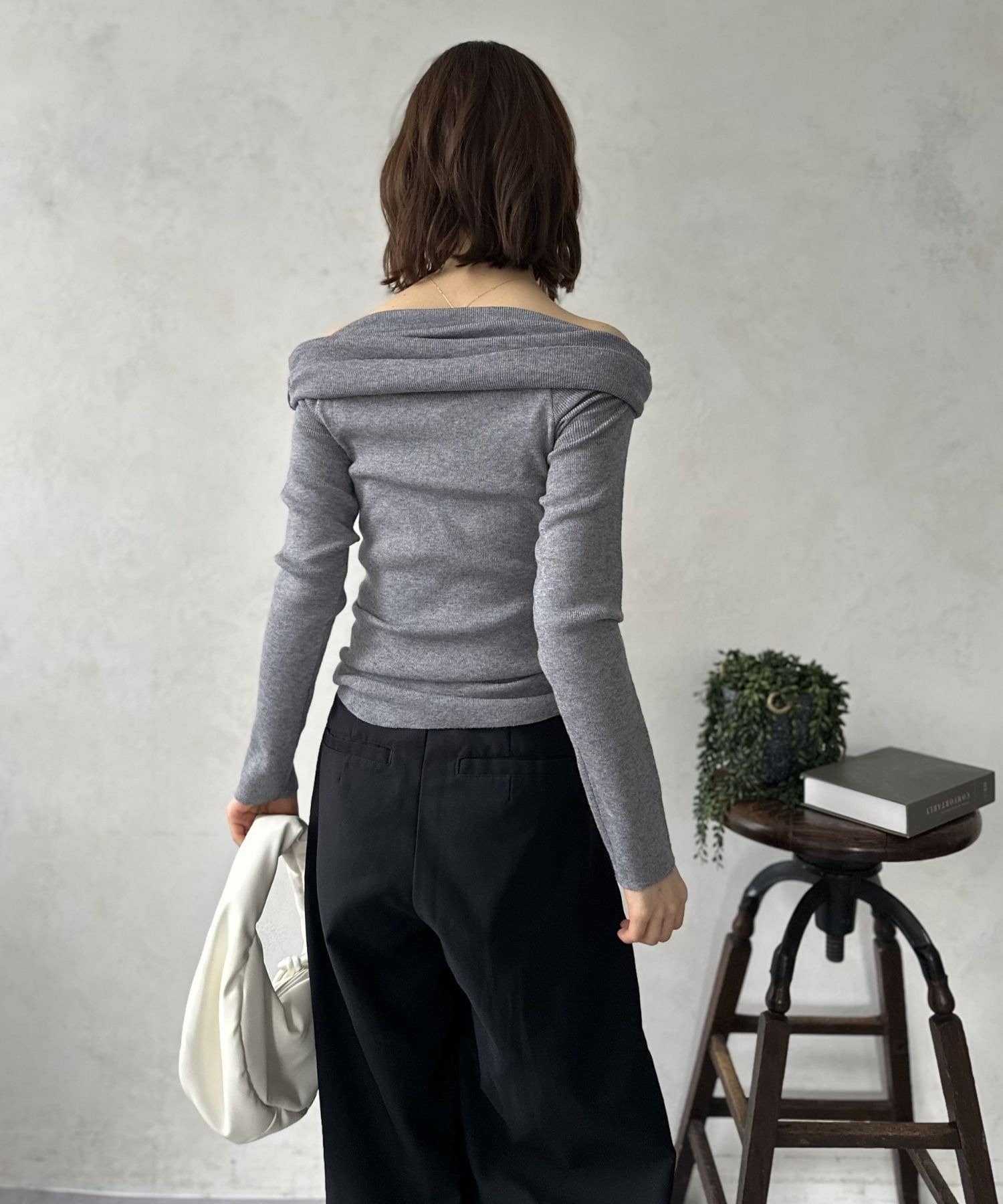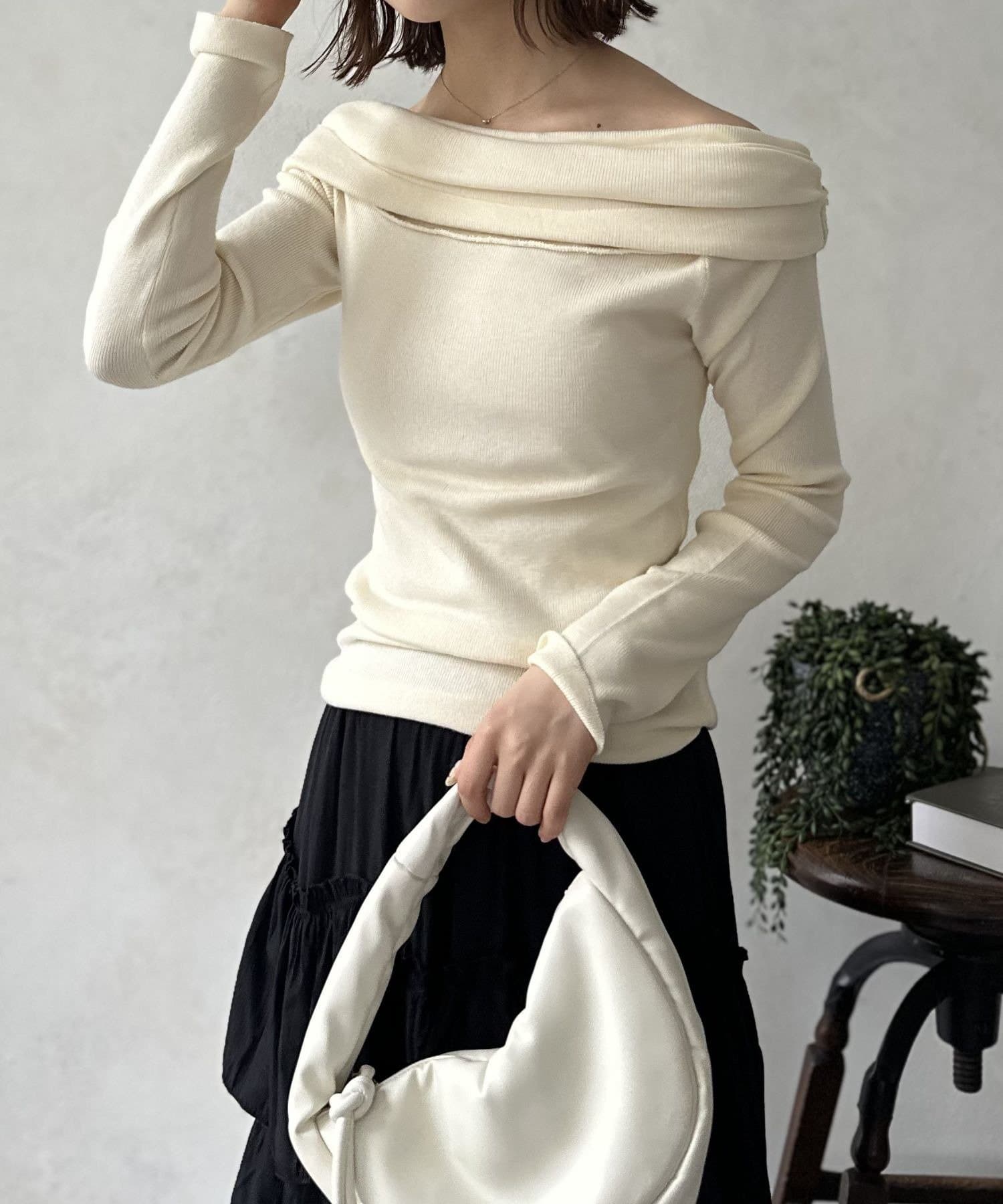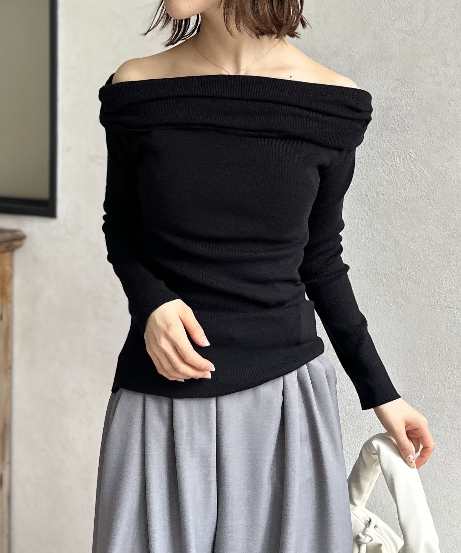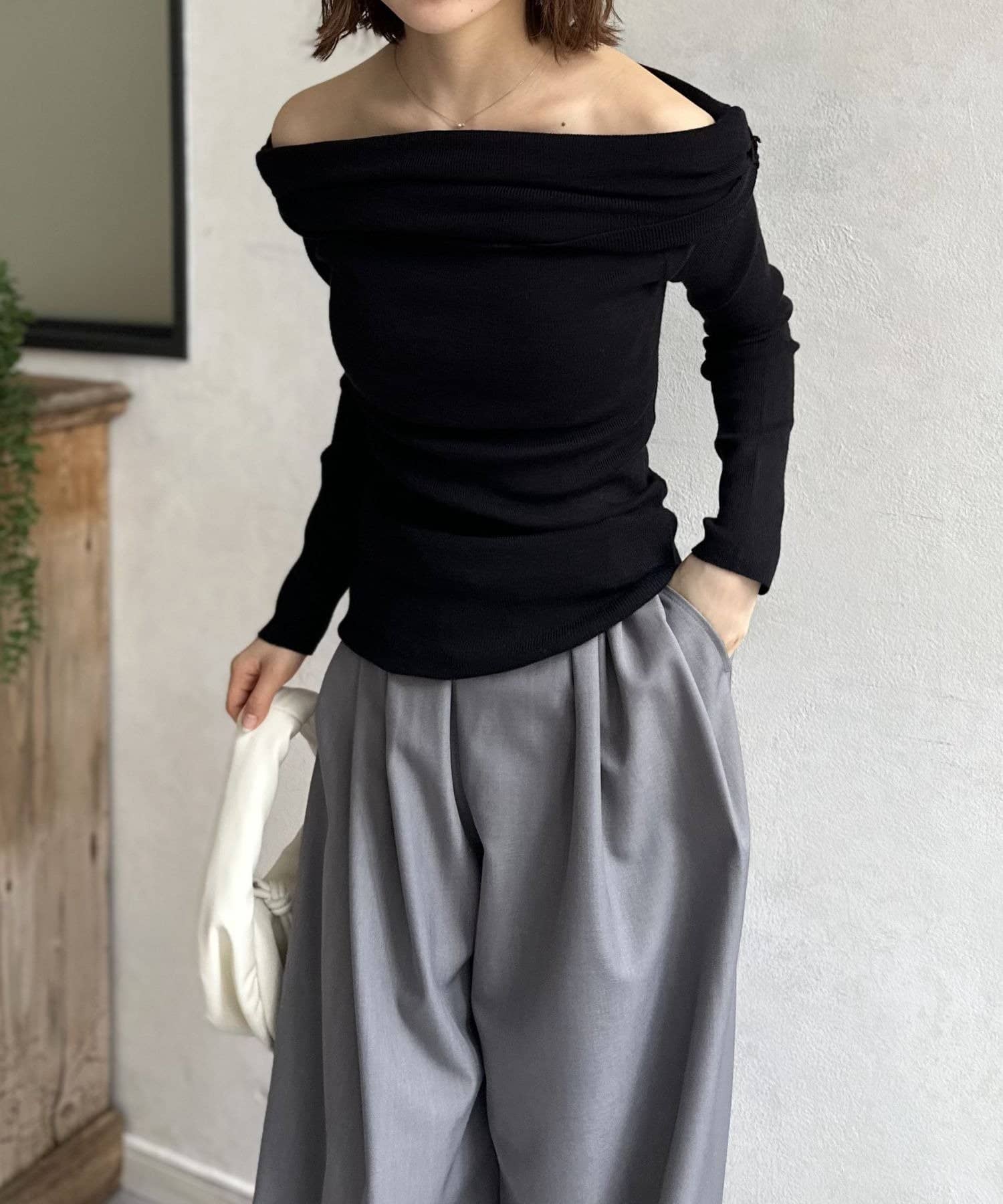 しっかりと肩を出してオフショルダーとして着こなすのはもちろん、少し控えめにボートネック風にしたり、片方の肩だけ落としてアシンメトリーなワンショルダースタイルを楽しんだりと、気分やシーンに合わせて何通りもの着こなしができる優秀な一枚です。