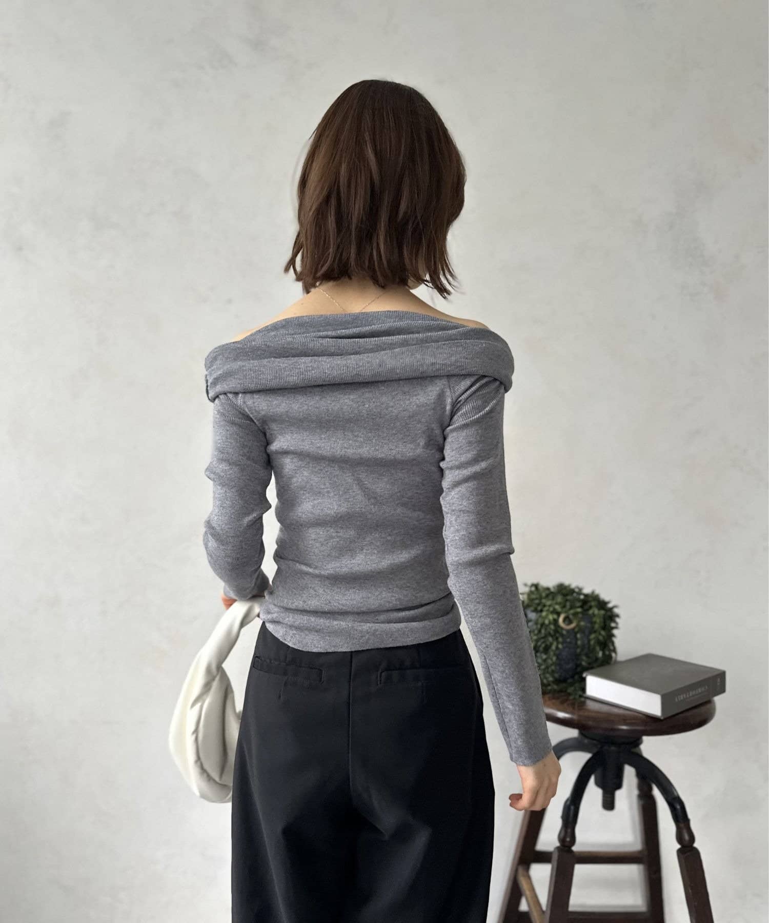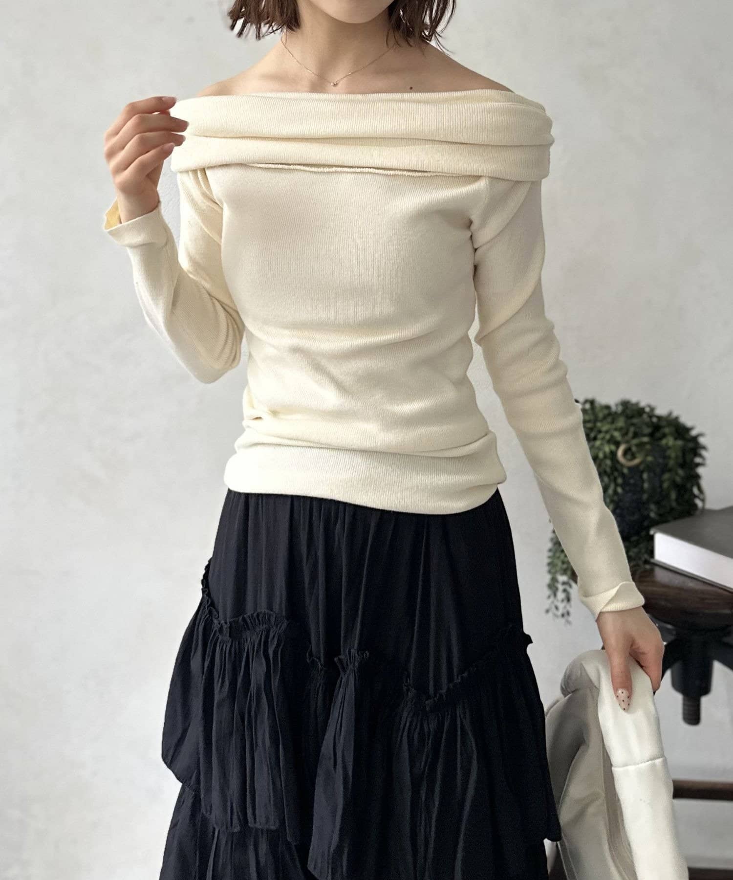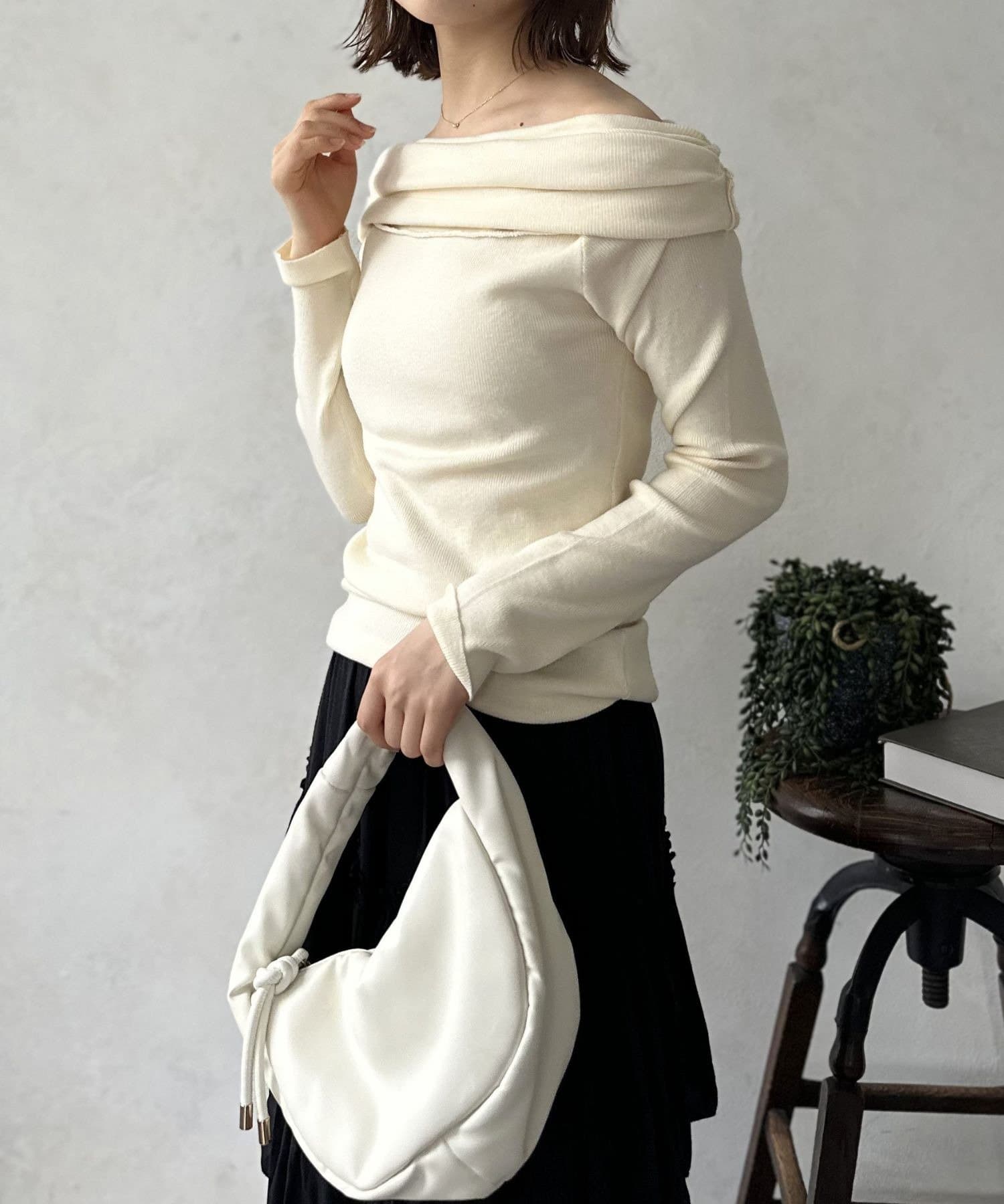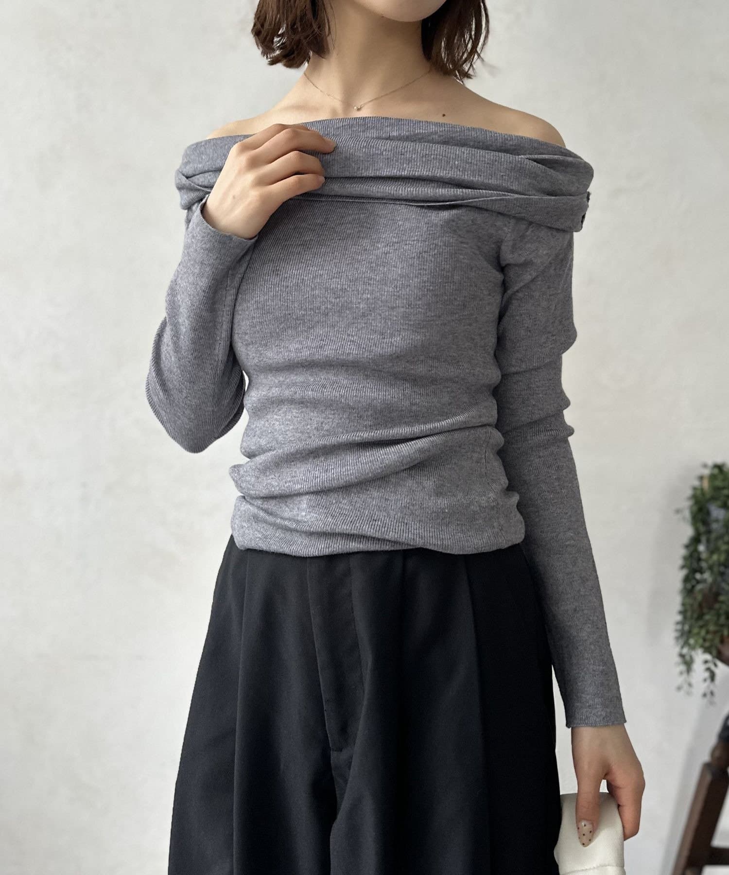 しっかりと肩を出してオフショルダーとして着こなすのはもちろん、少し控えめにボートネック風にしたり、片方の肩だけ落としてアシンメトリーなワンショルダースタイルを楽しんだりと、気分やシーンに合わせて何通りもの着こなしができる優秀な一枚です。