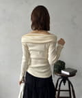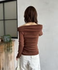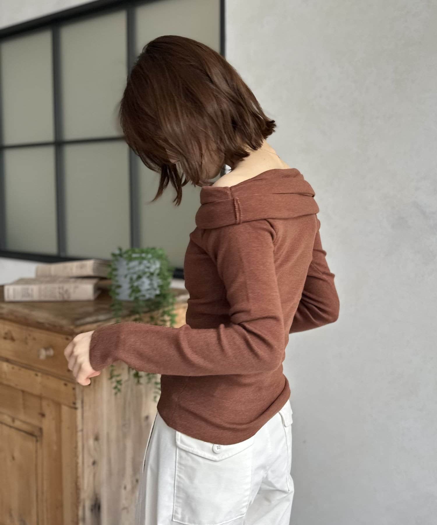 ネック部分はたっぷりと生地を使った折り返しデザインで、肩の出し具合はお好みで調整可能。