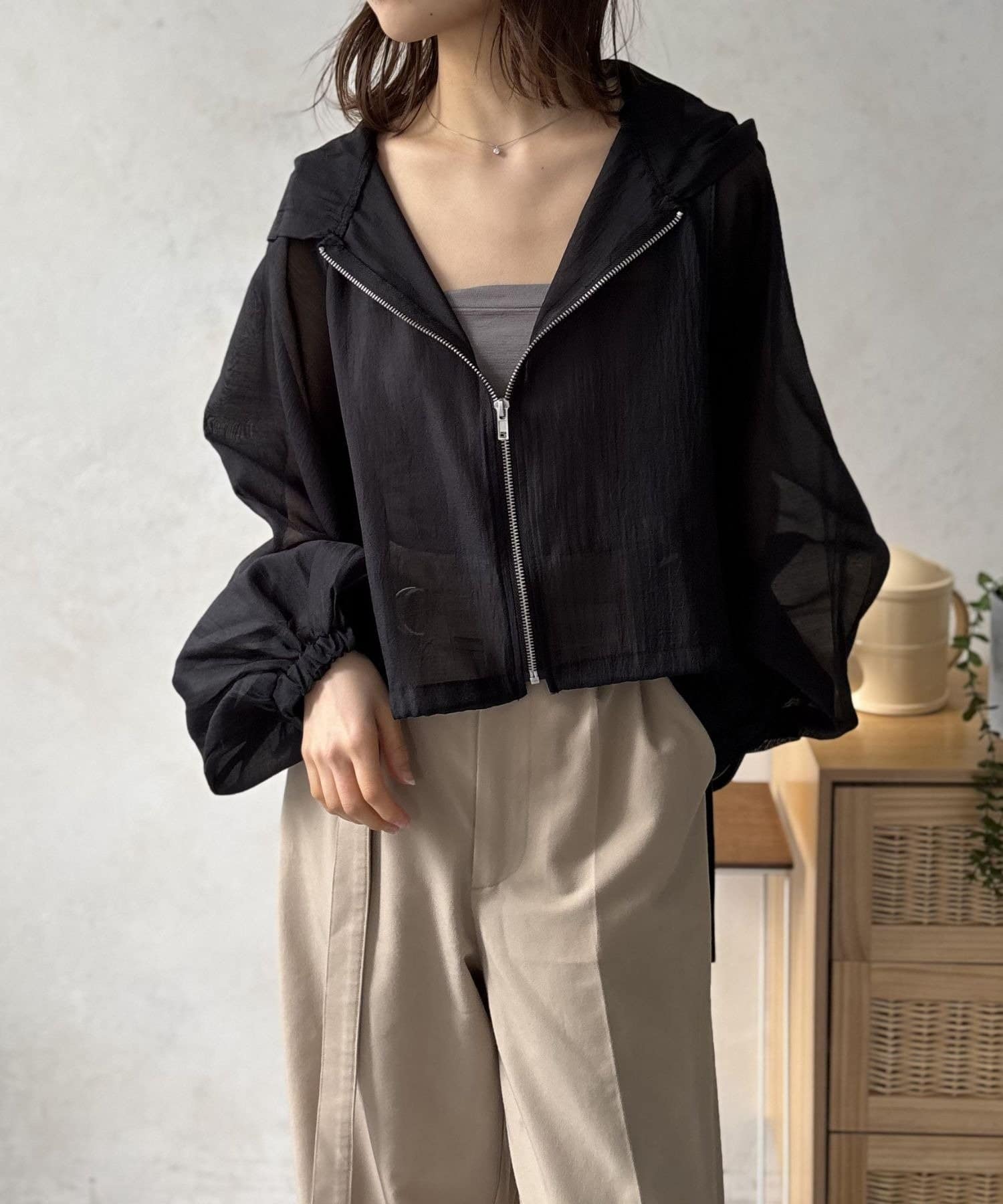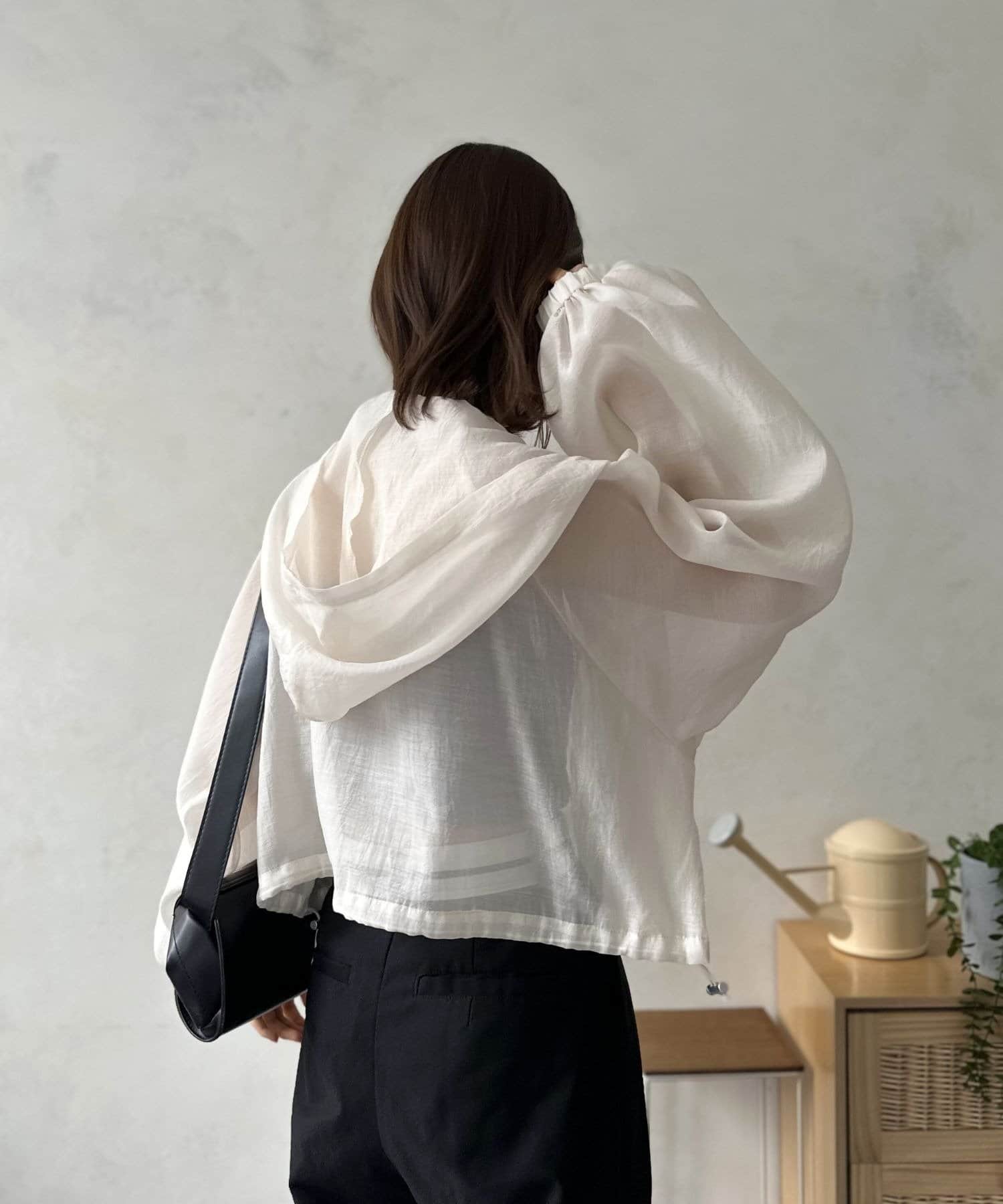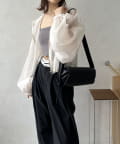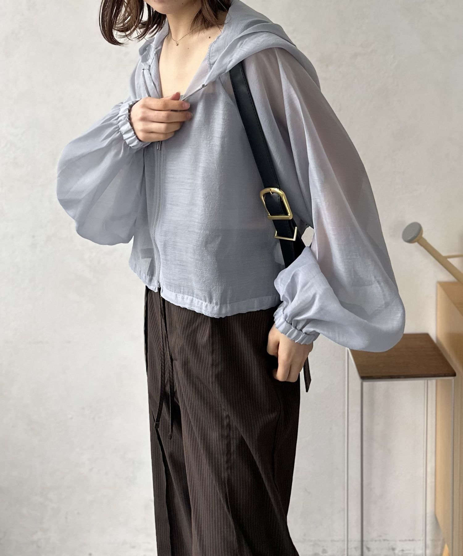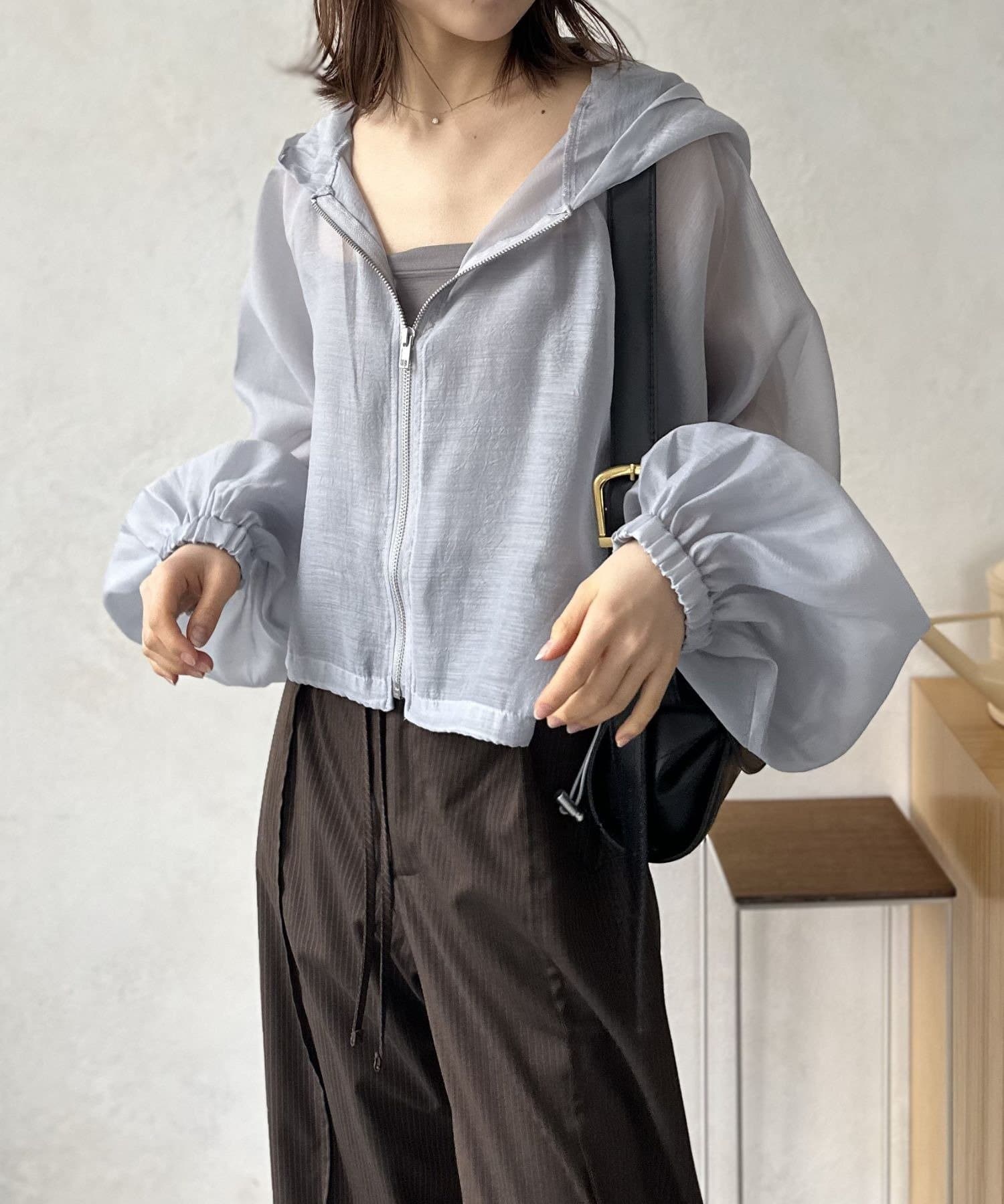 このブルゾン魅力は上品なシアー素材。ほんのりと肌が透ける絶妙な透け感は、重たくなりがちなアウタースタイルを一気に軽快な印象へと導きます。