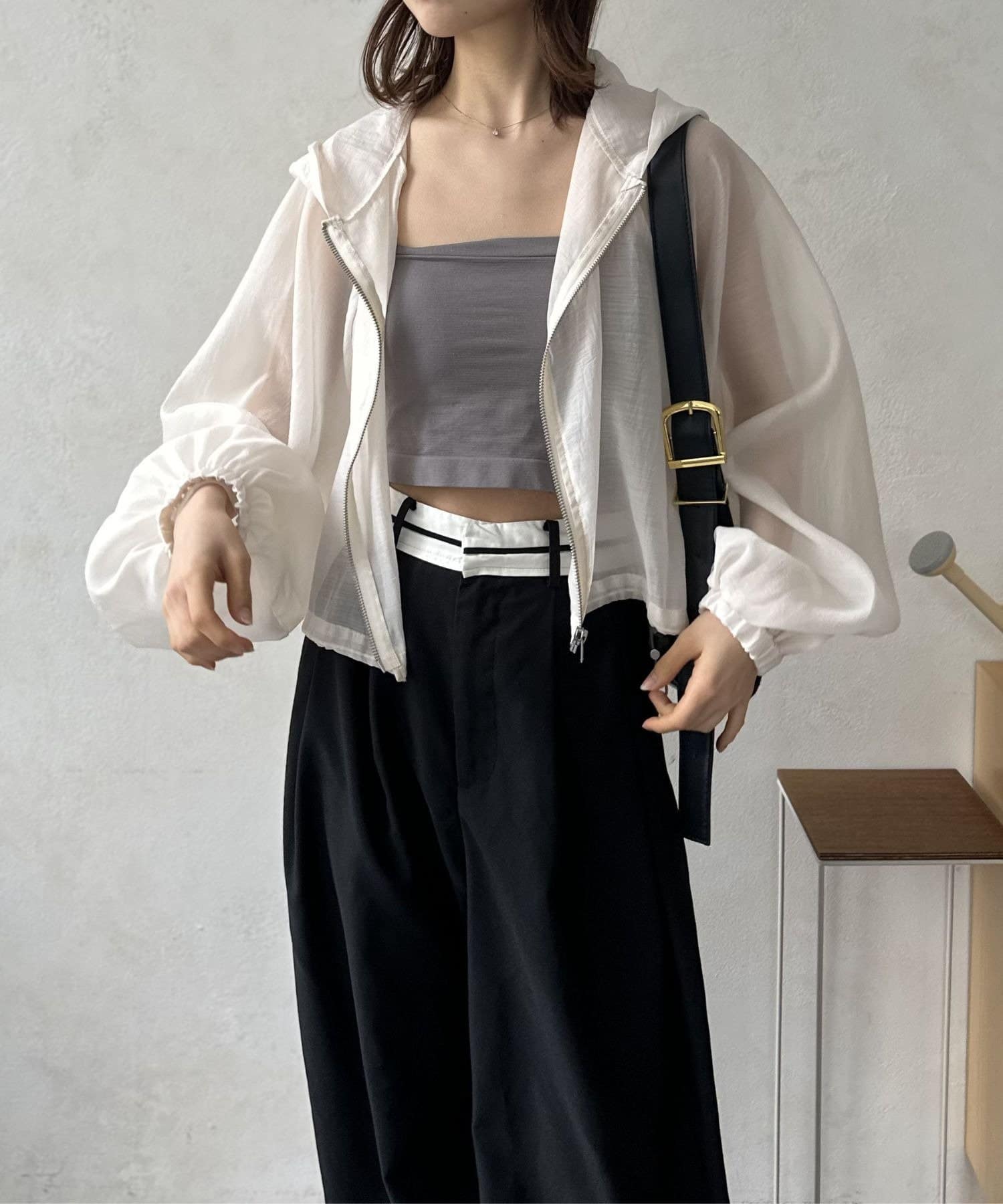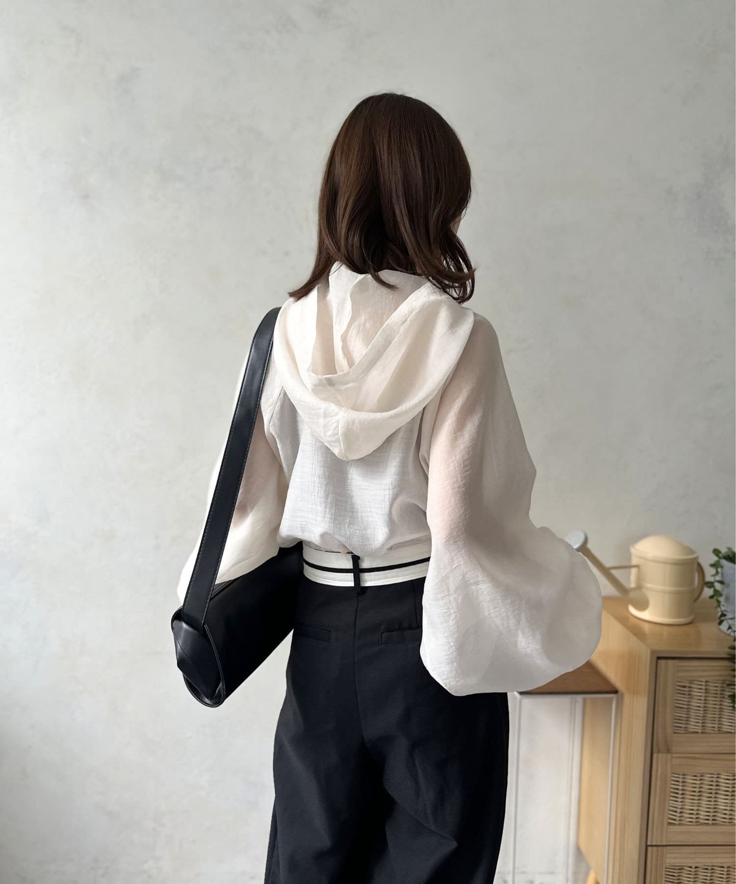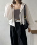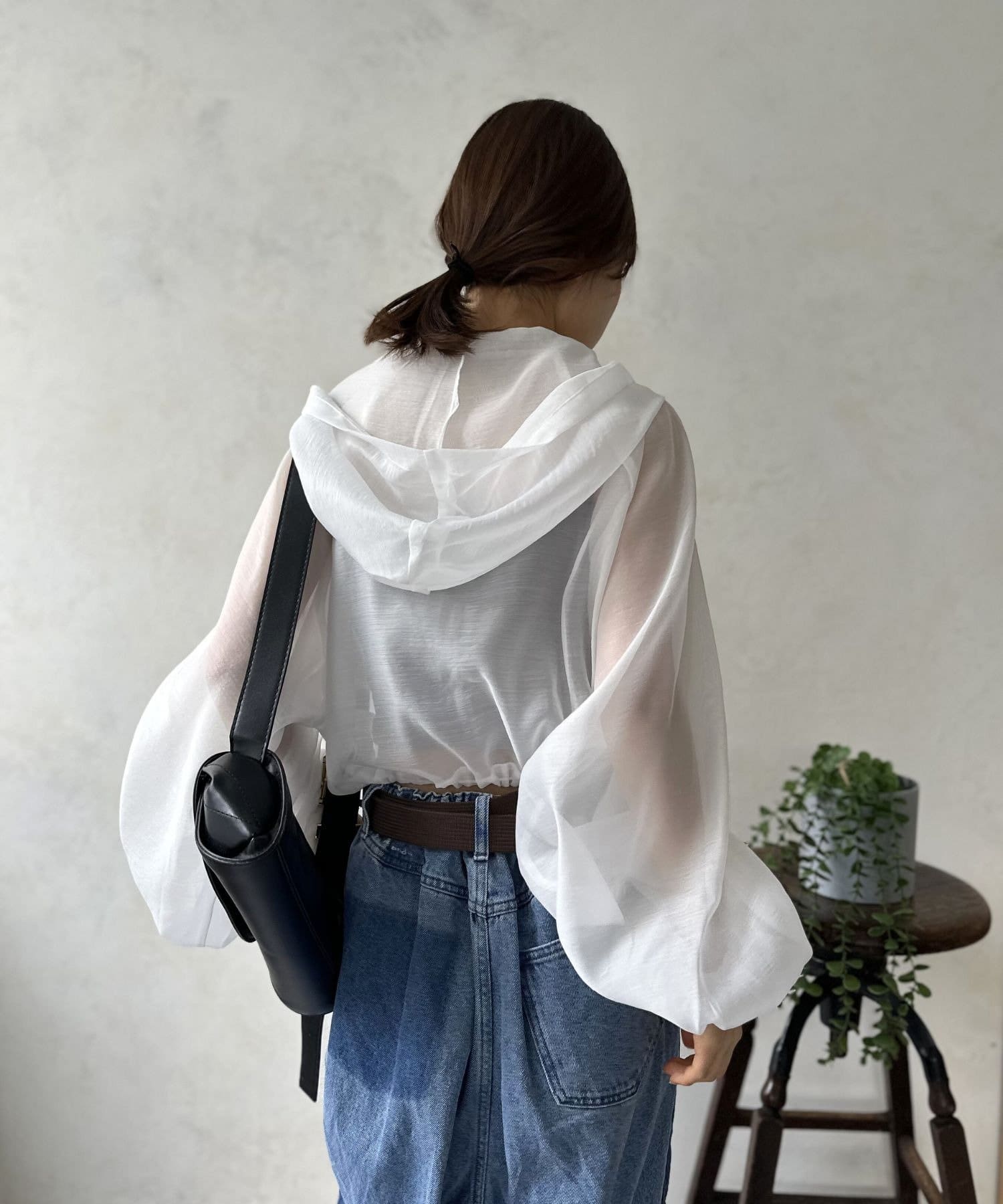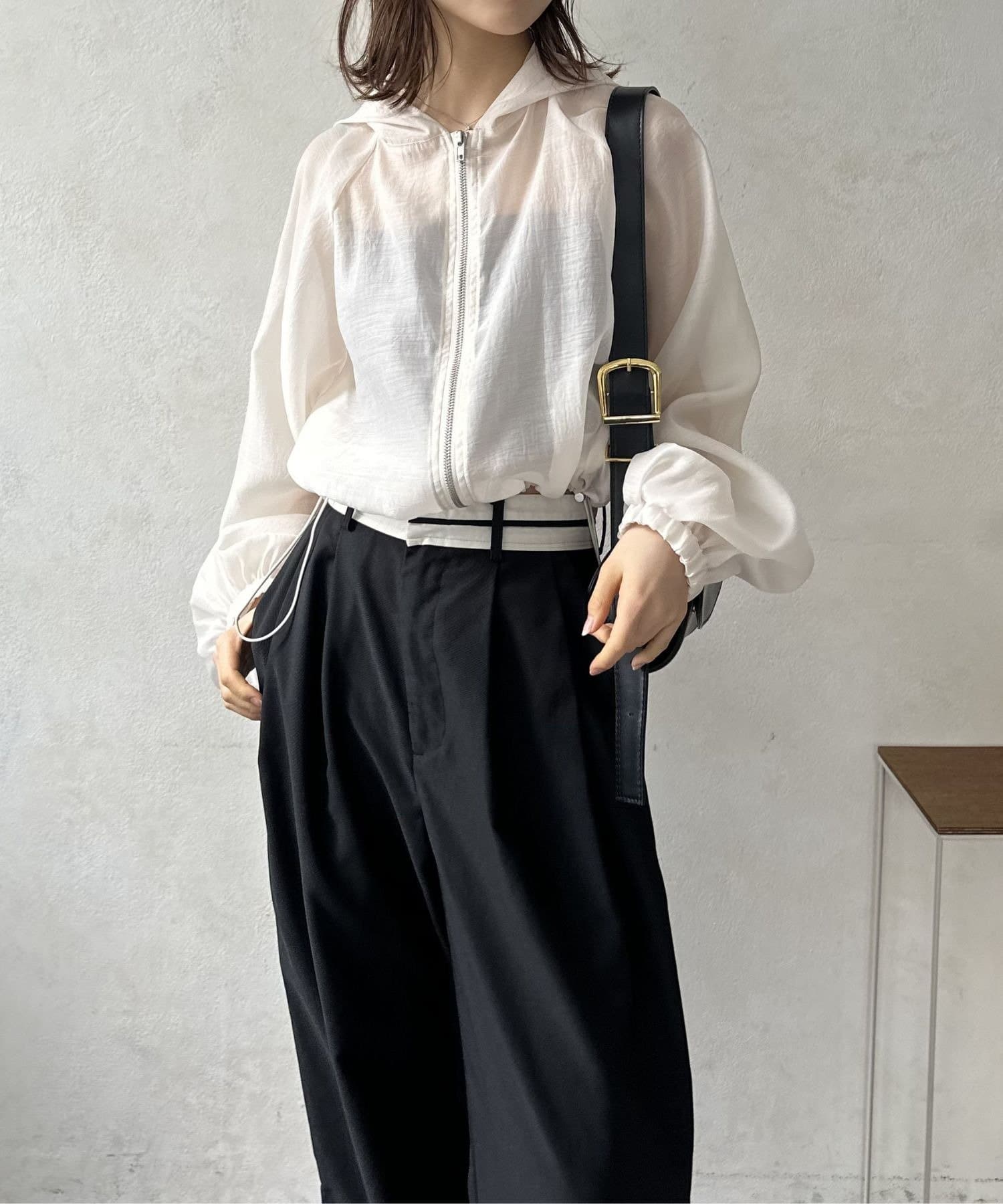 このブルゾン魅力は上品なシアー素材。ほんのりと肌が透ける絶妙な透け感は、重たくなりがちなアウタースタイルを一気に軽快な印象へと導きます。