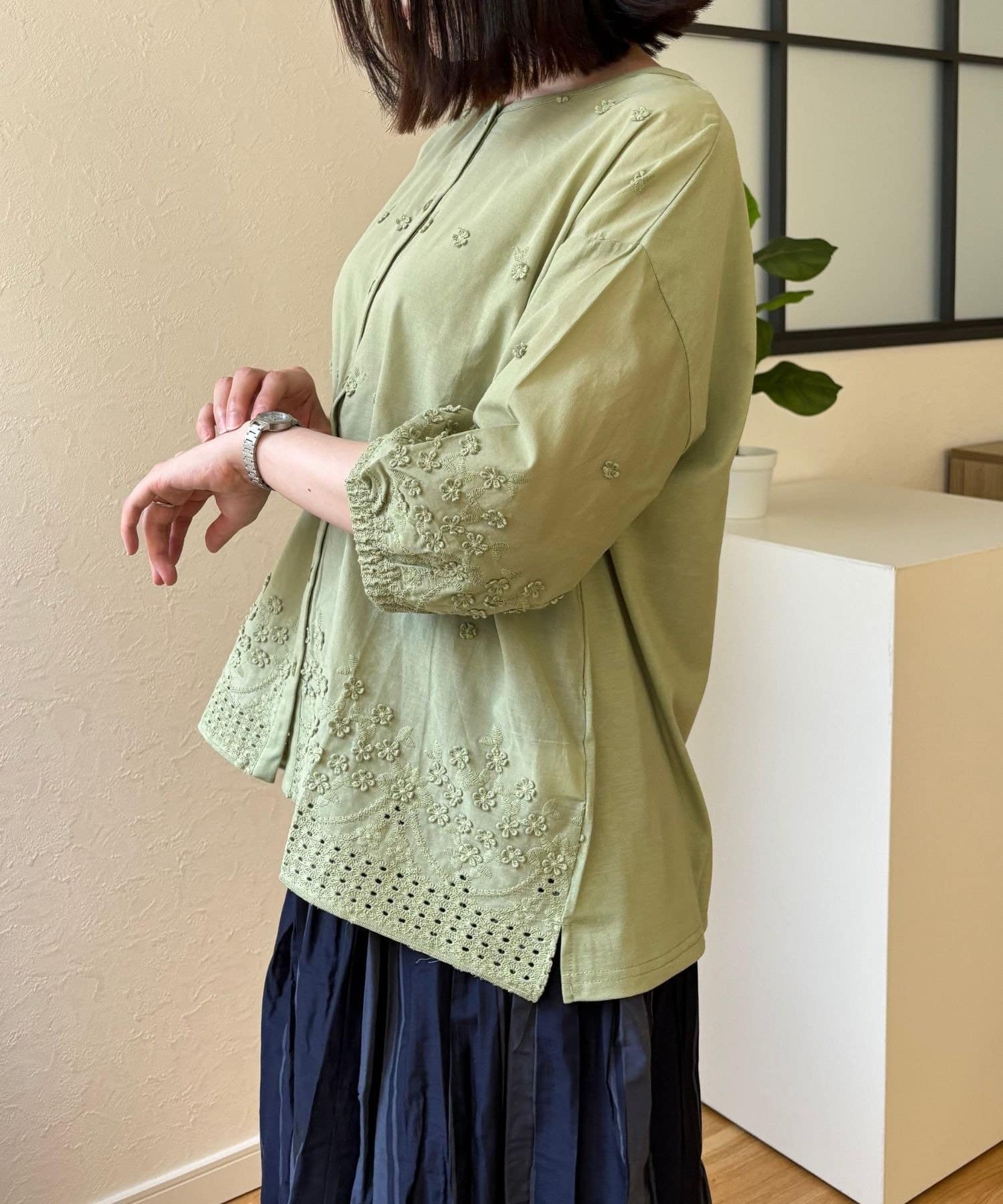 * 上品な刺繍:胸元と袖に施された繊細な刺繍が、シンプルな中に華やかさをプラス。主張しすぎない上品なデザインなので、オフィスにも、お出かけにも着ていけます。