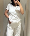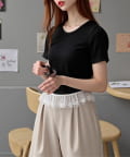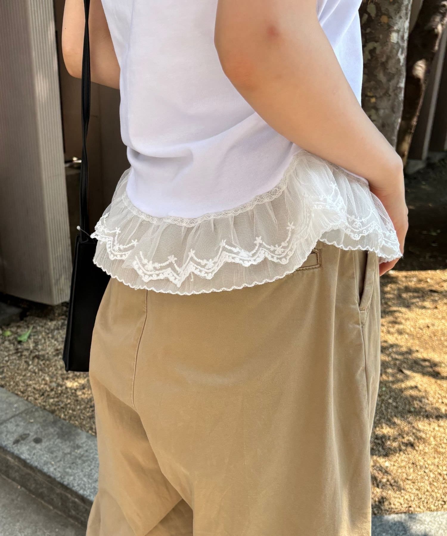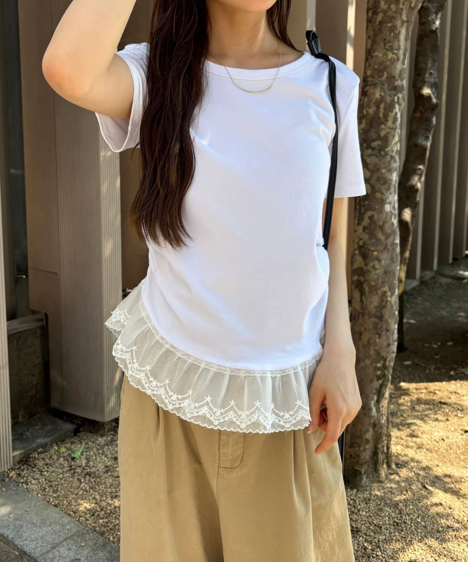 シンプルなTシャツに、フェミニンなフリルをあしらった、ありそうでなかったデザイン。カジュアルだけど、どこか上品。そんな絶妙なバランスが、大人の女性にぴったりなんです。