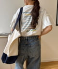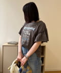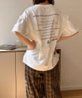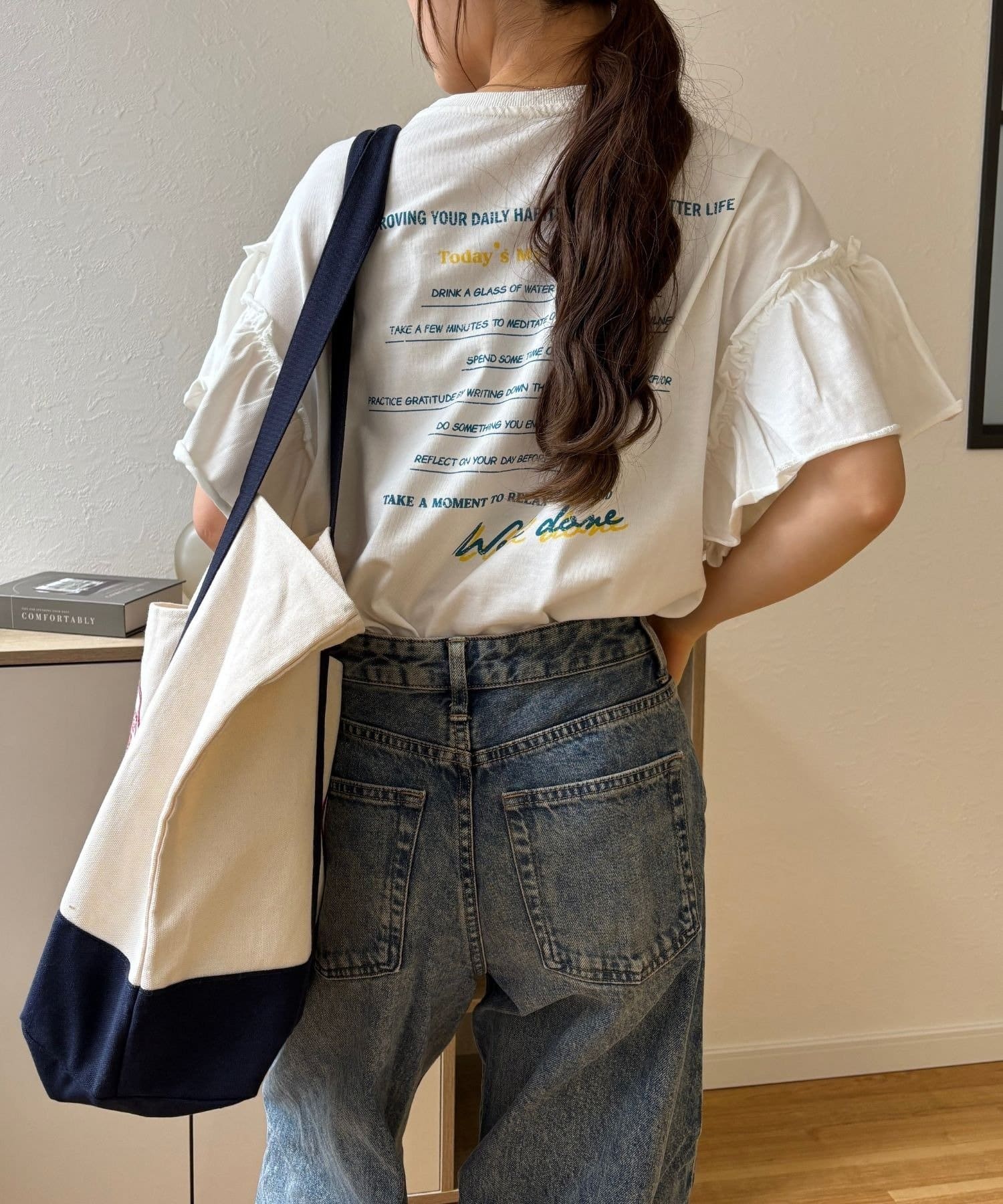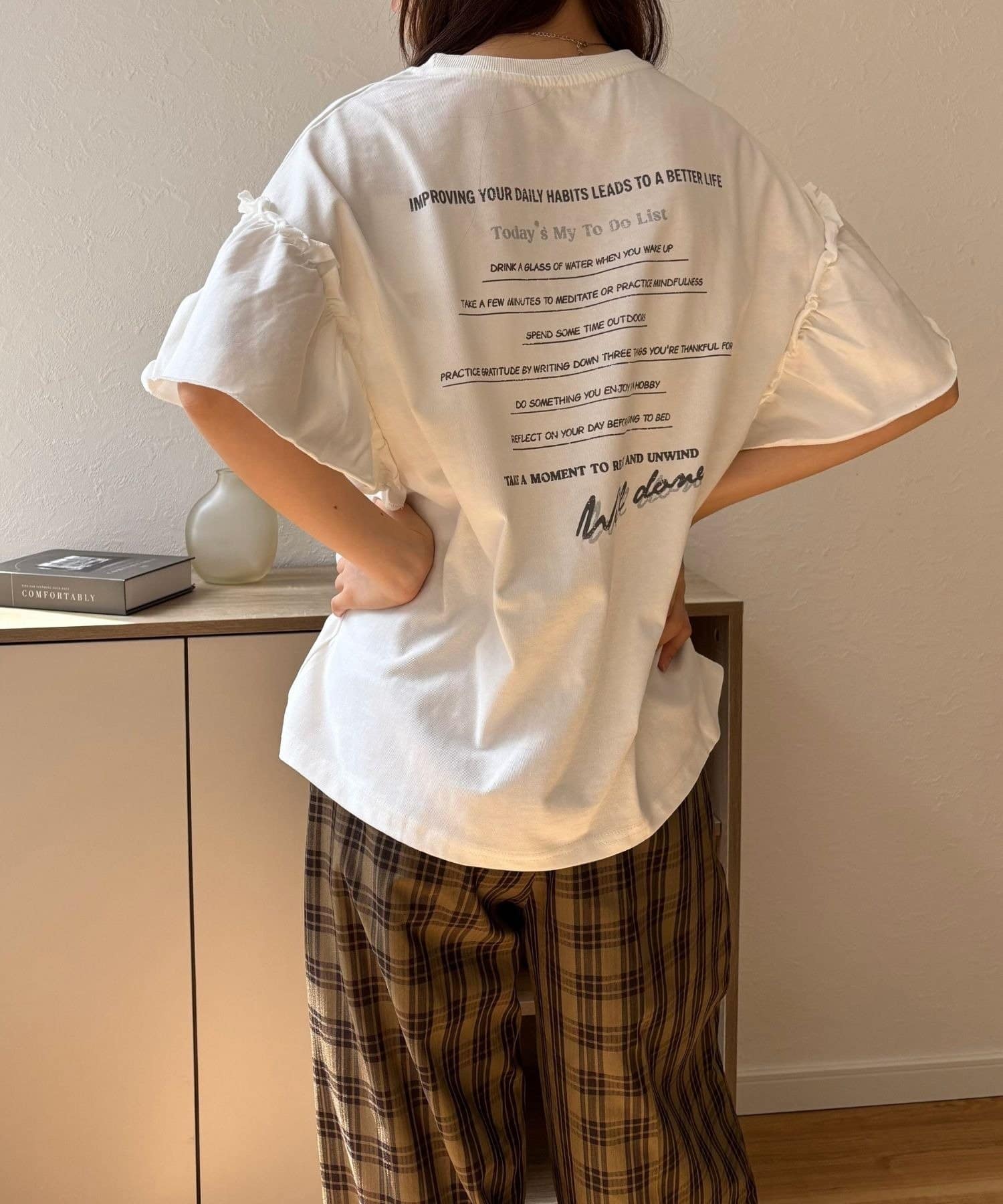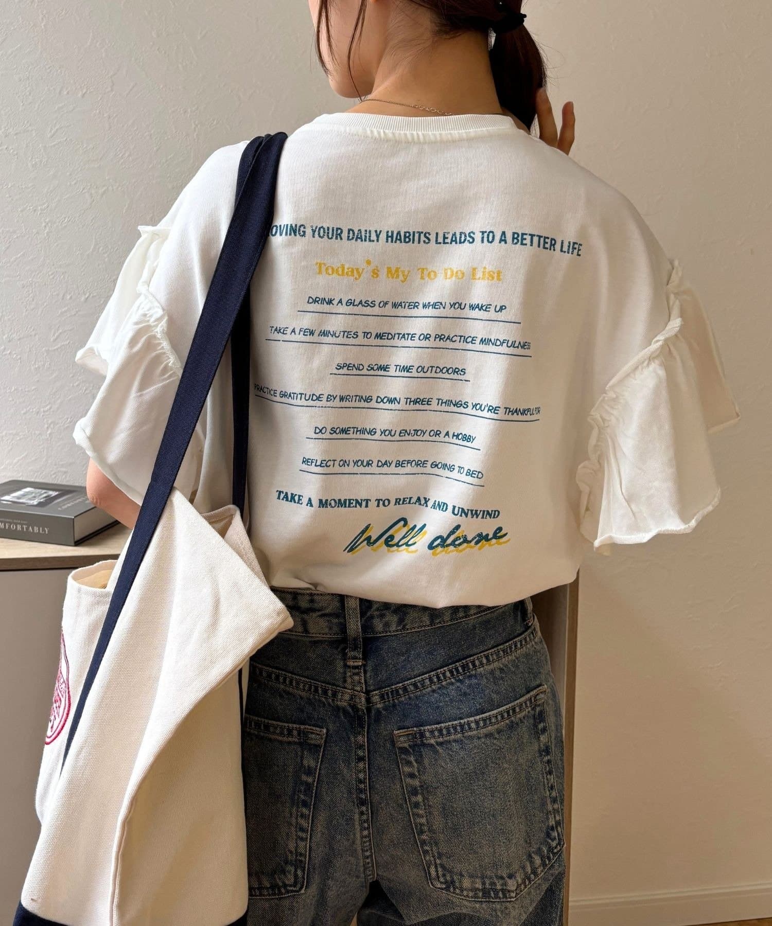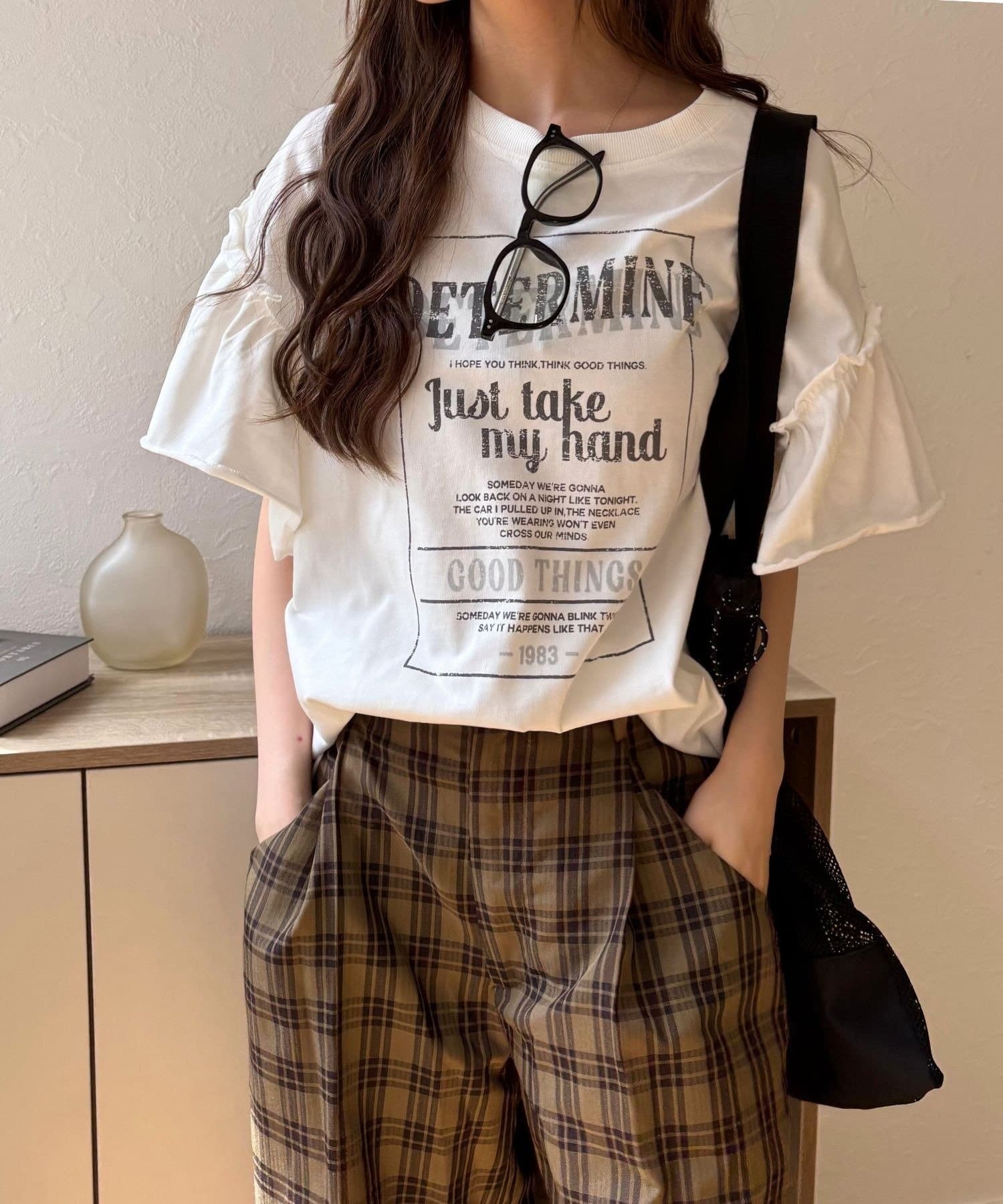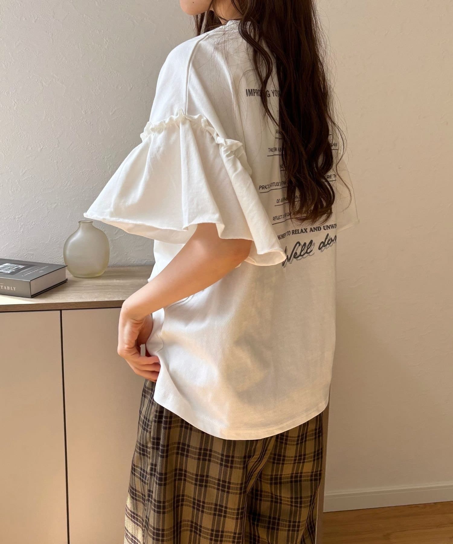 シンプルながらも、さりげない個性が光る大人可愛いフリル袖プリントTシャツ