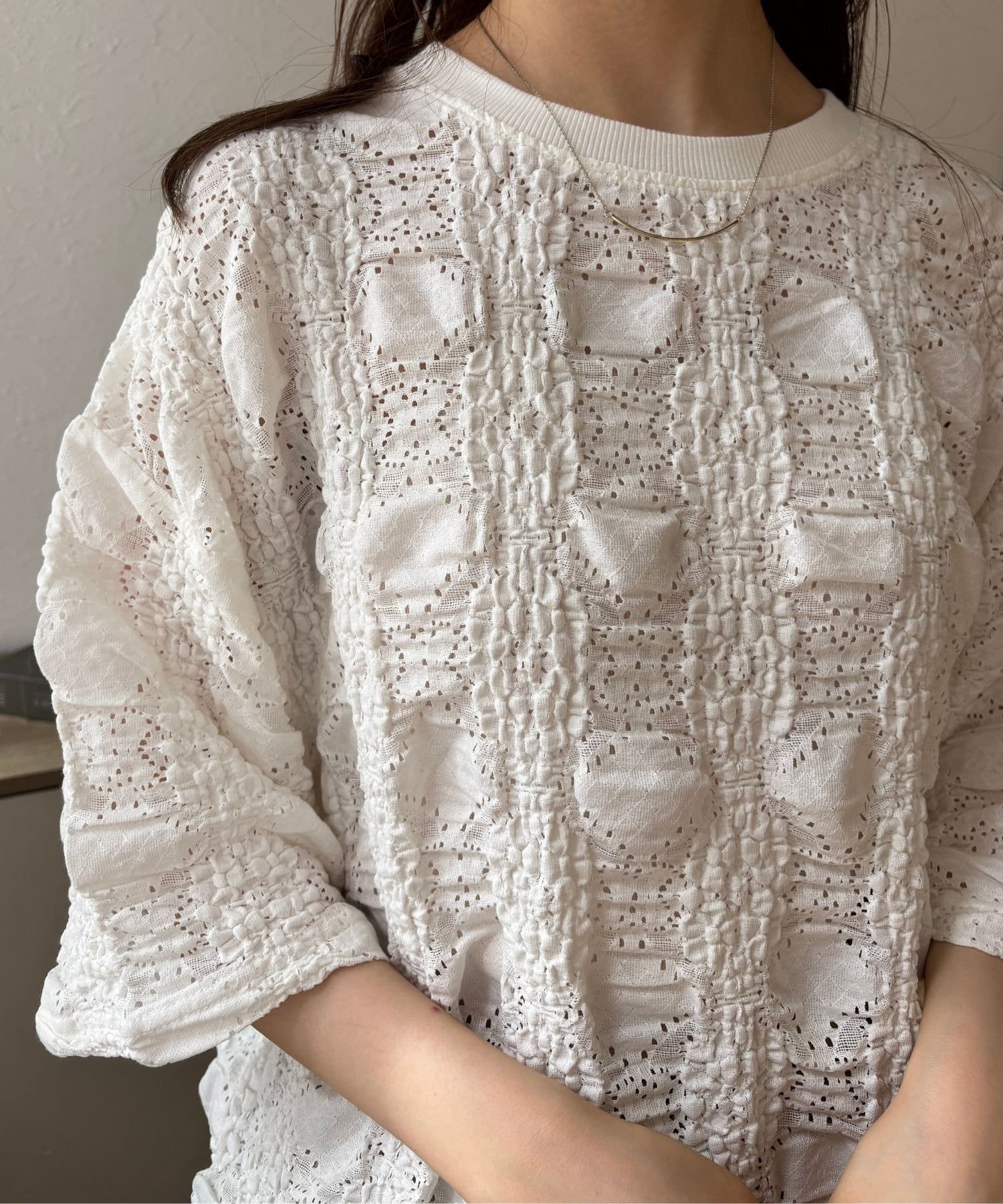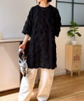 目を引くカットジャガード生地が、シンプルなコーディネートに奥行きと個性をプラス。