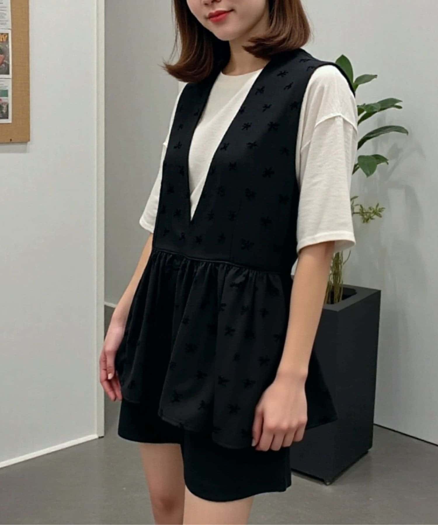 **スタイルアップ効果** ペプラムデザインがウエストをキュッと引き締め、女性らしいシルエットを演出。
