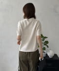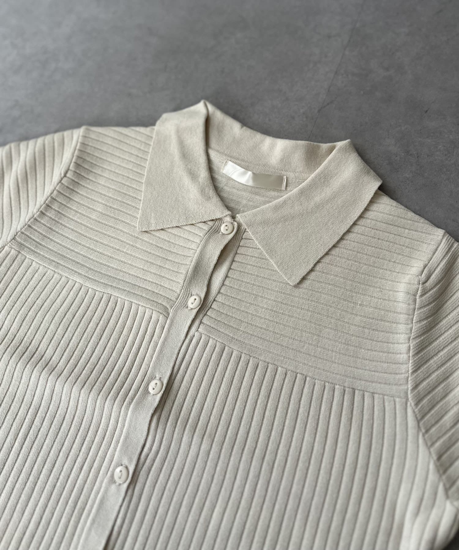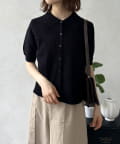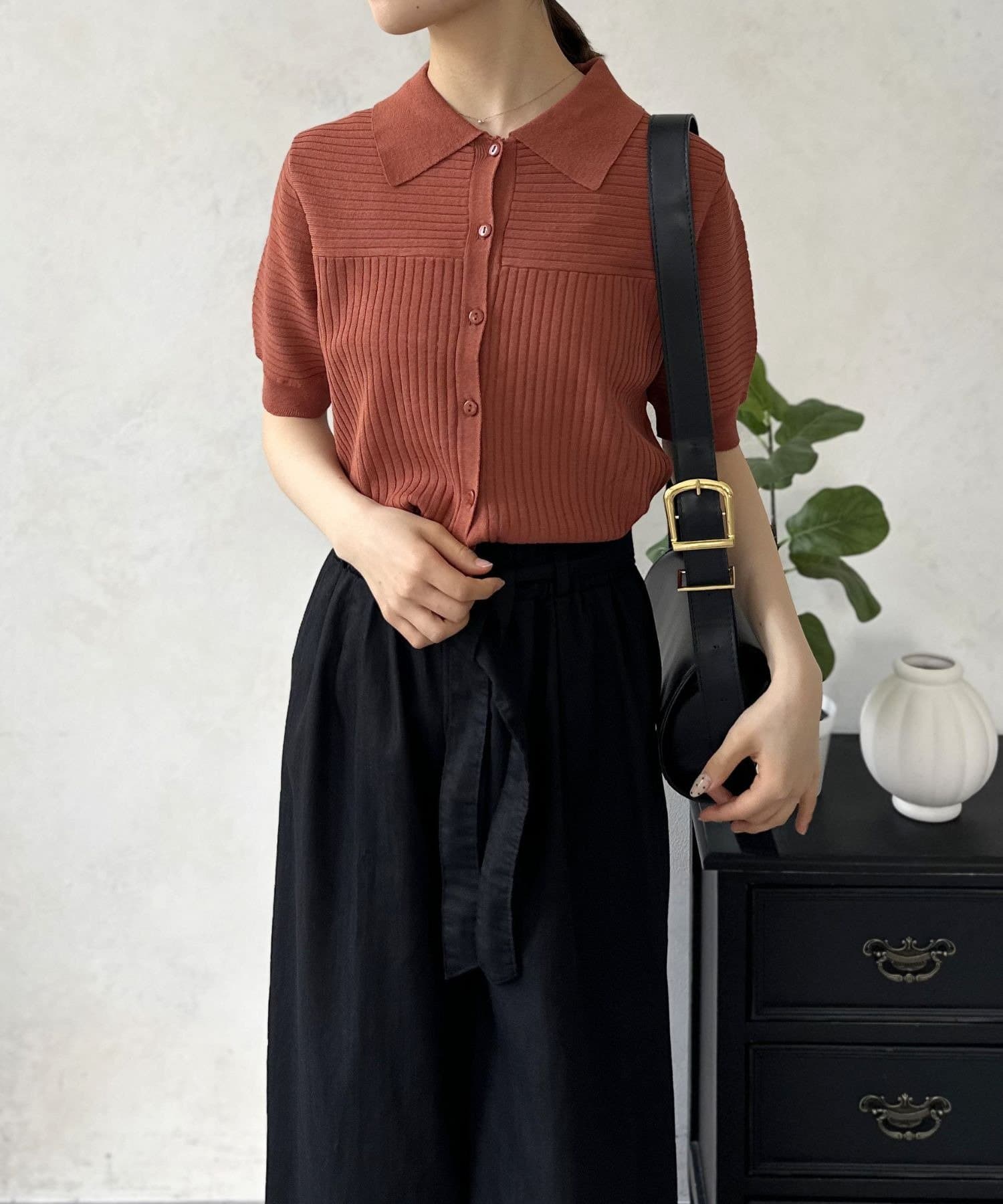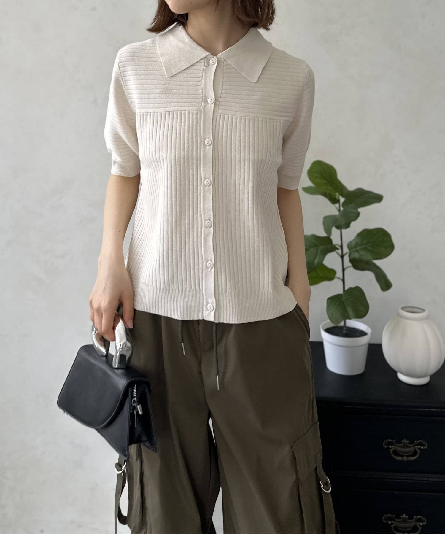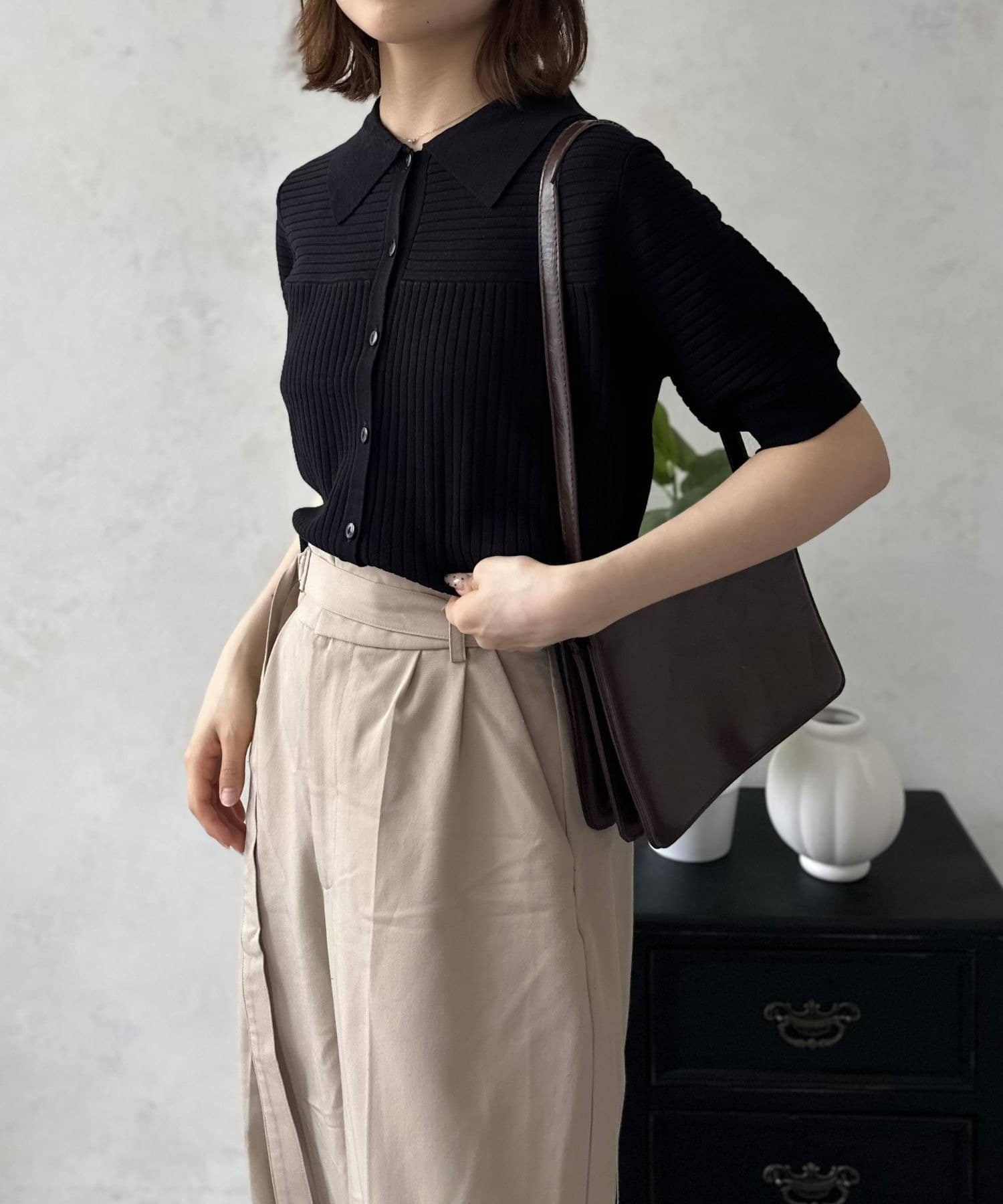 前のボタンを全部留めればクラシカルなニットポロとして、ボタンをいくつか開けてデコルテを見せれば、抜け感のある女性らしいスタイリングが完成。