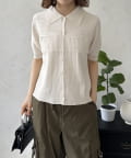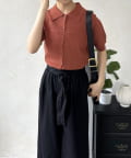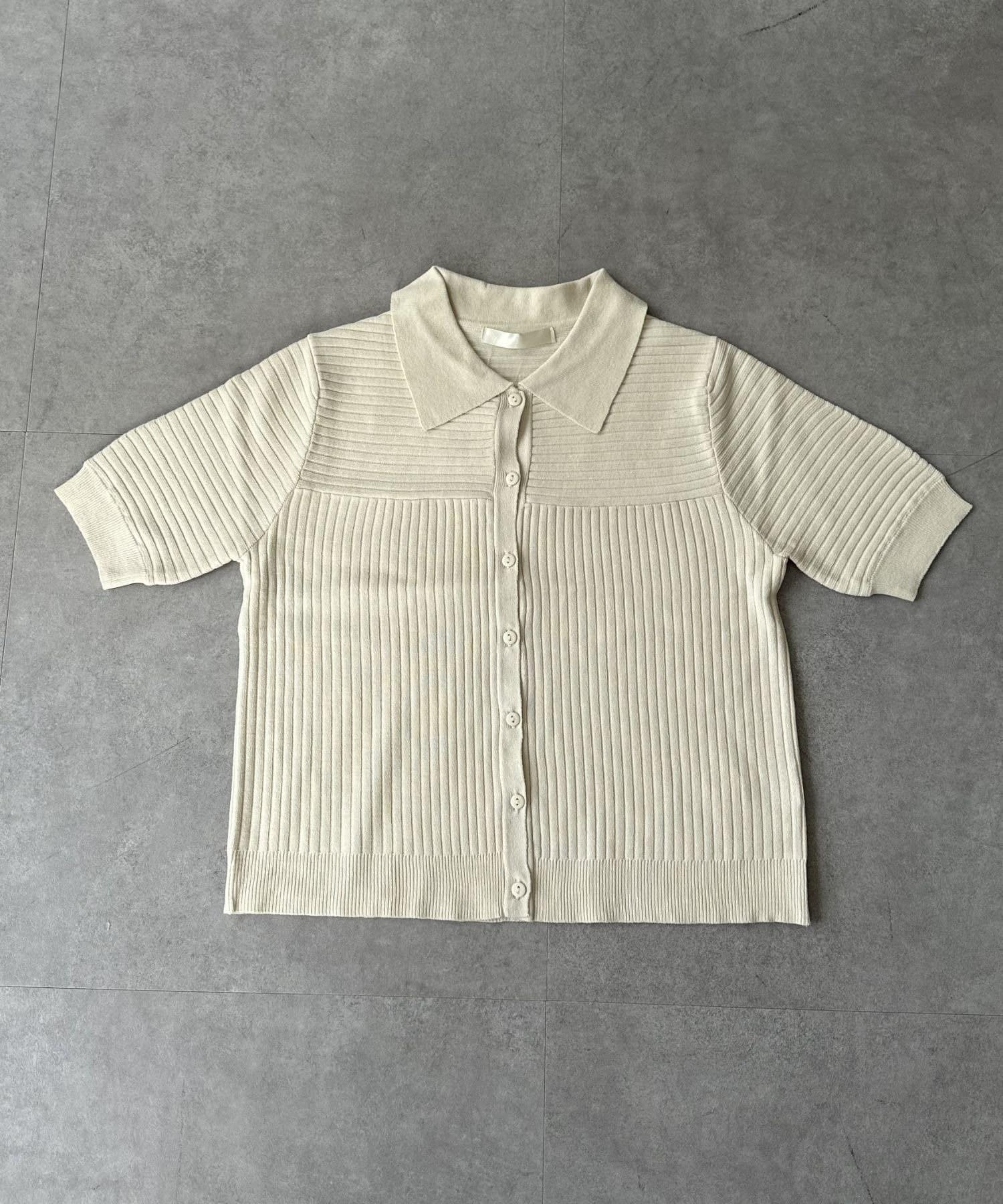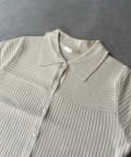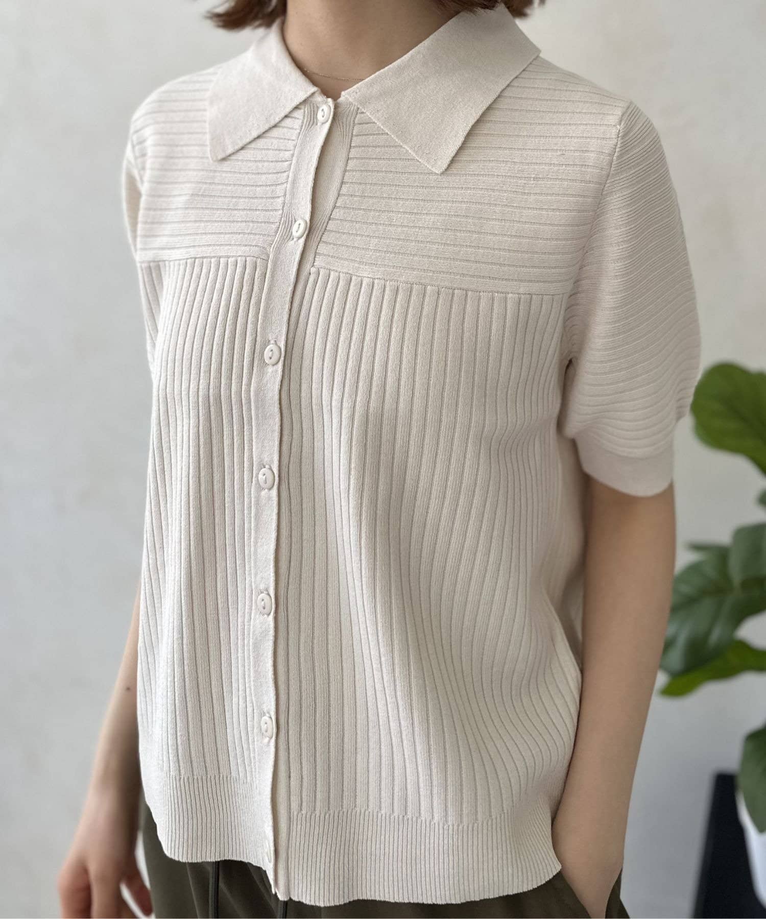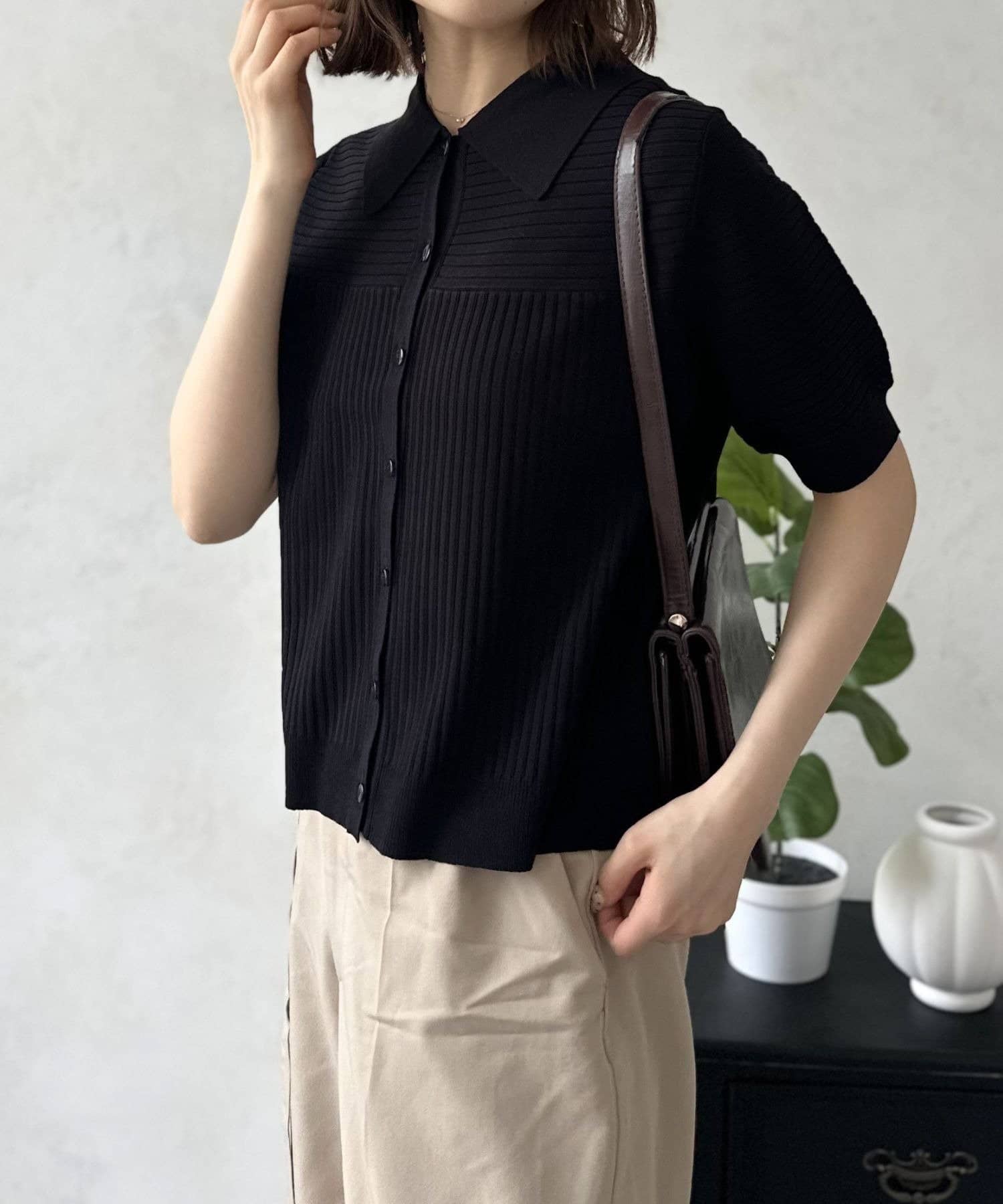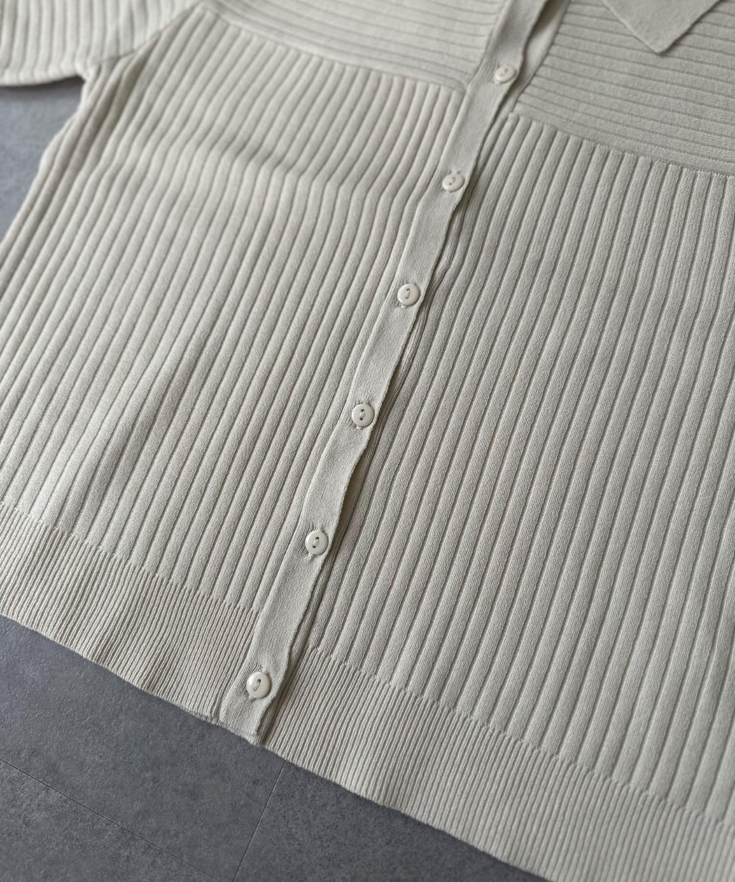 前のボタンを全部留めればクラシカルなニットポロとして、ボタンをいくつか開けてデコルテを見せれば、抜け感のある女性らしいスタイリングが完成。