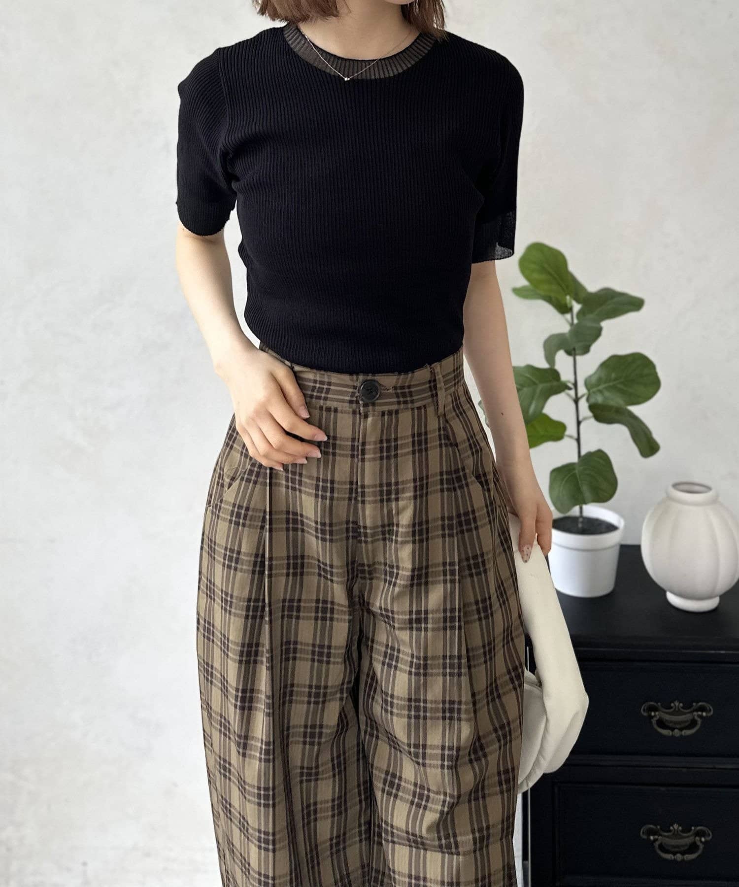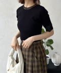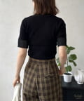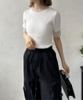 コンパクトな着丈なので、タックインしてもウエスト周りがもたつかず、ワイドパンツやフレアスカートなど、ボリュームのあるボトムスとも相性抜群です。