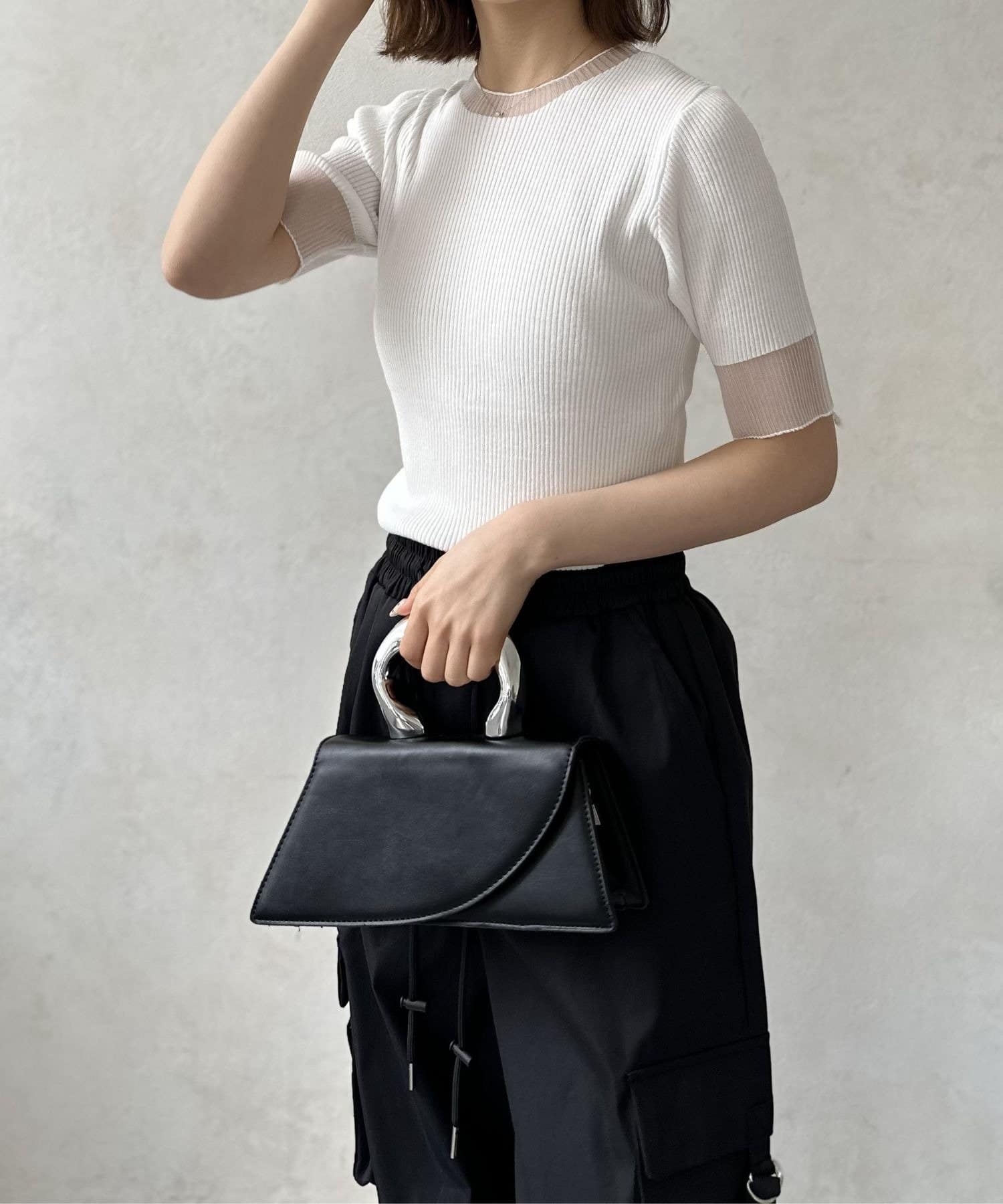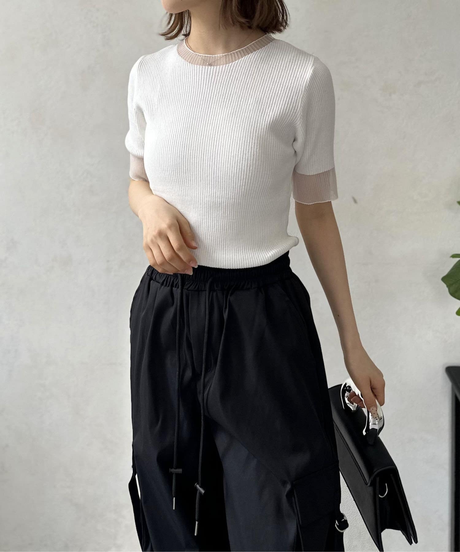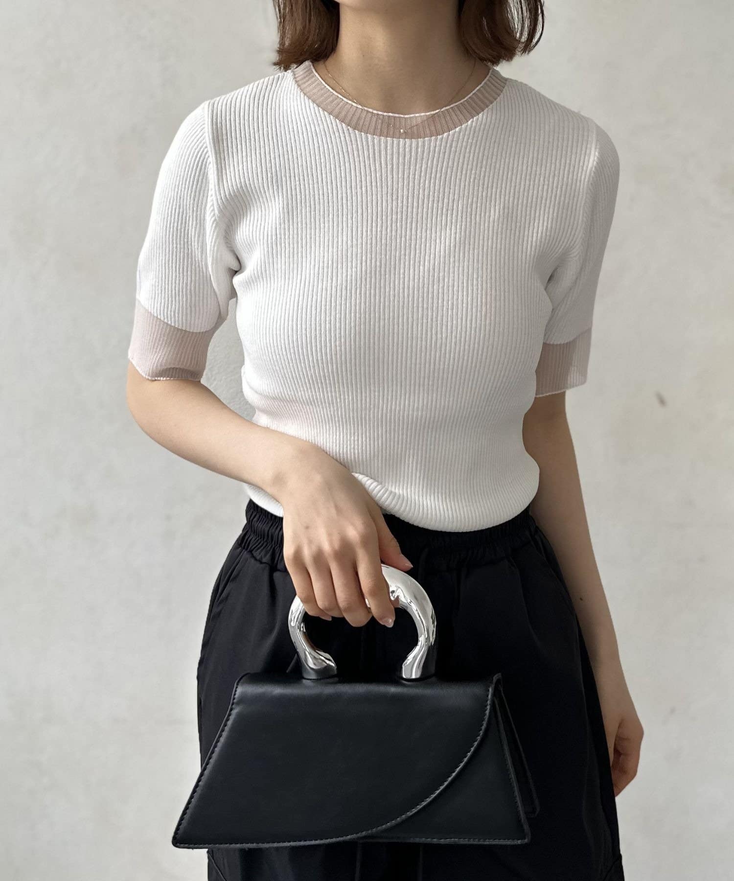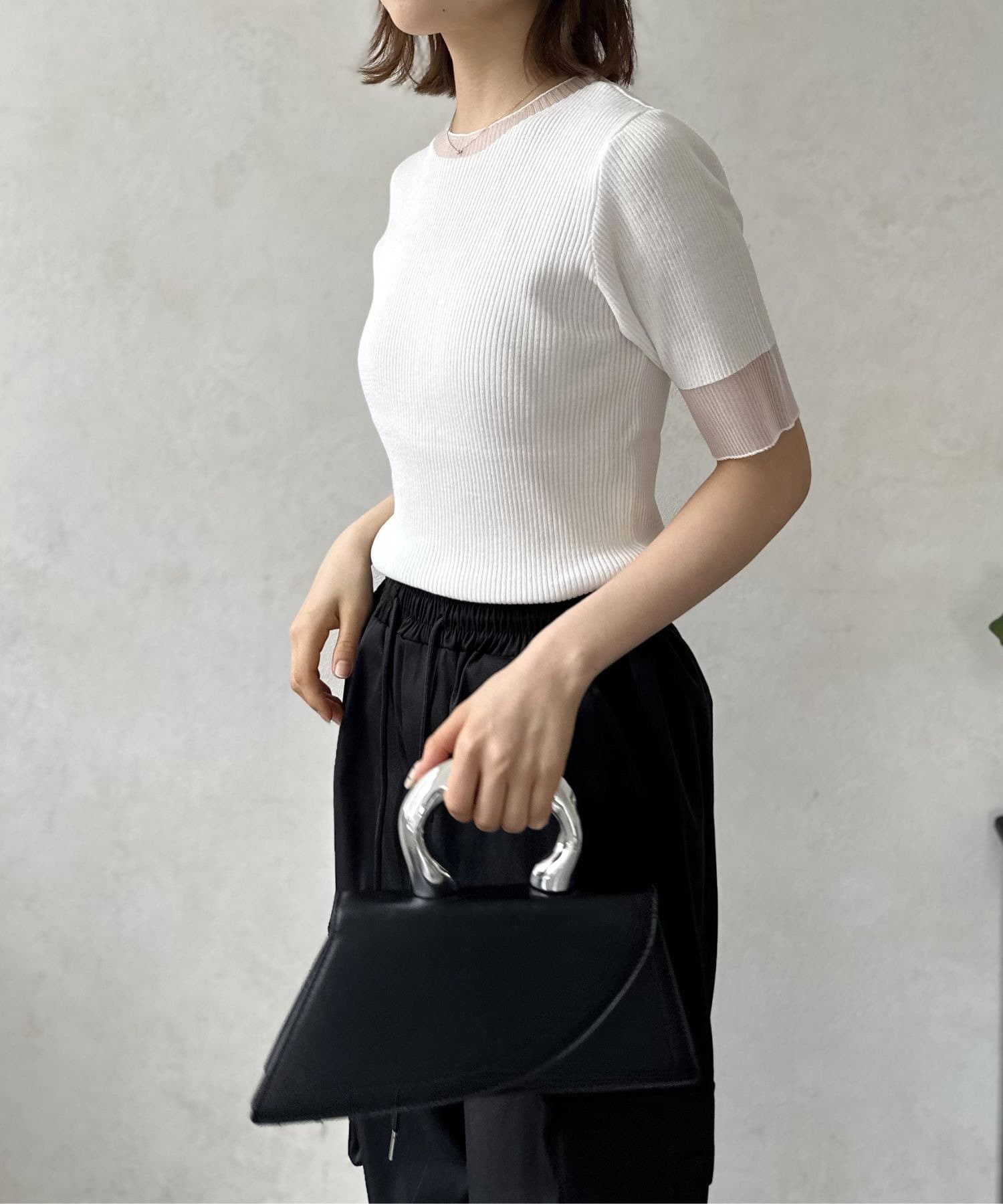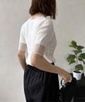 ネックラインと袖口にあしらわれたシアー素材の切り替え。ほんのり透ける肌が、涼しげでセンシュアルな雰囲気を演出します。
