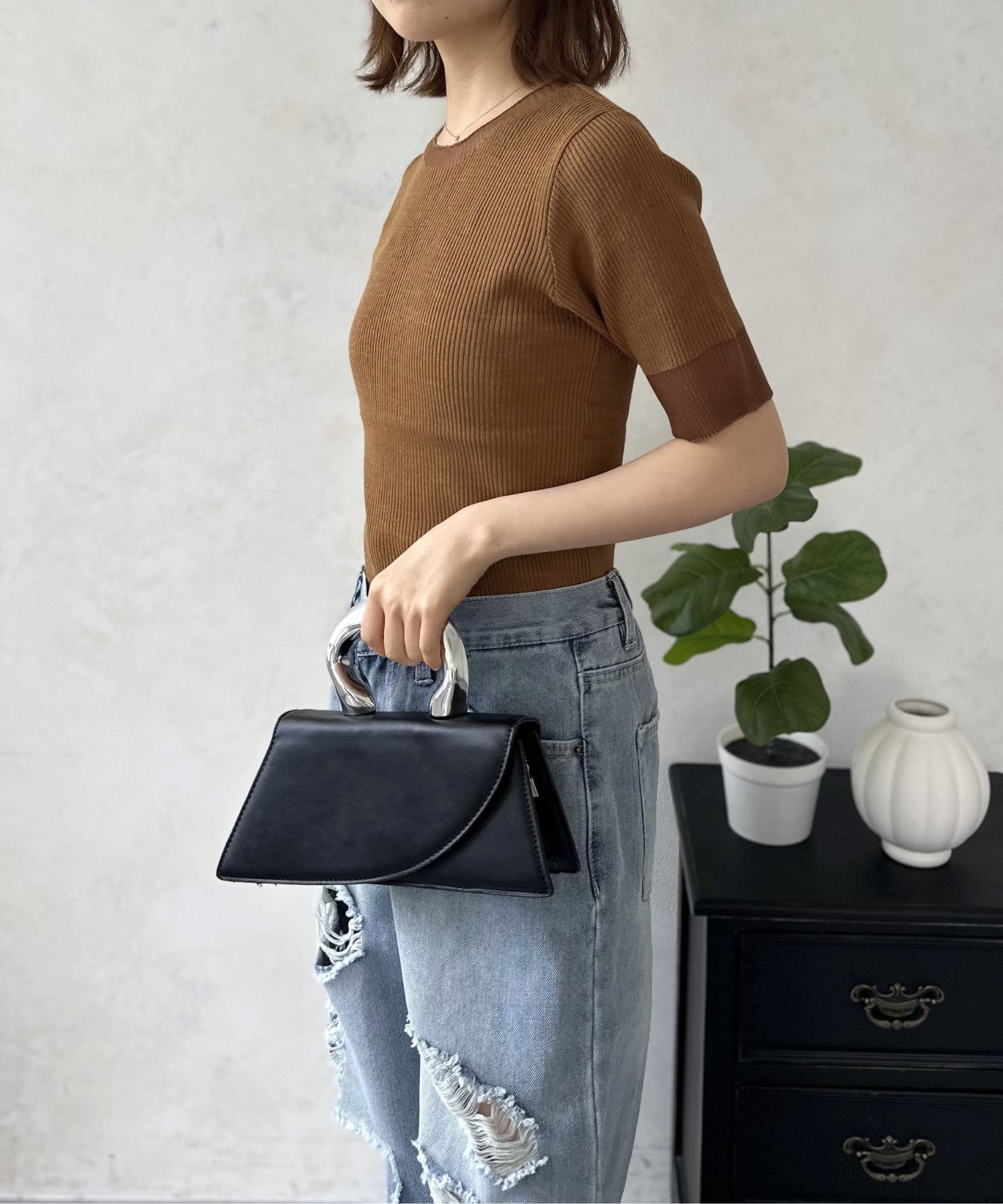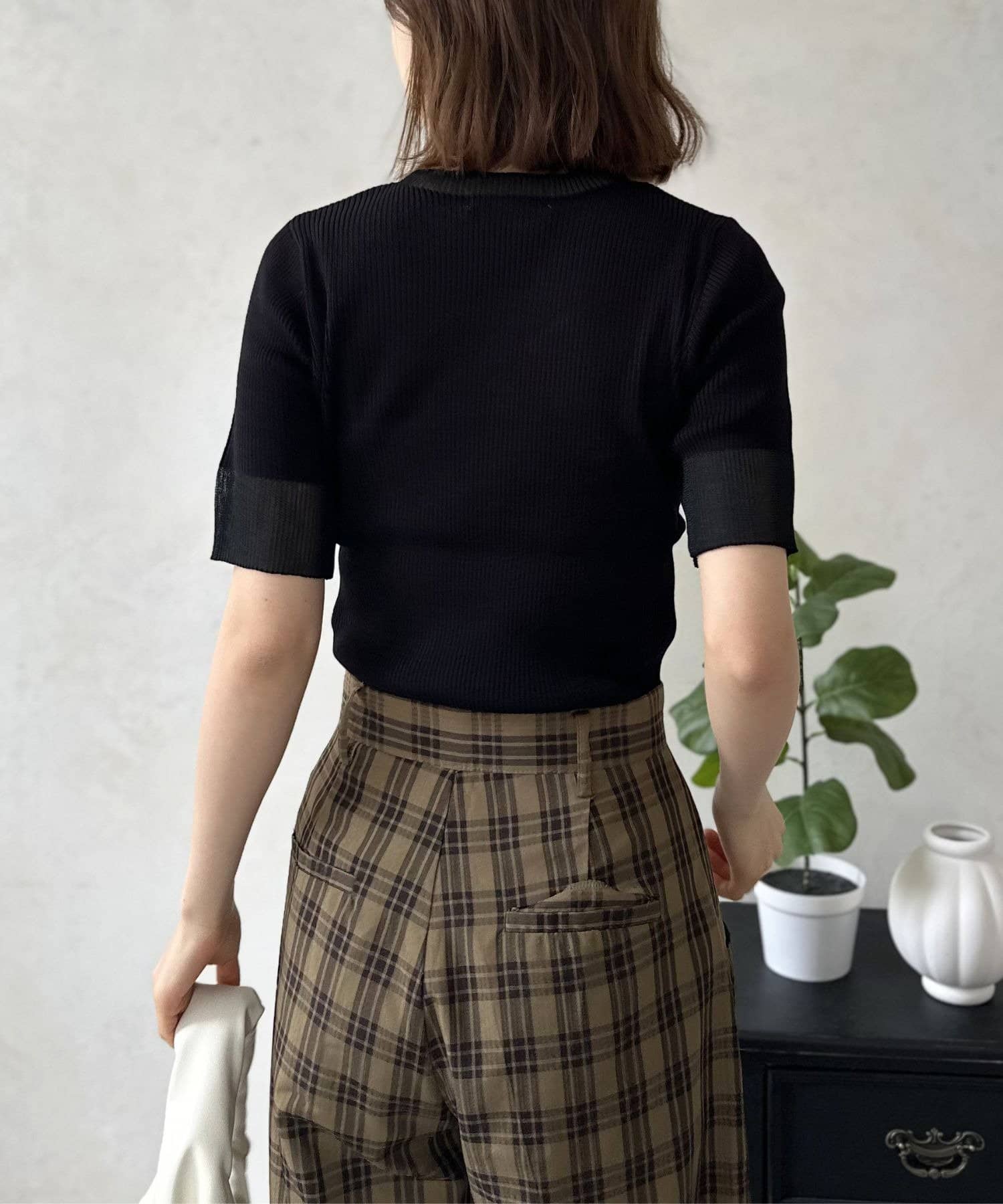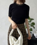 ボディには縦のラインを強調するリブ編み。このリブが、気になる体のラインを拾いすぎず、すっきりと華奢に見せてくれる効果を発揮します。