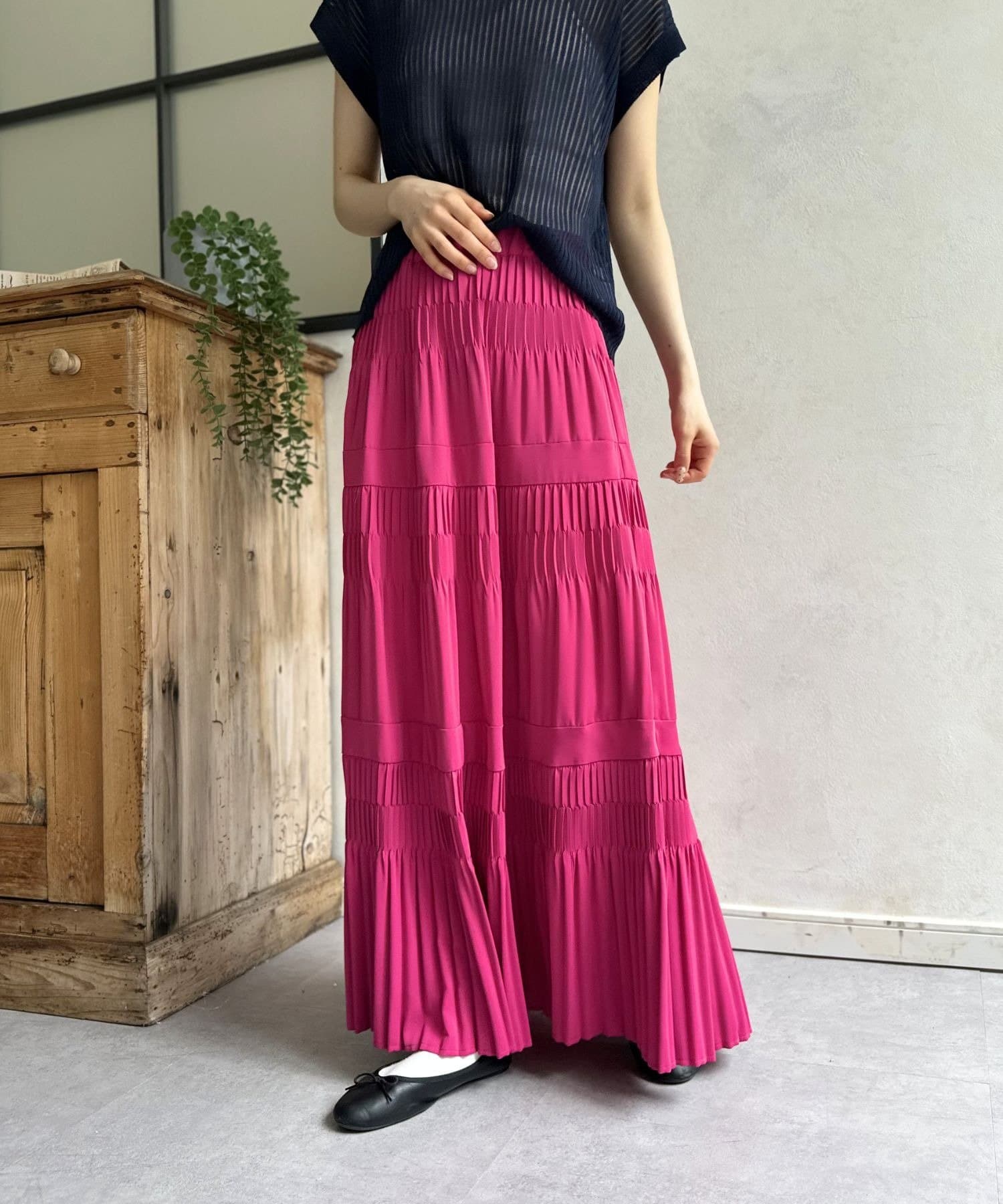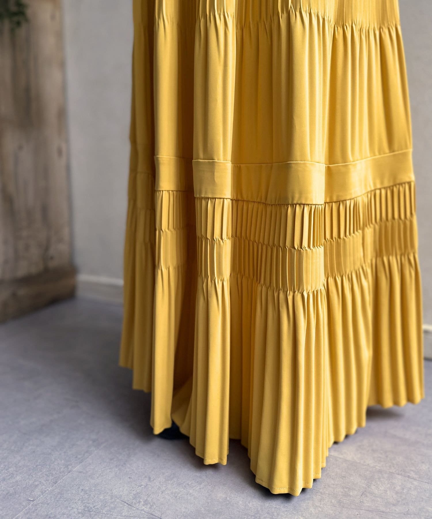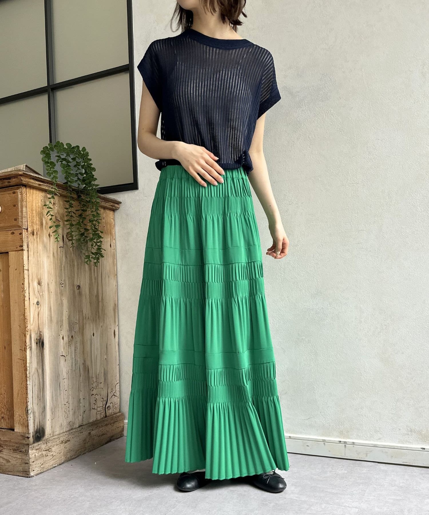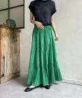 繊細なプリーツ加工を施すことで、たっぷりと生地を使っていながらも広がりすぎず、縦のラインをすっきりと見せてくれるのが嬉しいポイント。
