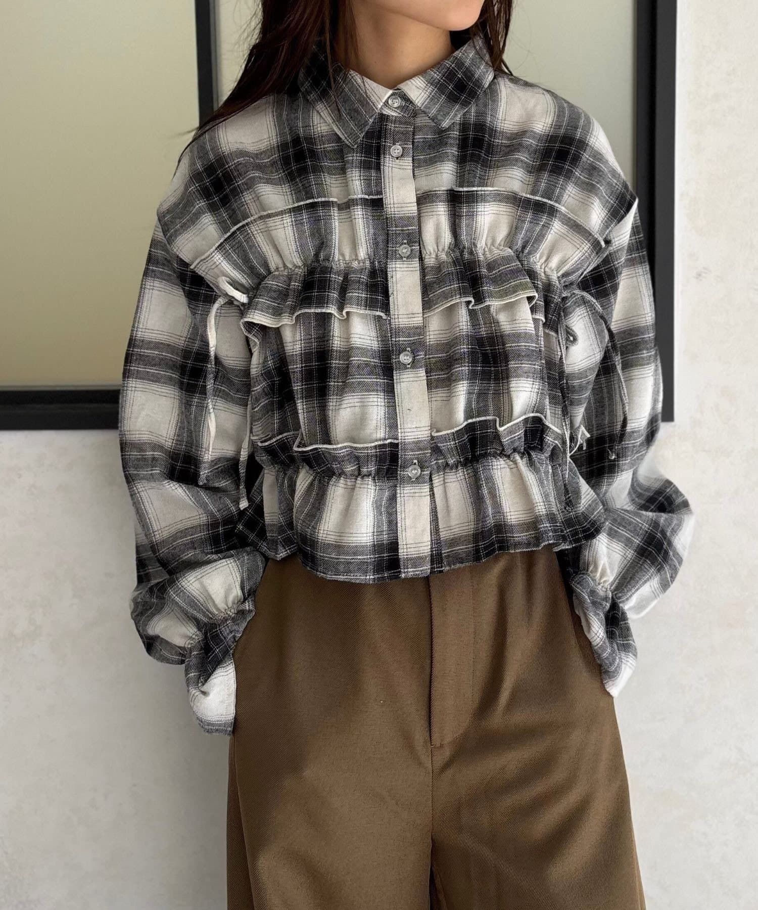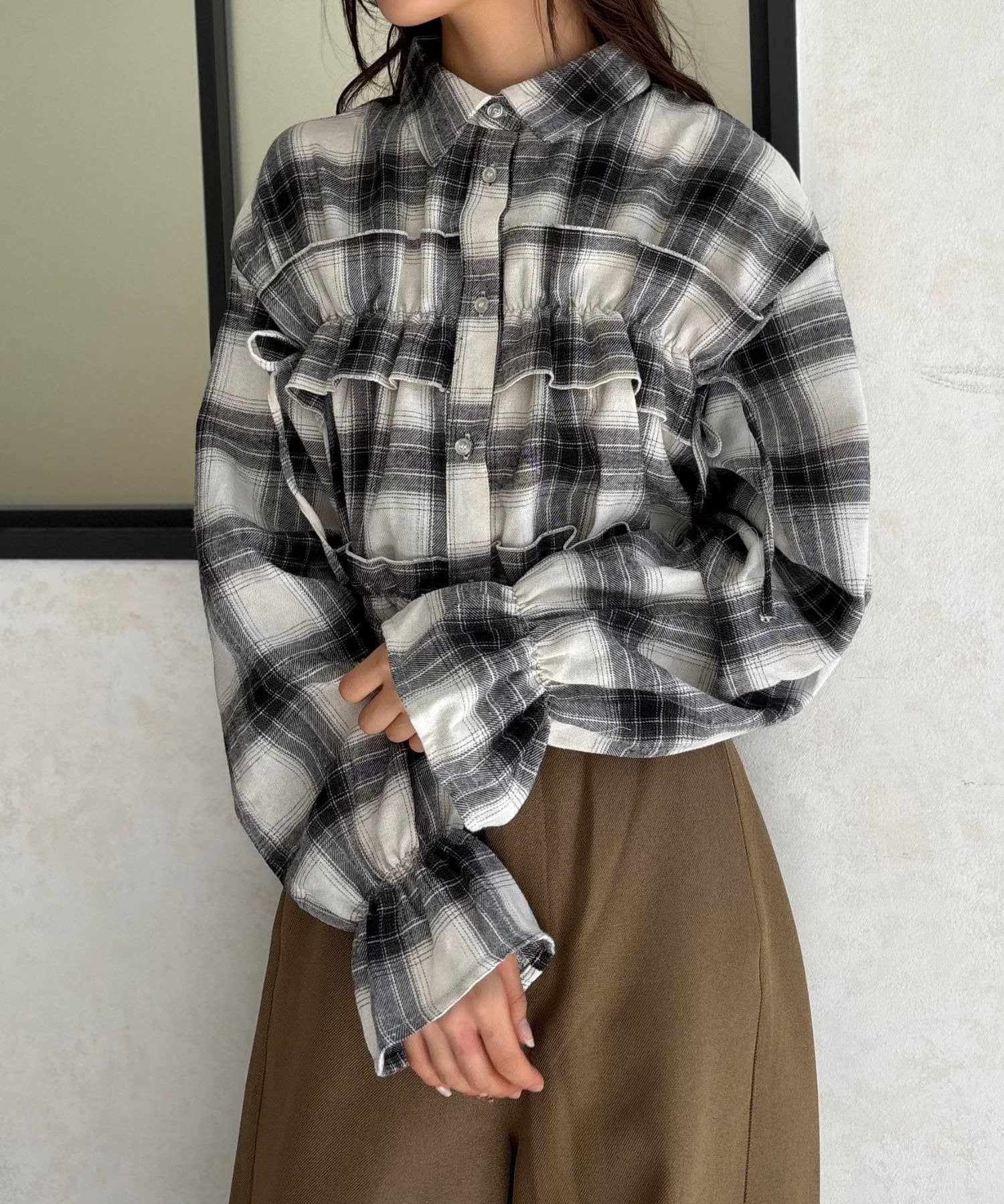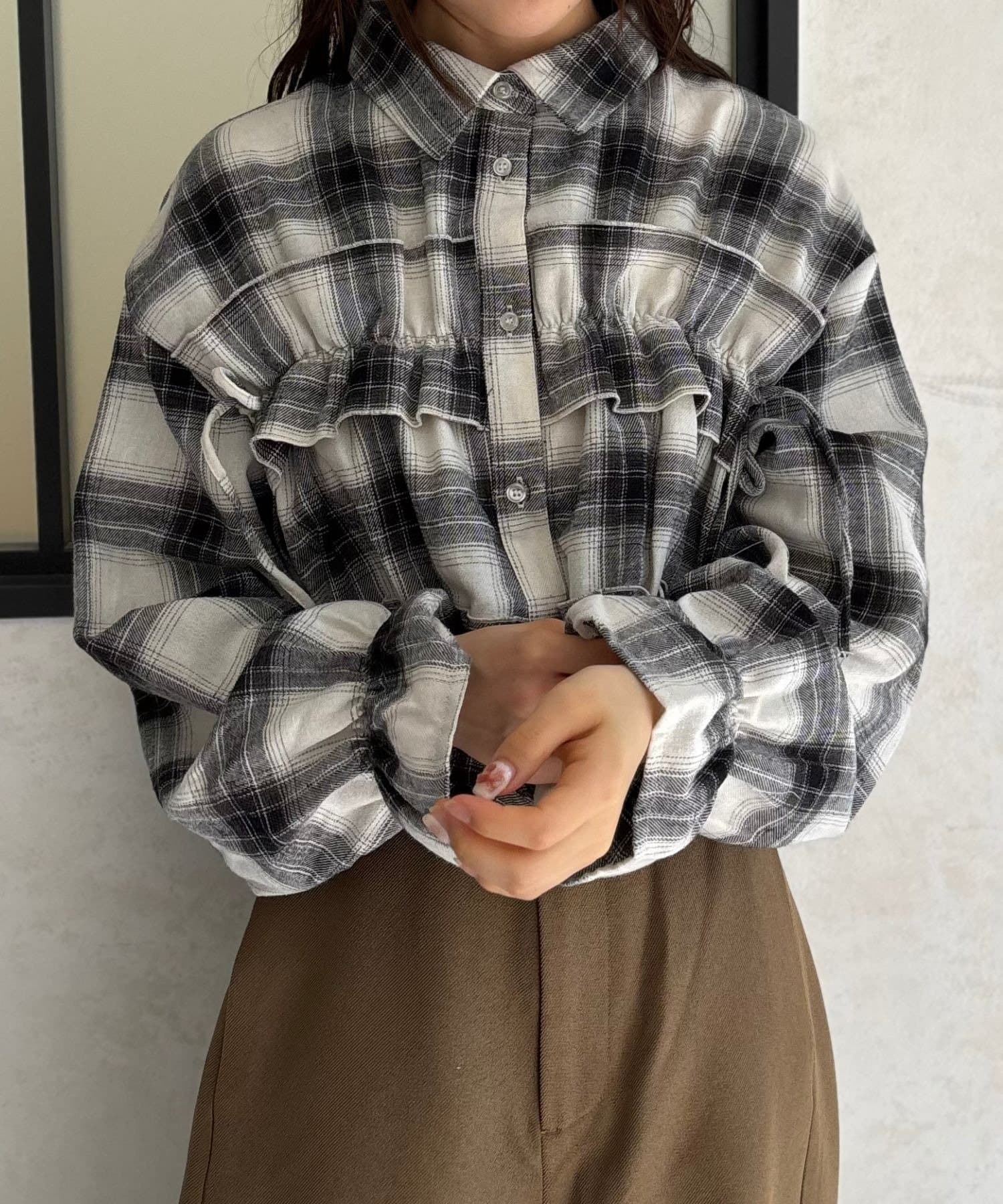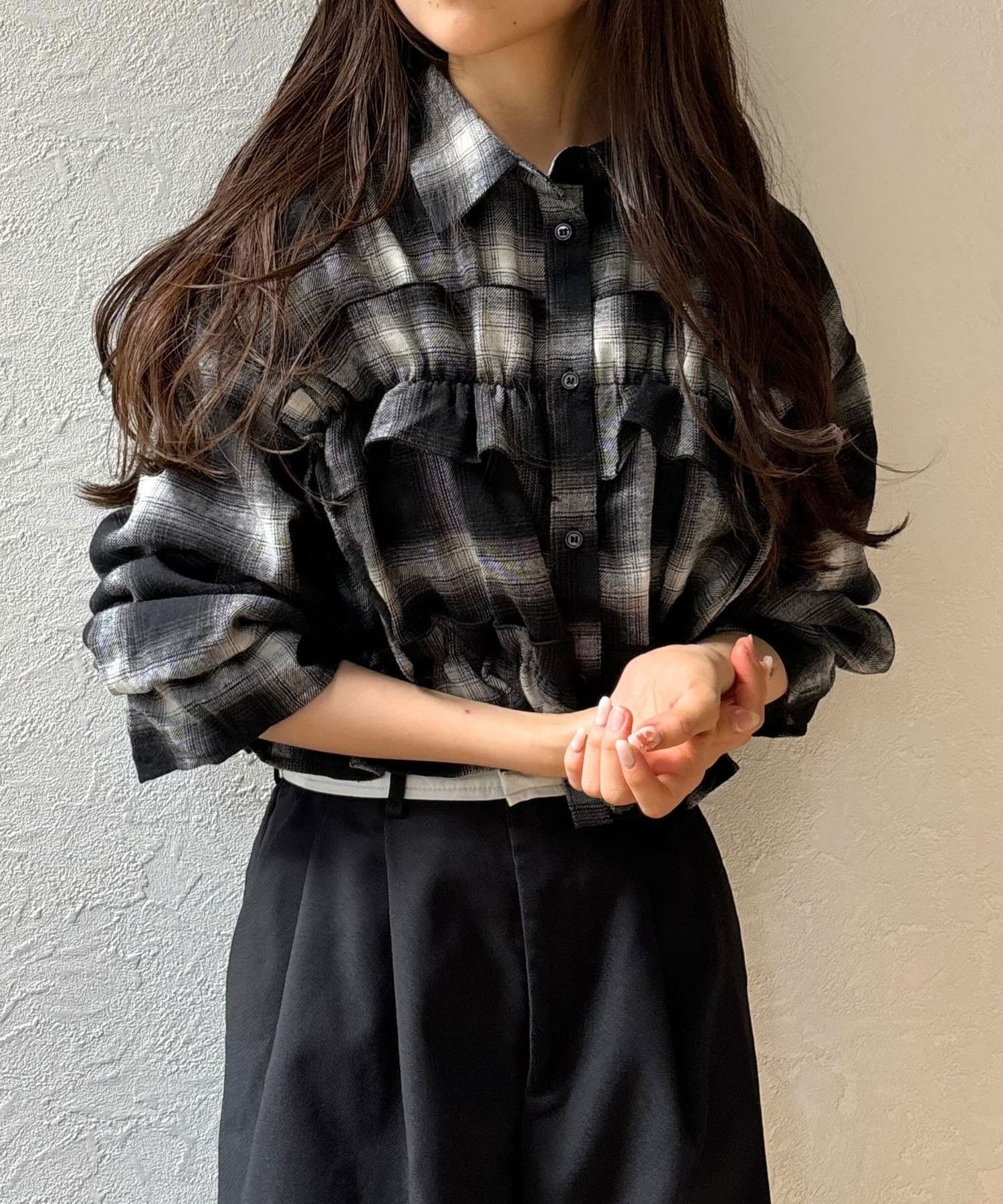 胸元のフリルは、さりげなく体型カバーも叶えてくれる優秀デザイン。