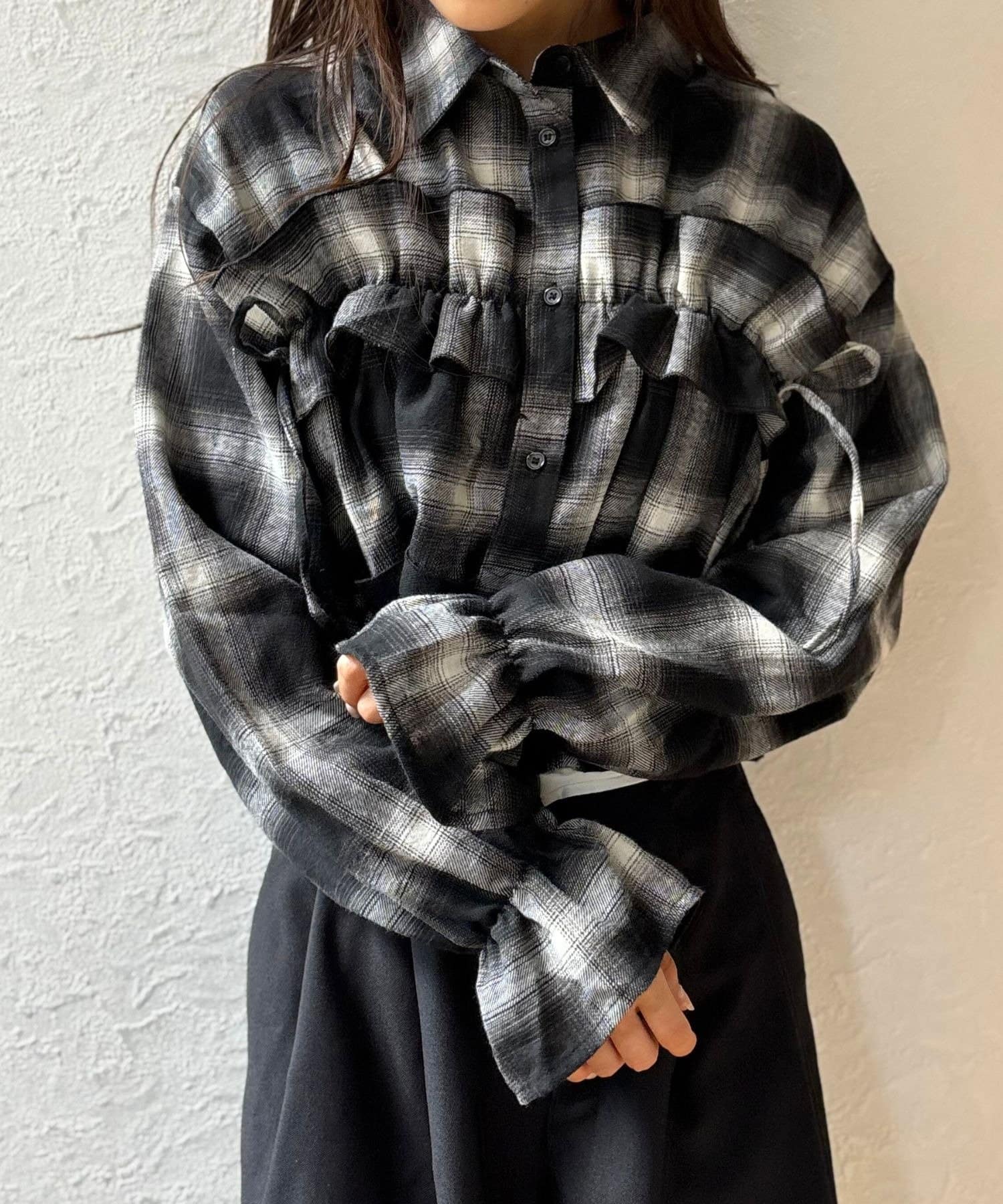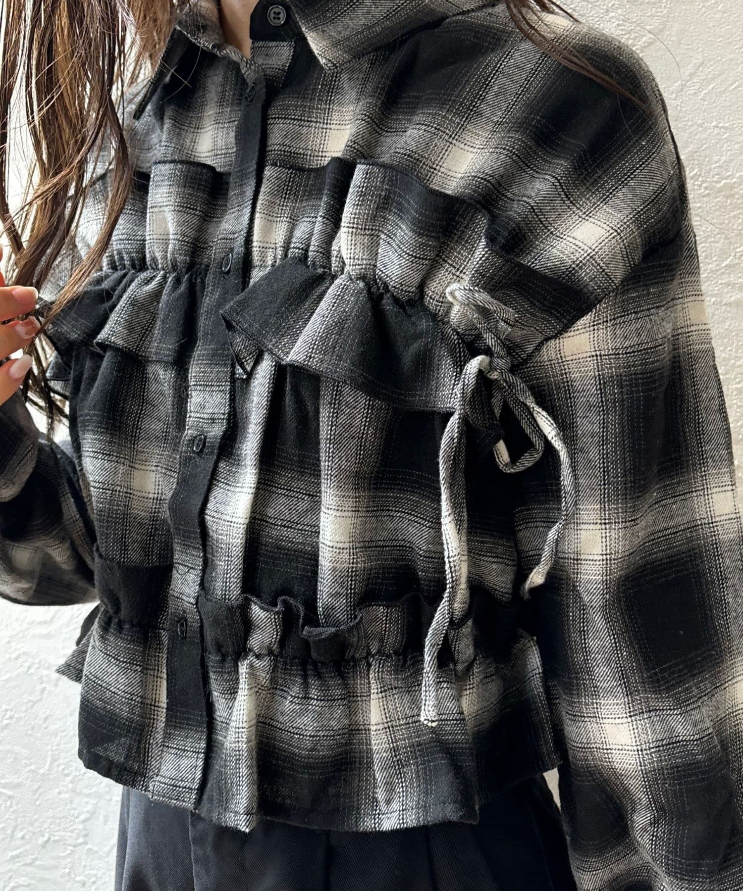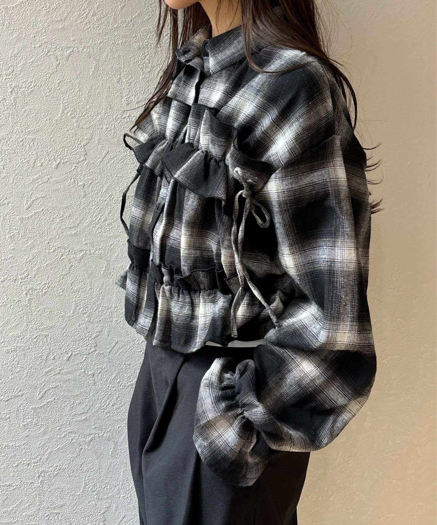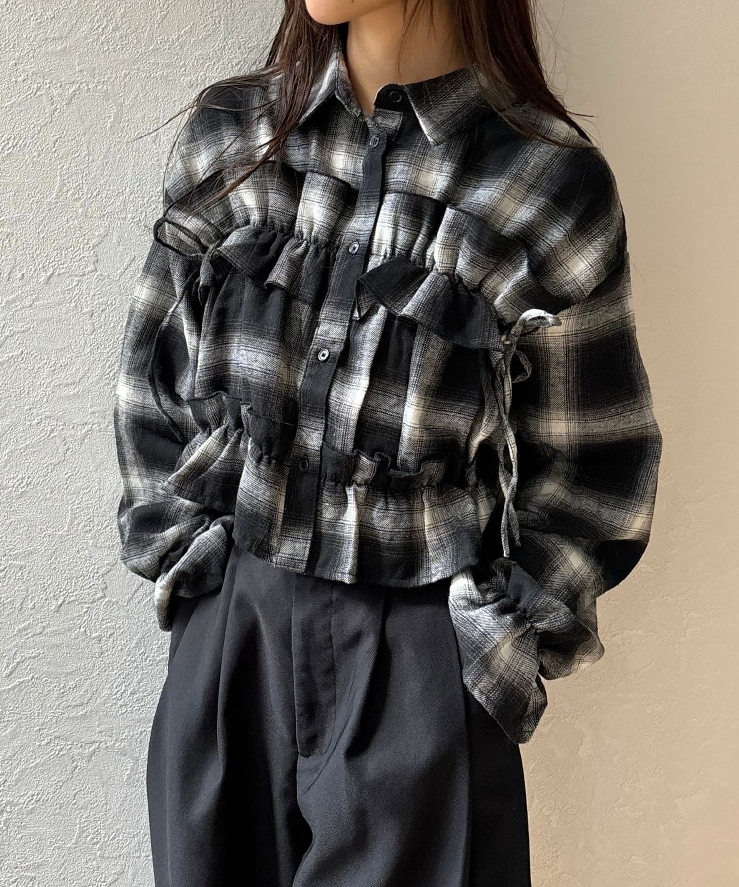 胸元のフリルは、さりげなく体型カバーも叶えてくれる優秀デザイン。