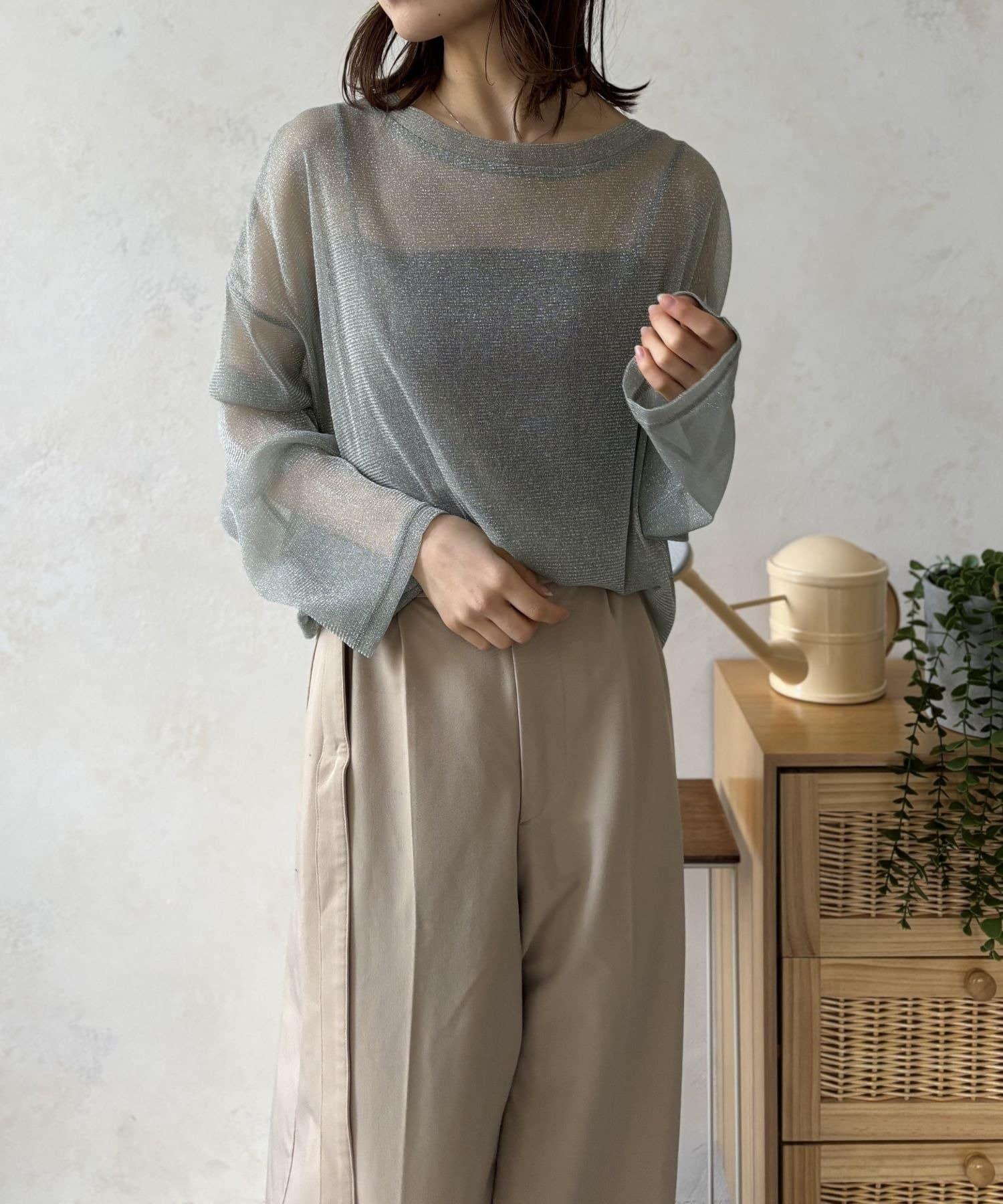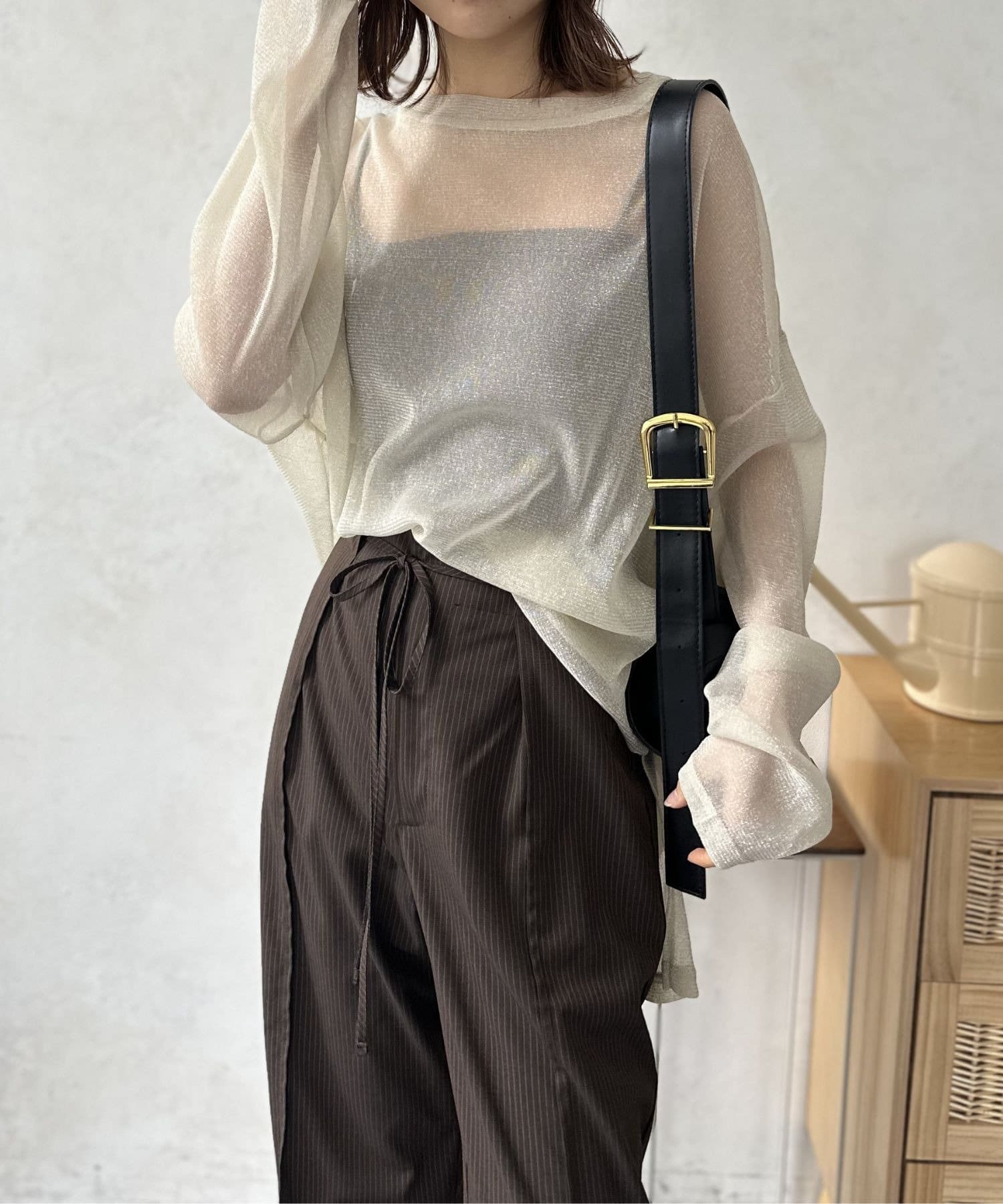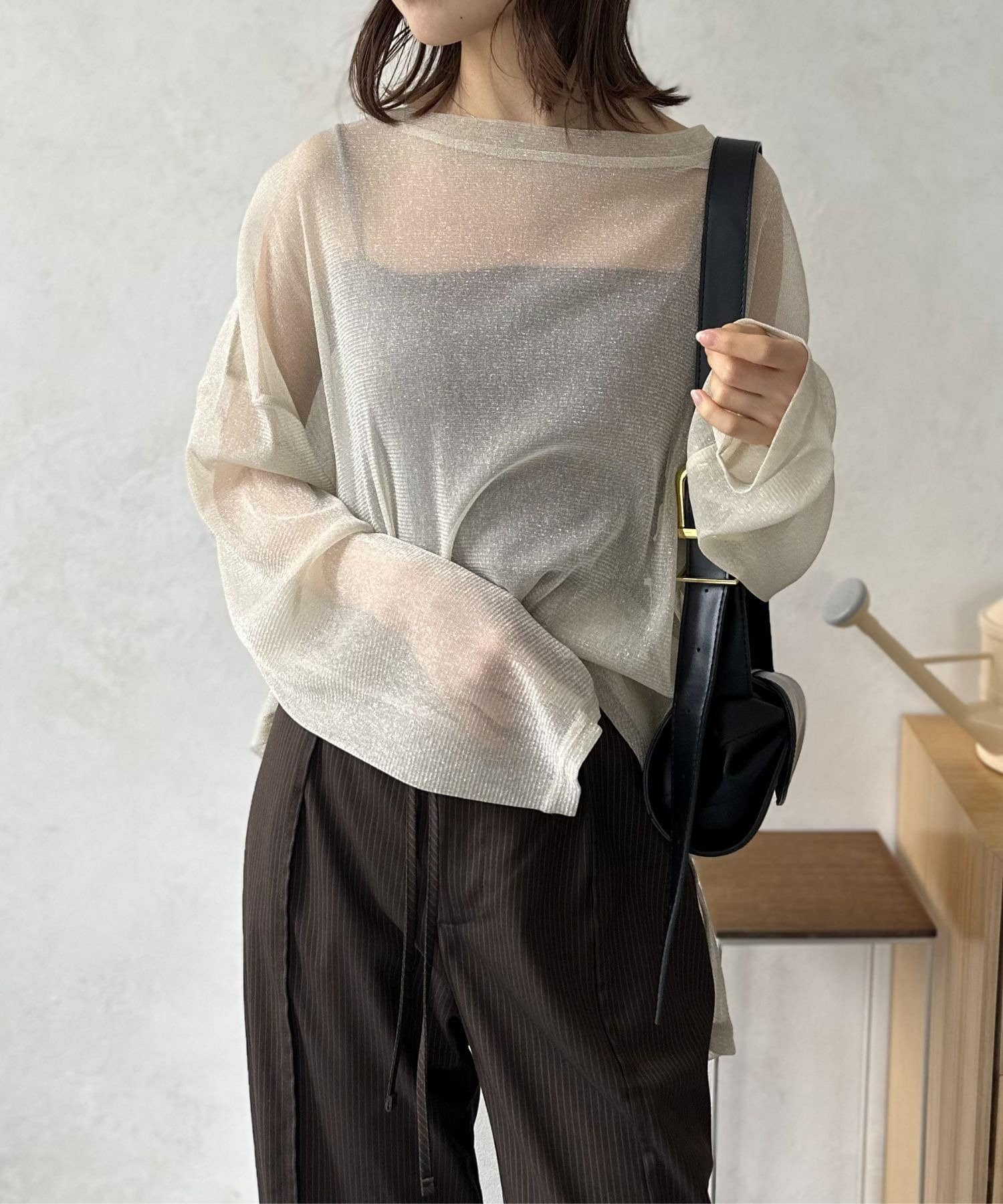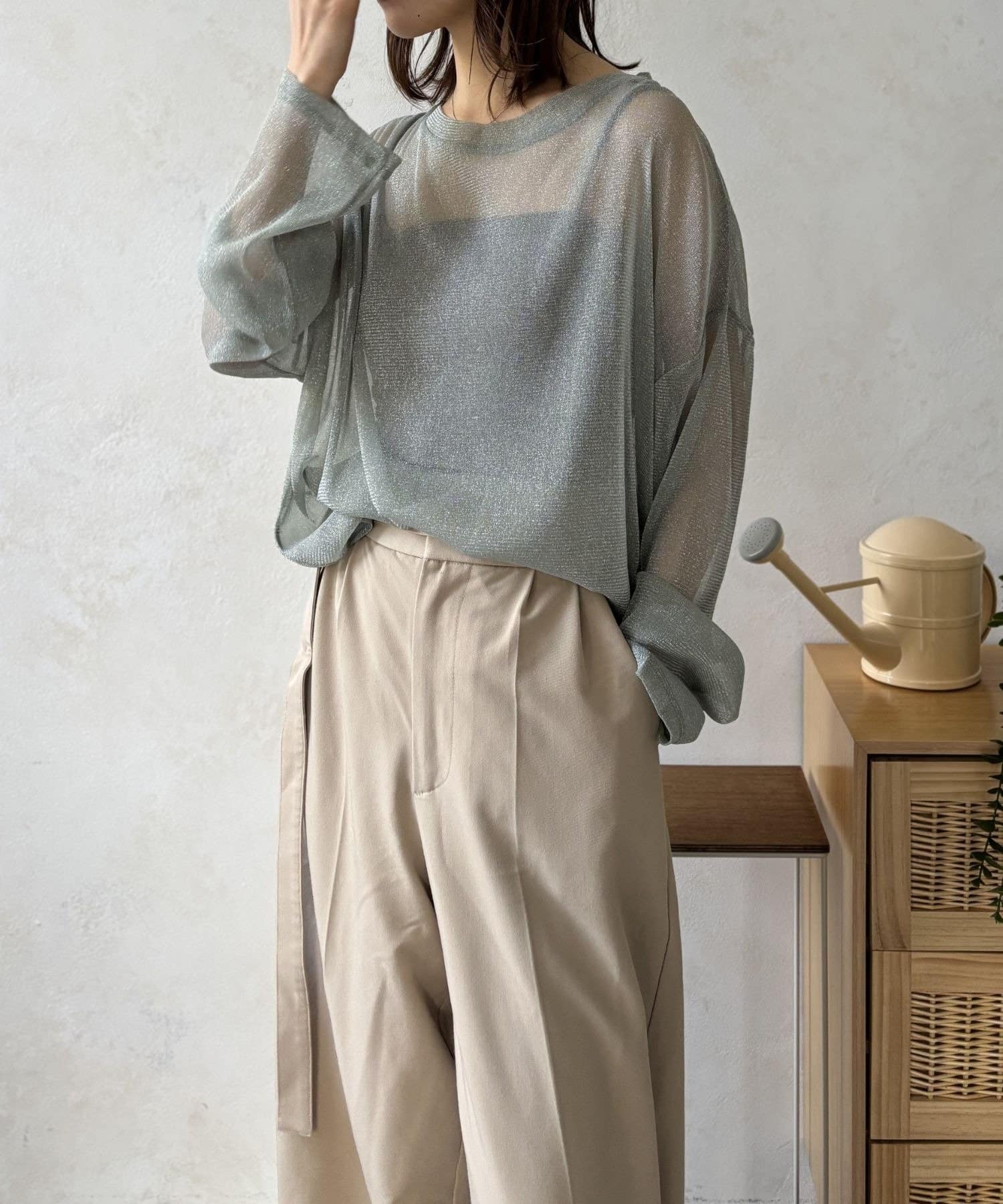 軽やかなシアー素材は、見た目にも涼しげで、ヘルシーな肌見せスタイルを叶えます。インナーとのレイヤード次第で色々なコーディネートが楽しめるのも魅力の一つ。
