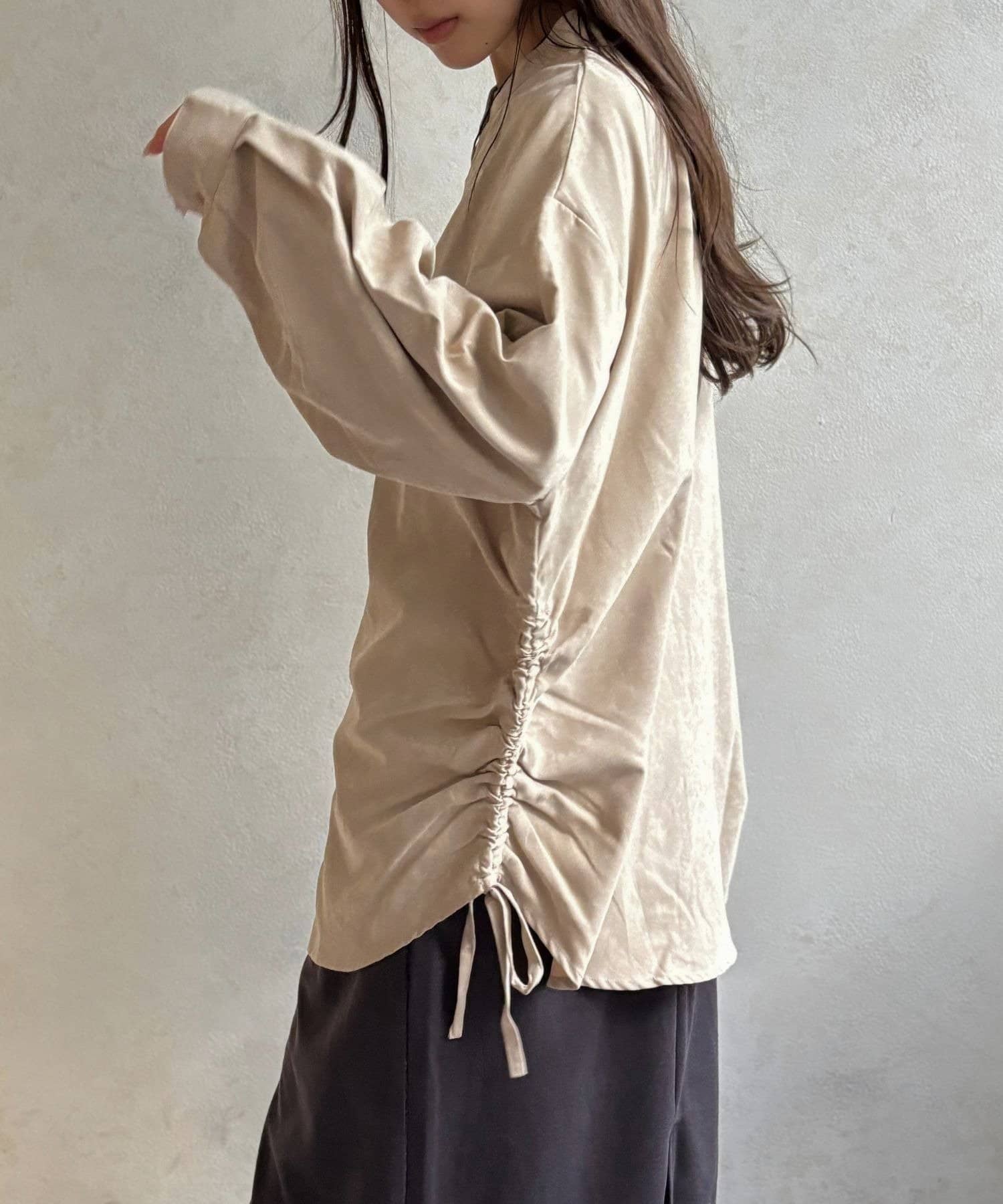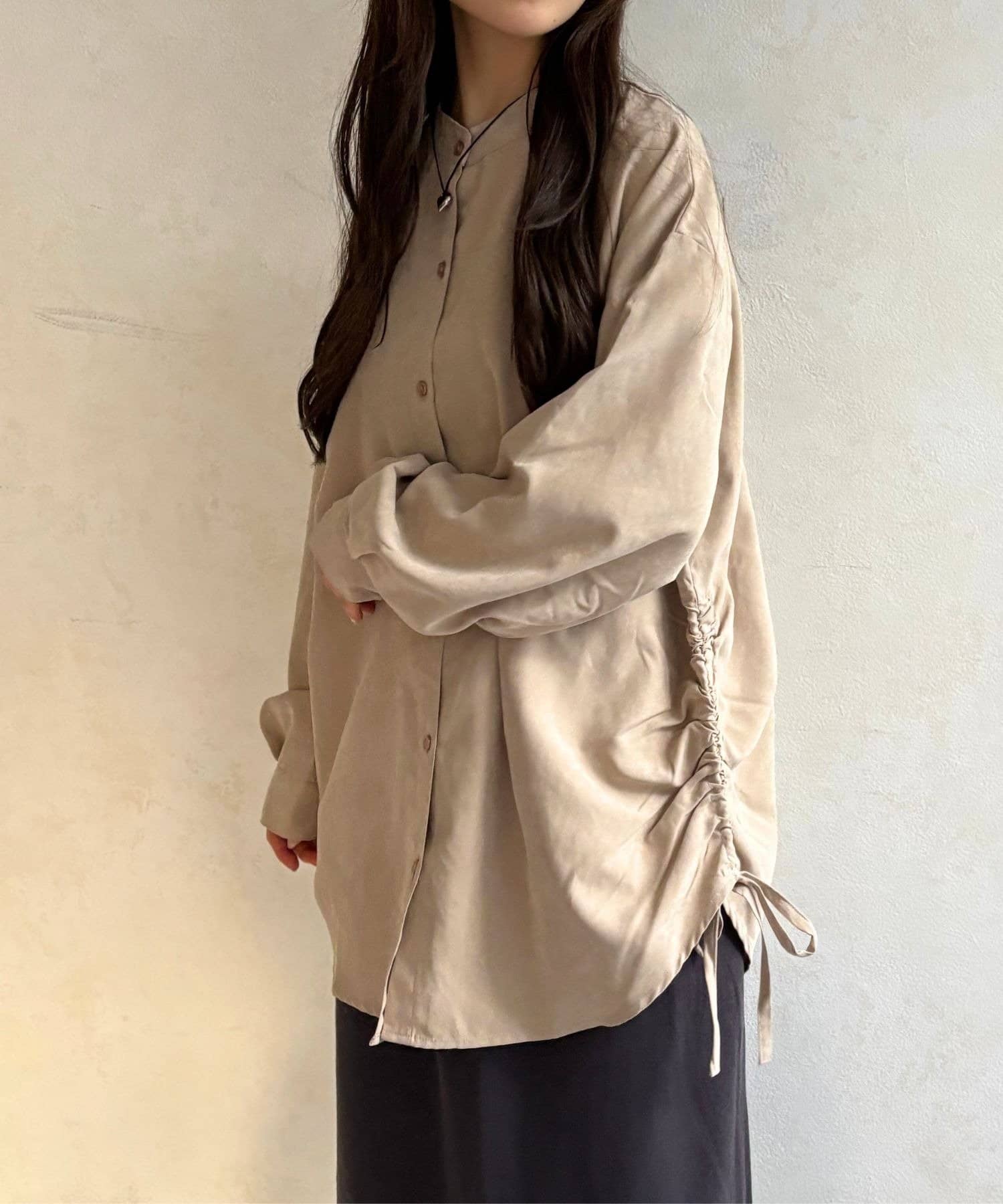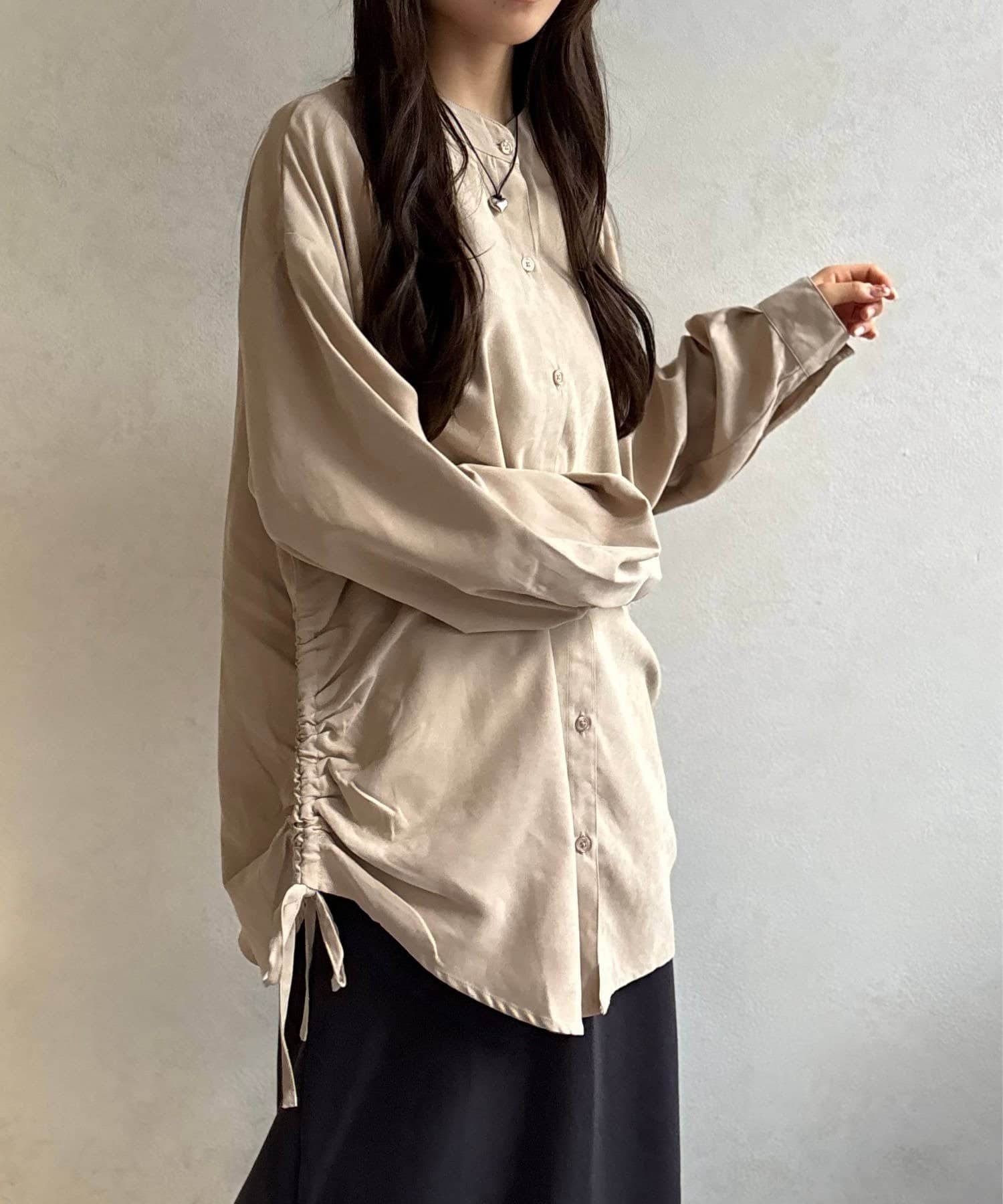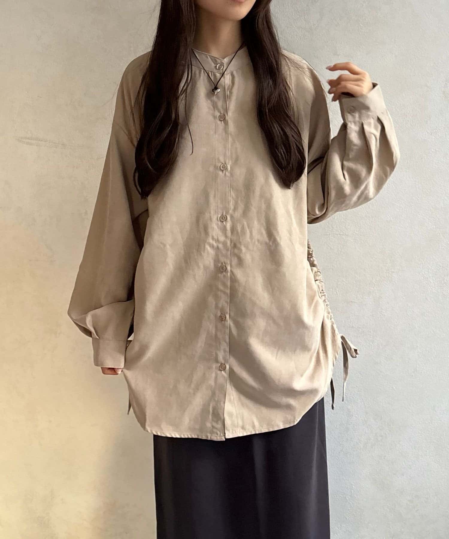 シンプルなシャツにプラスされたシャーリングが、コーデにほどよいアクセントを加えてくれます。