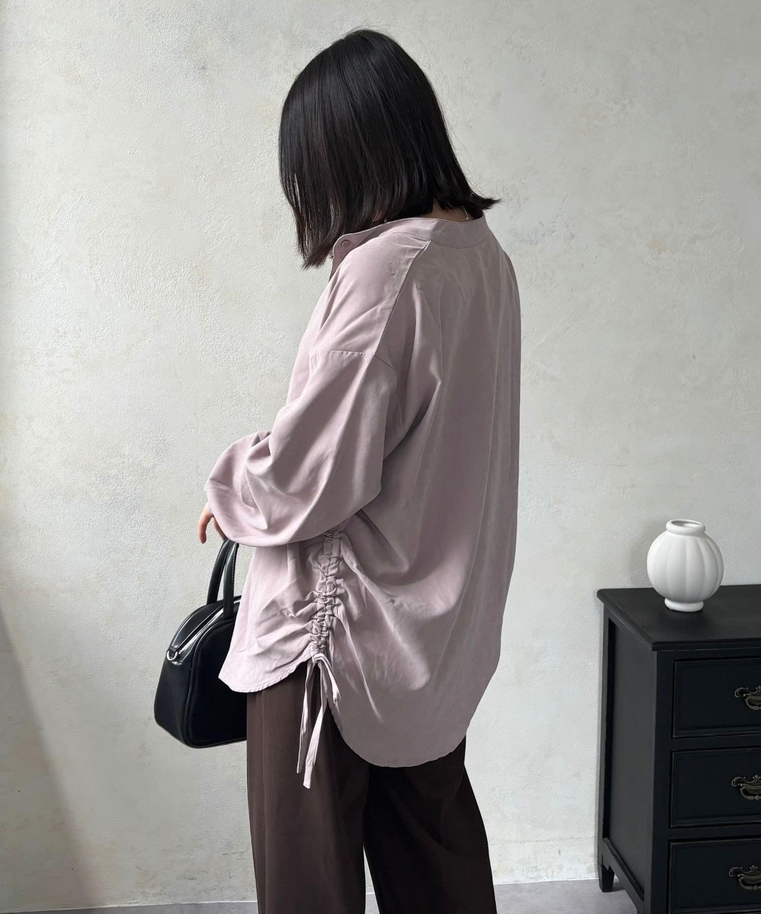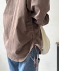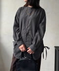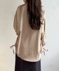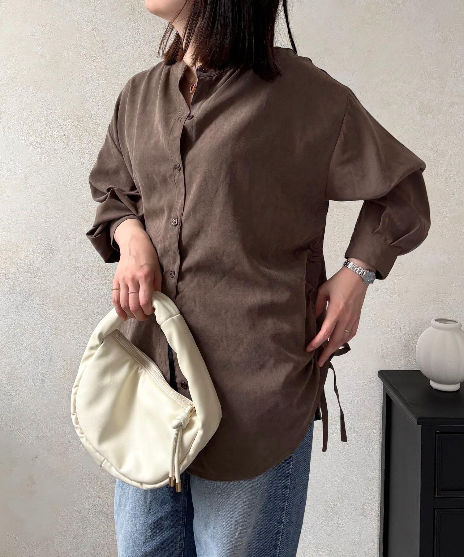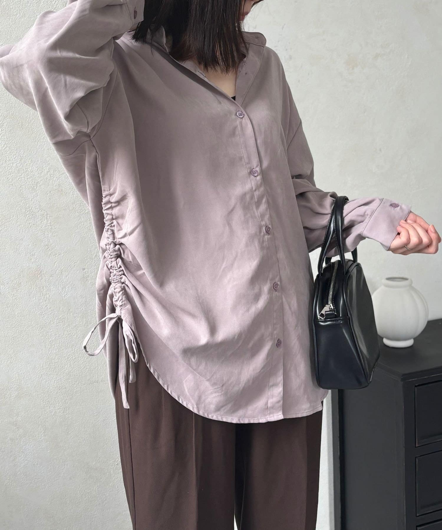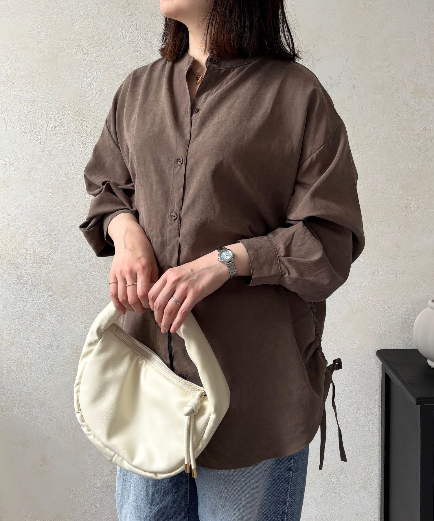 シンプルなシャツにプラスされたシャーリングが、コーデにほどよいアクセントを加えてくれます。