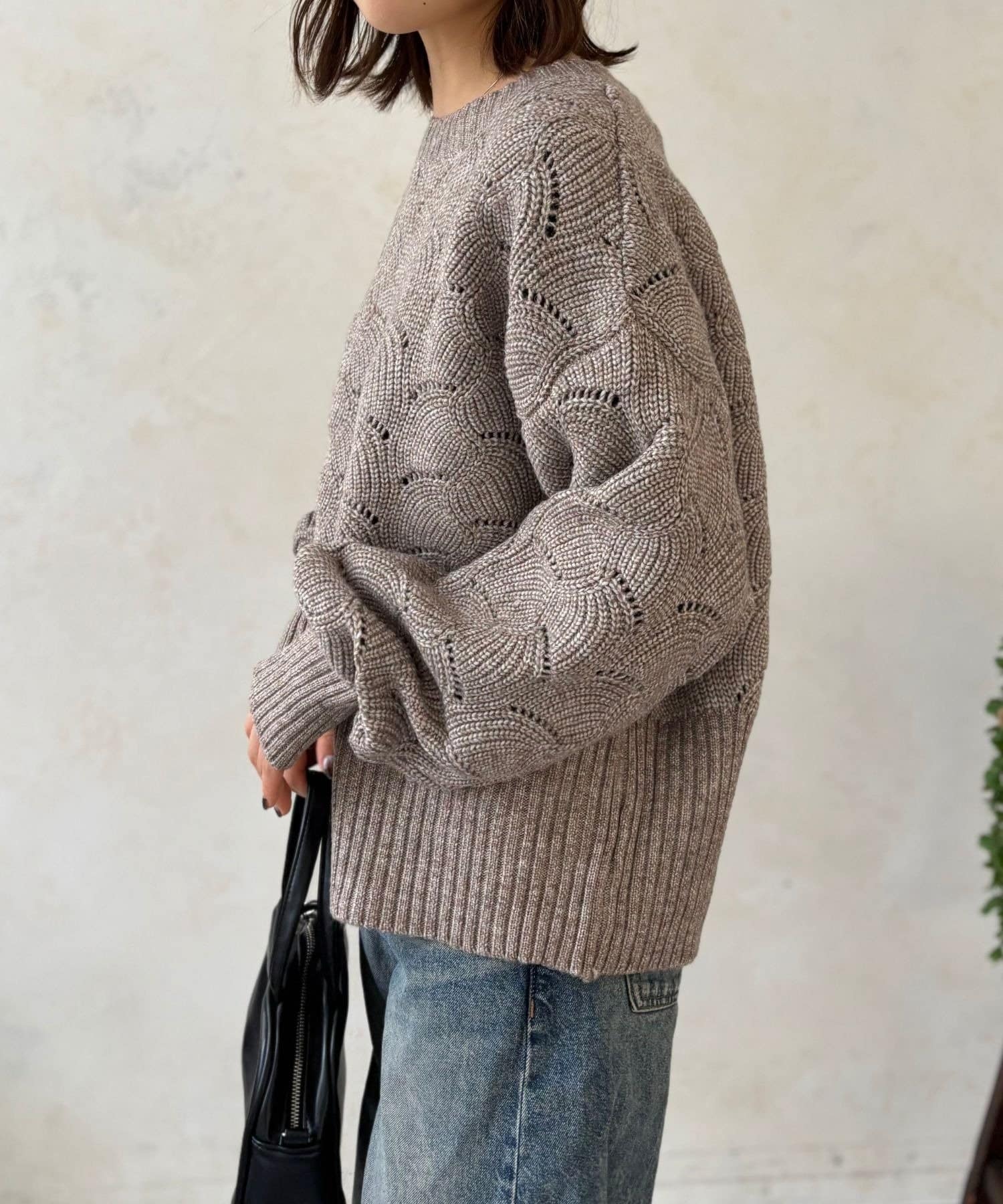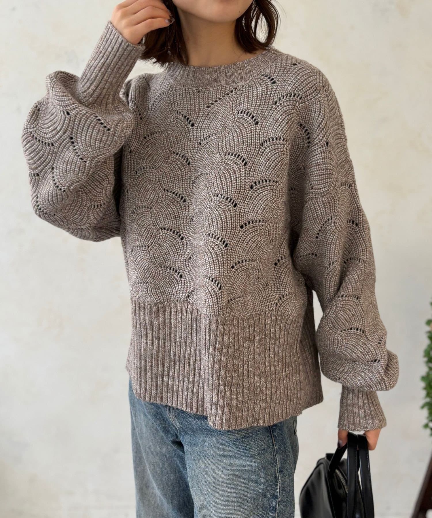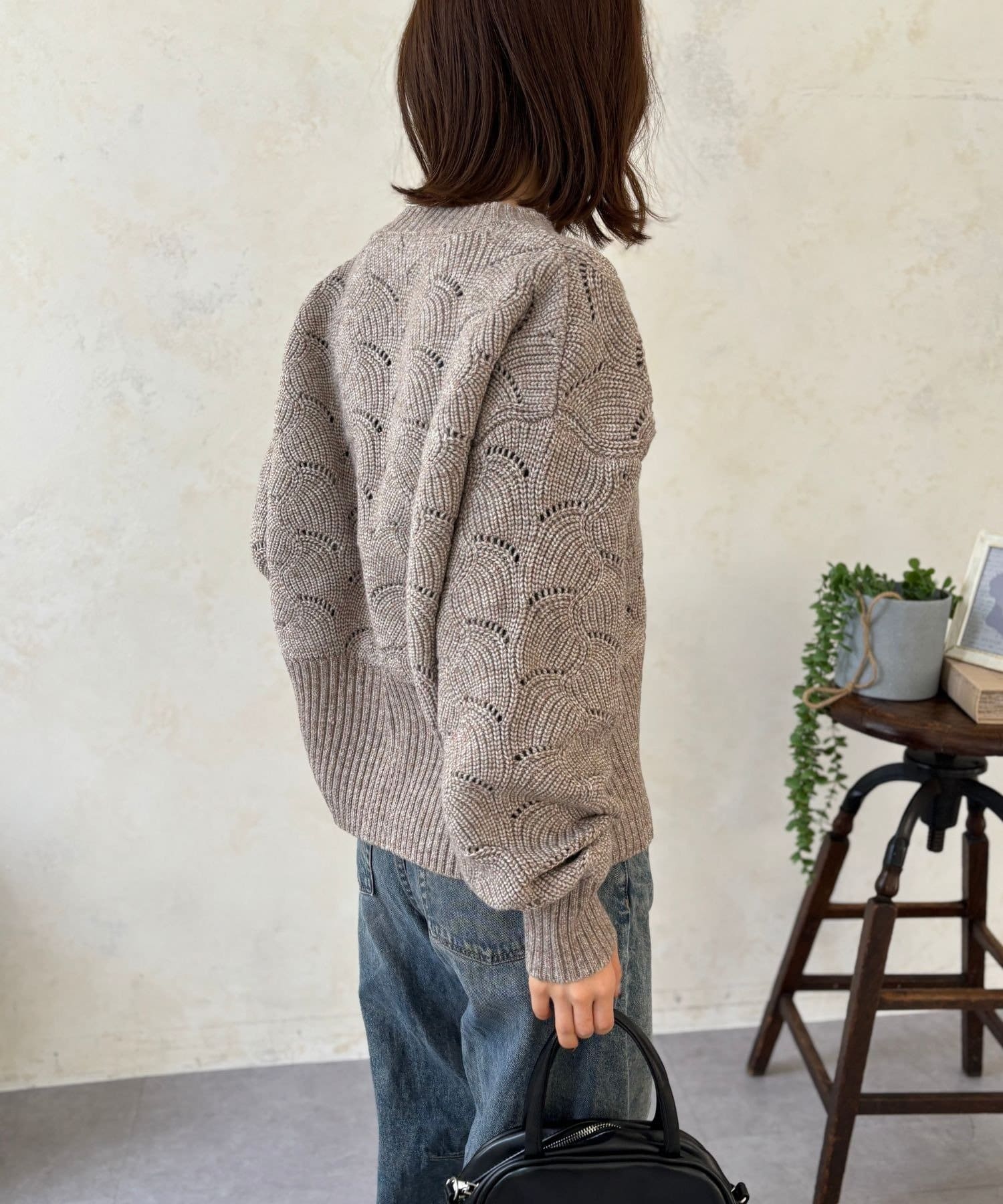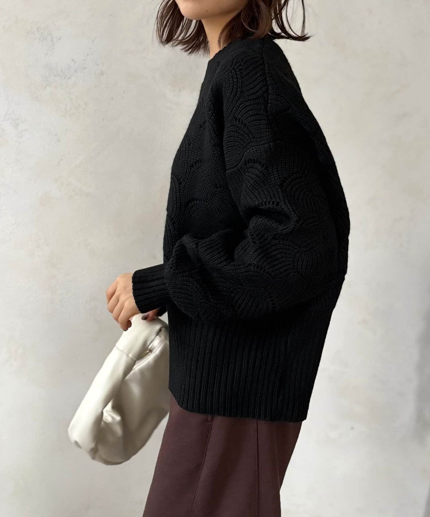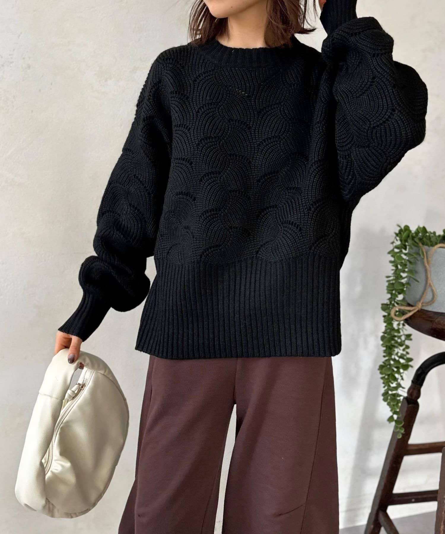 目を惹く繊細な透かし編み模様が、シンプルながらも女性らしい印象を与えます。