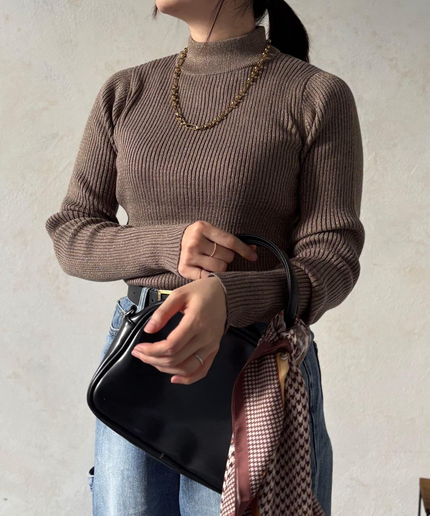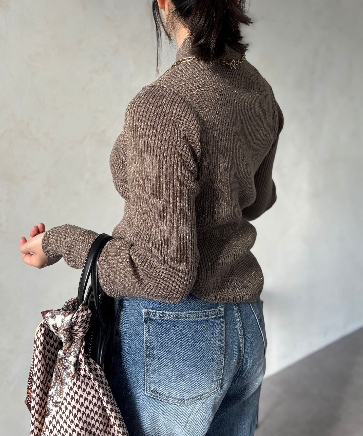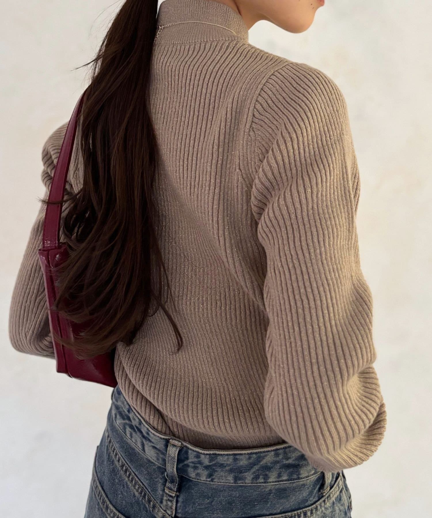 カジュアルなのにどこか特別感のある、繊細なラメが上品なラメリブトップス