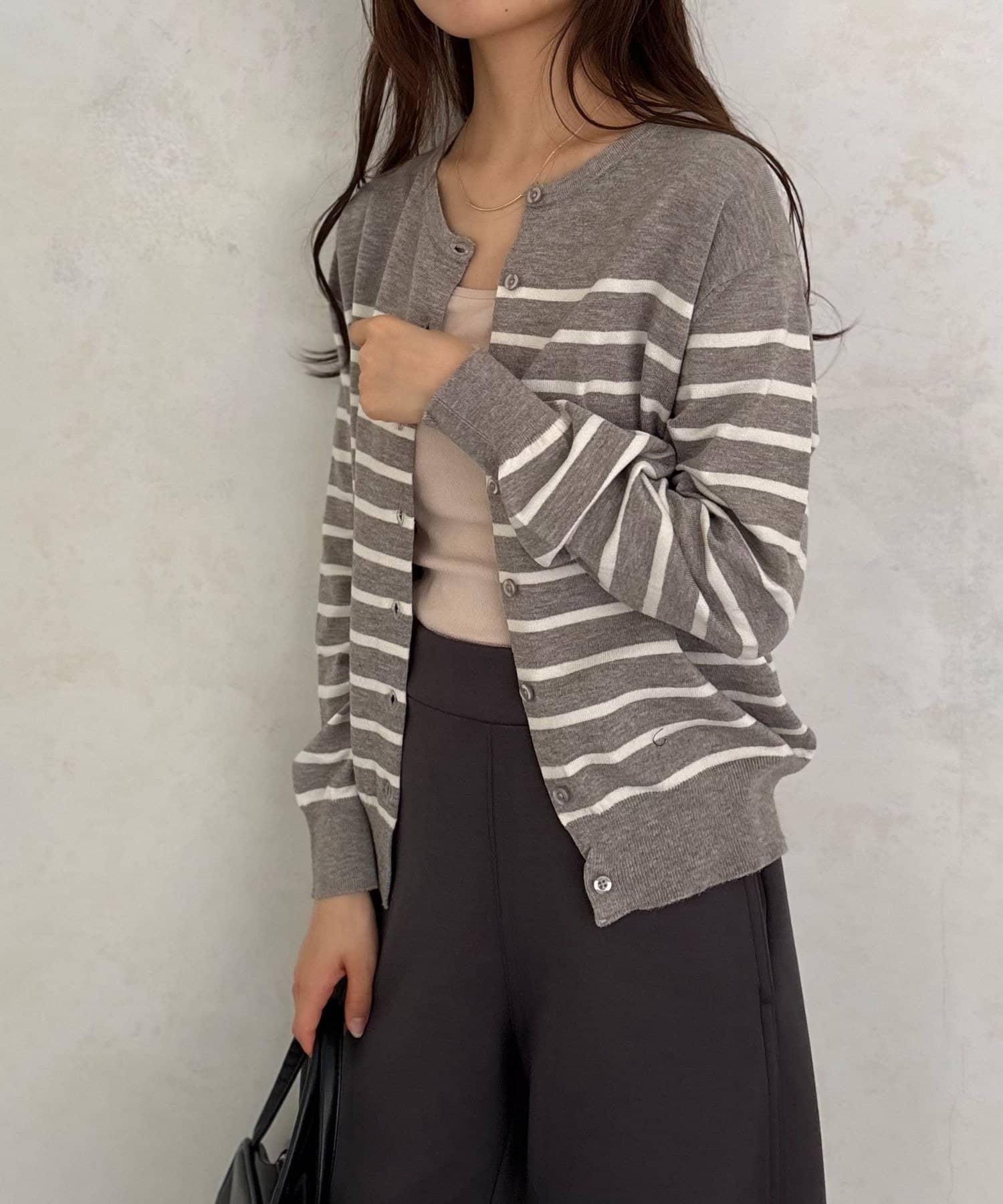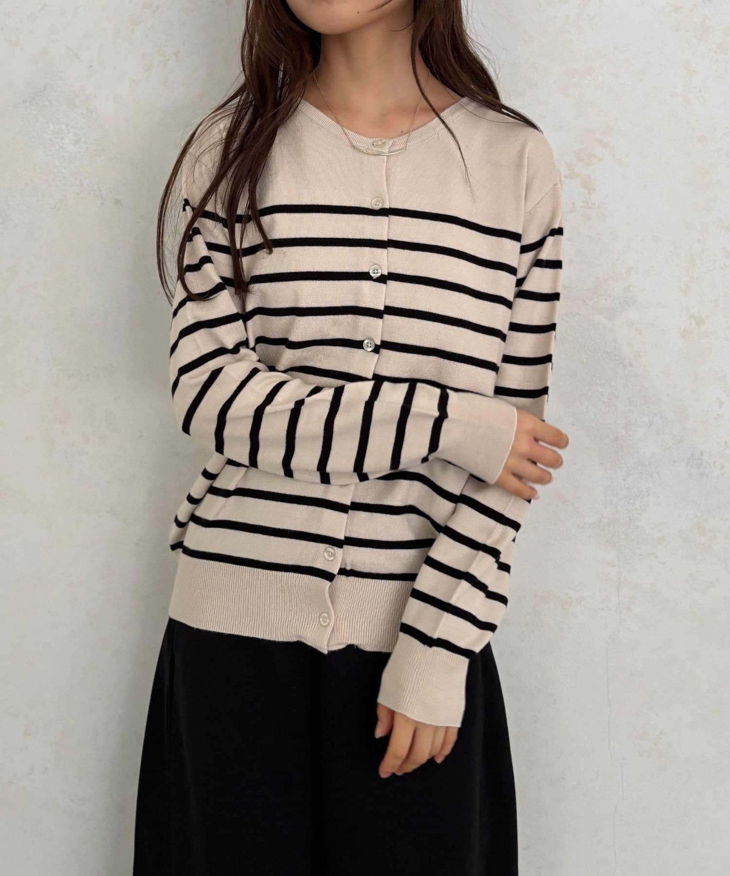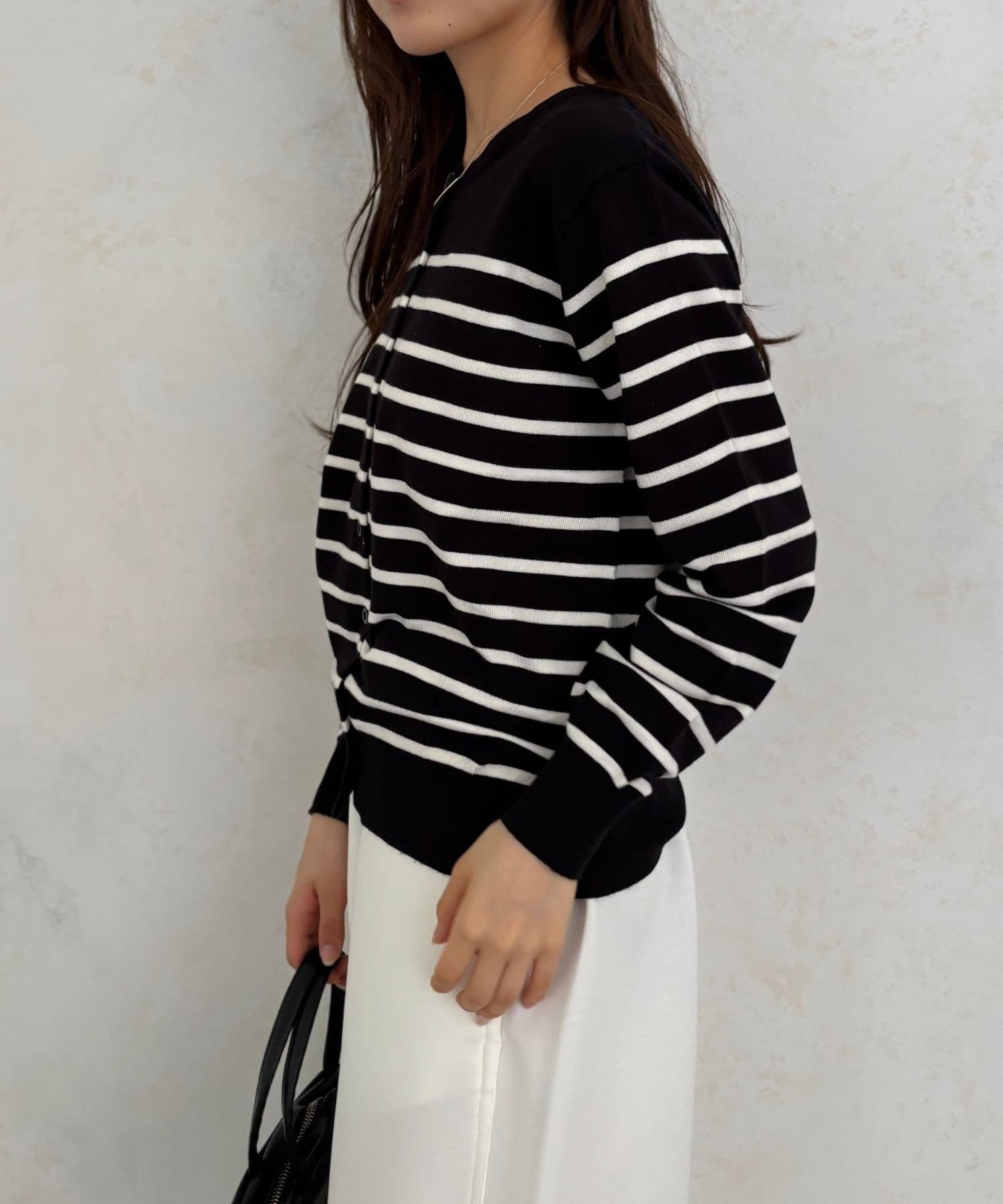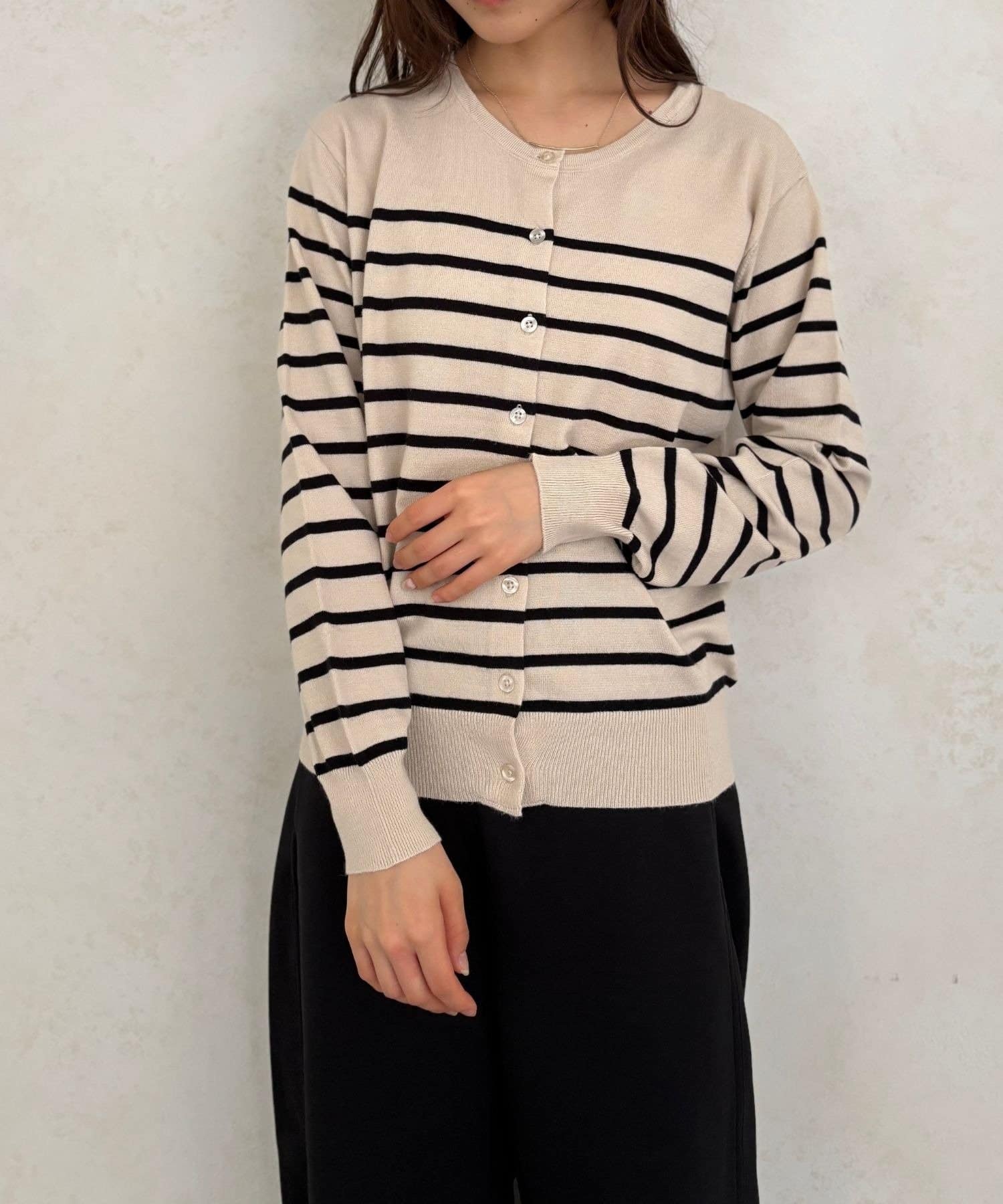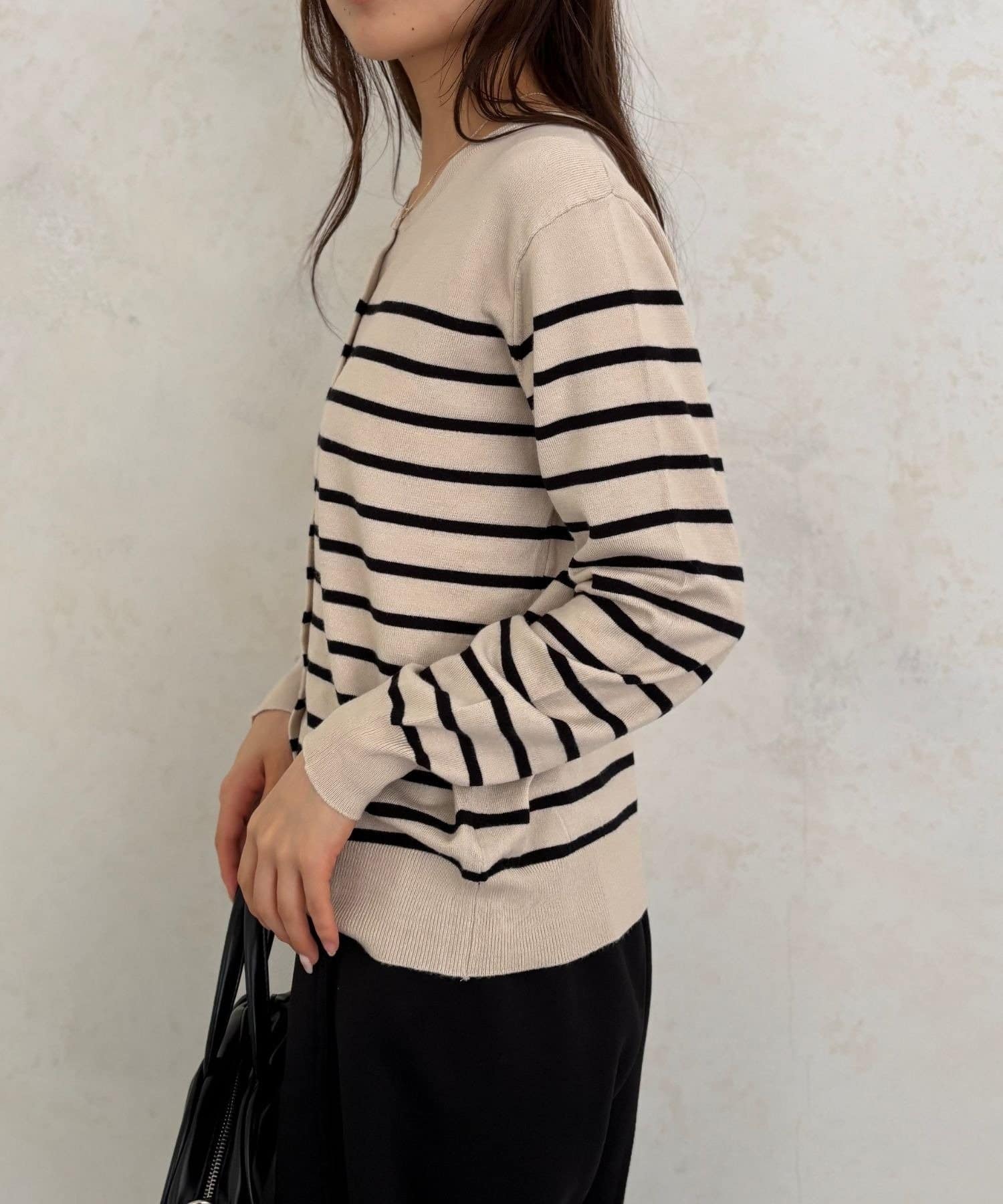 カジュアルになりすぎず、洗練された大人の女性らしさを引き立てる ボーダーニットカーディガン