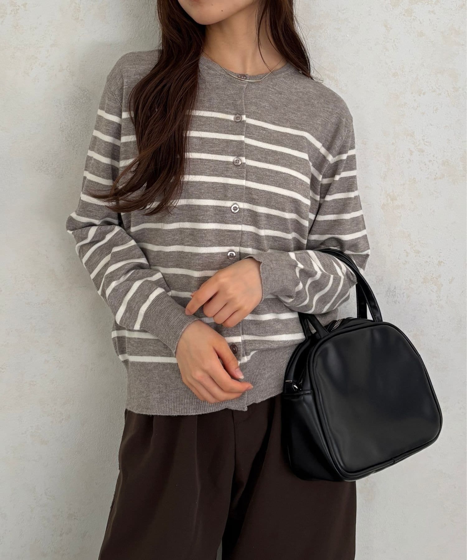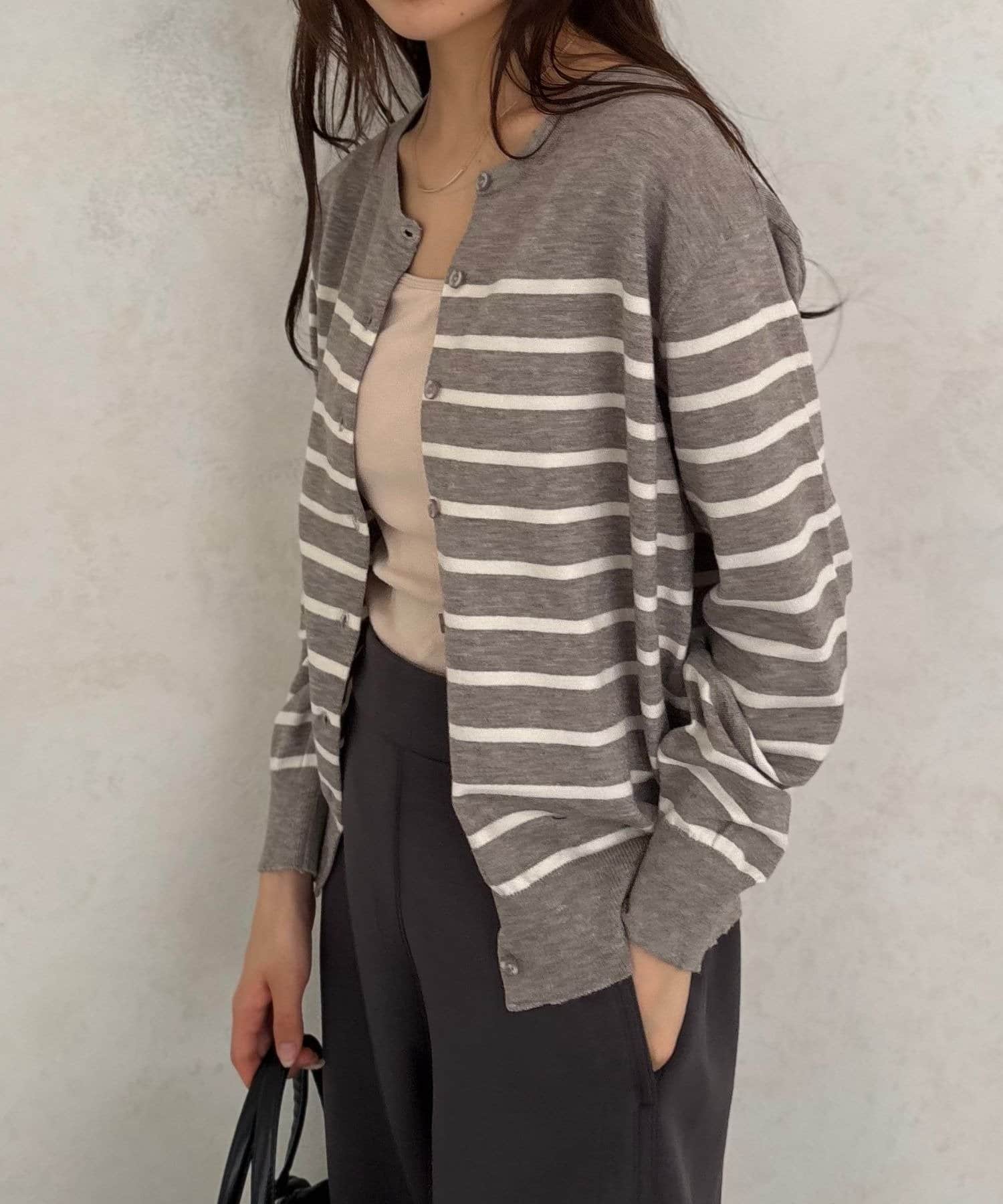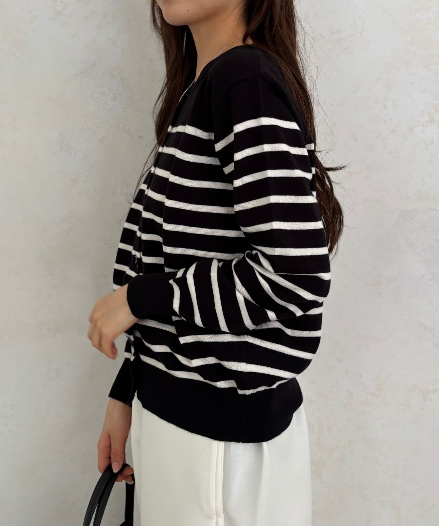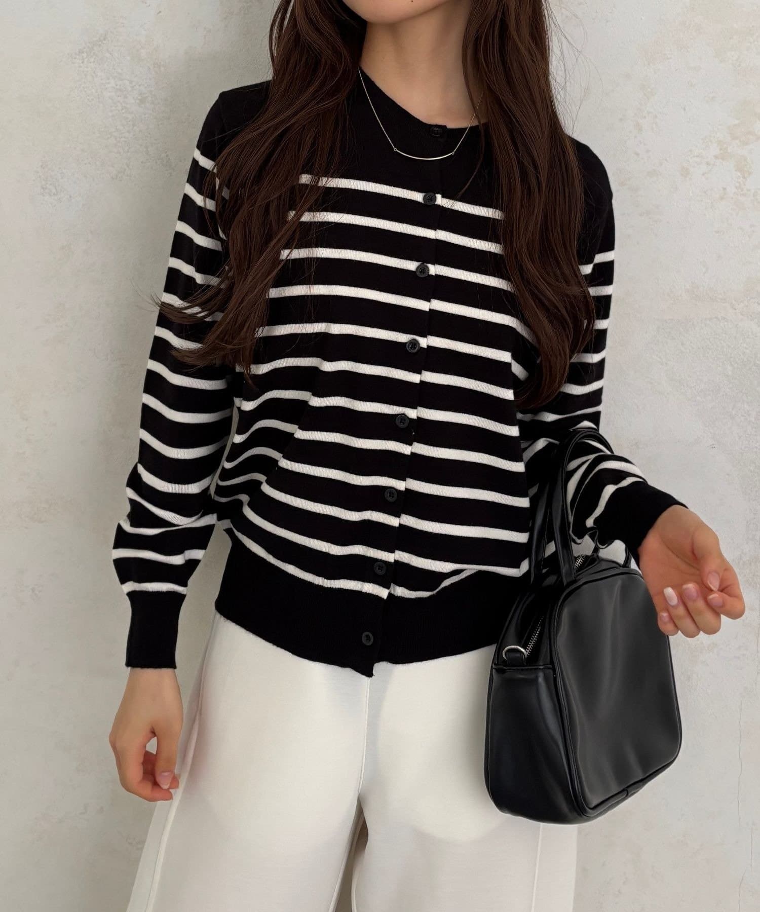 カジュアルになりすぎず、洗練された大人の女性らしさを引き立てる ボーダーニットカーディガン