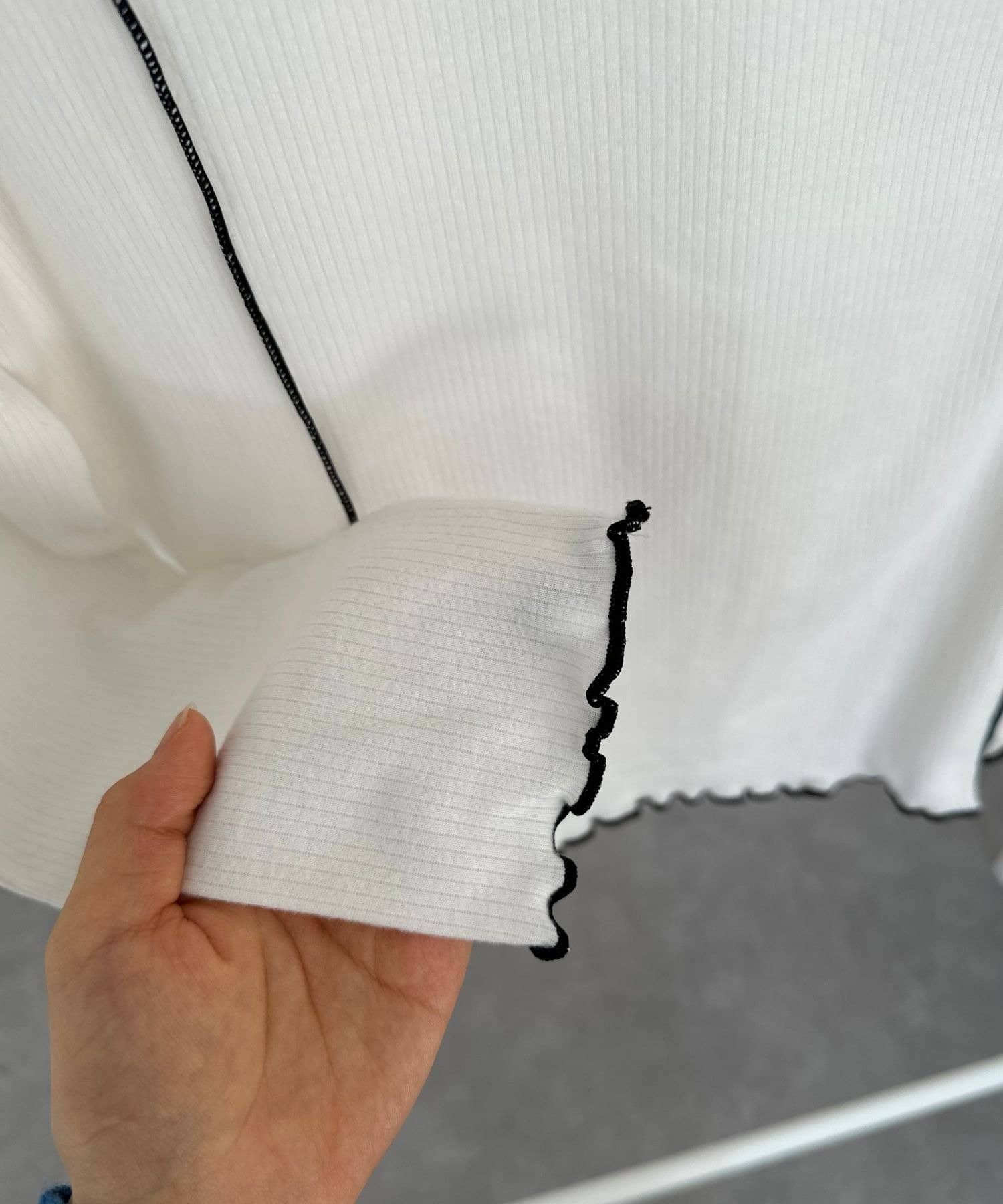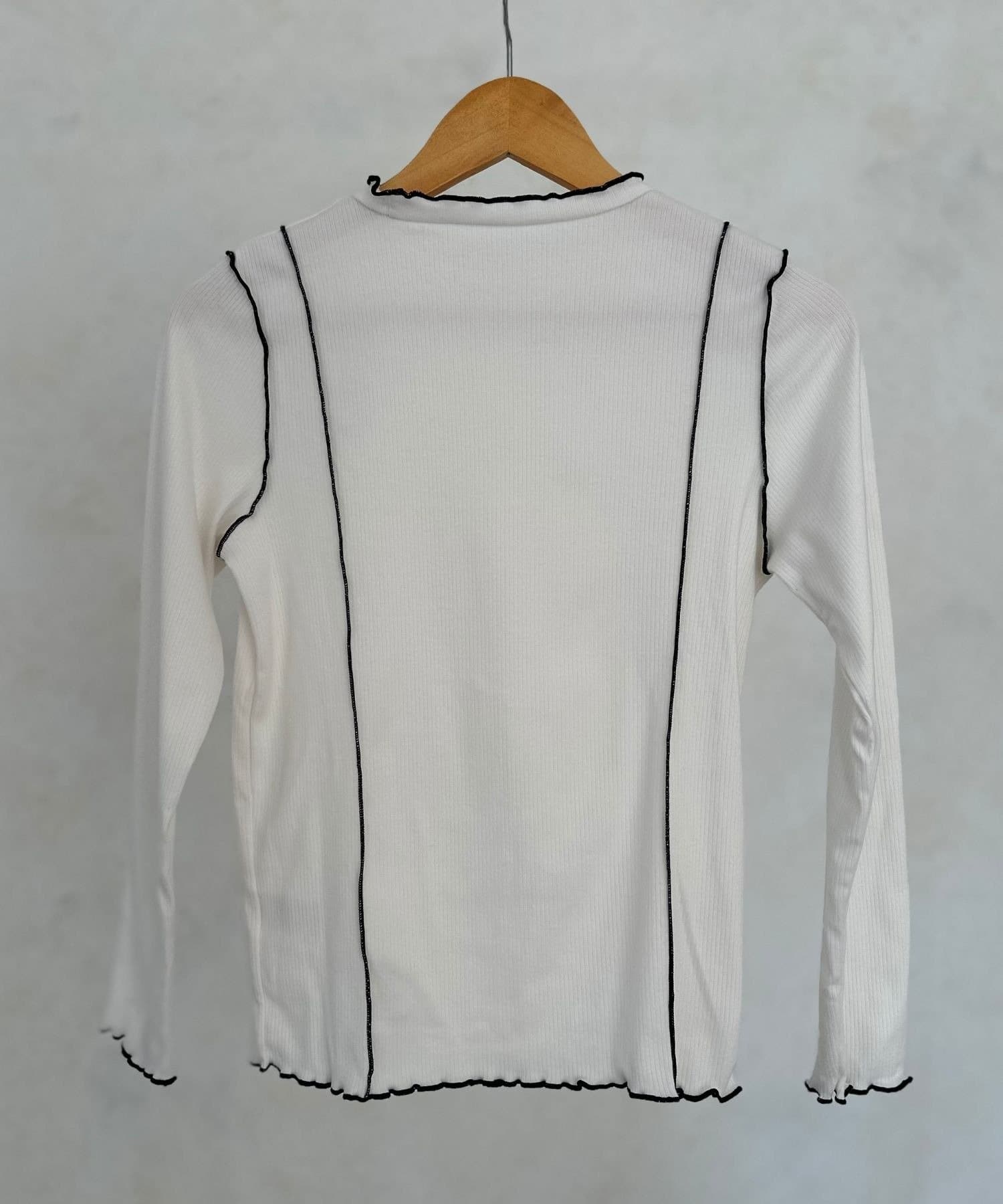 ネックラインと袖口、裾にあしらわれたメローフリルが、女性らしさを演出。さりげない可愛さをプラスします。